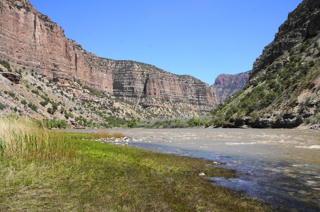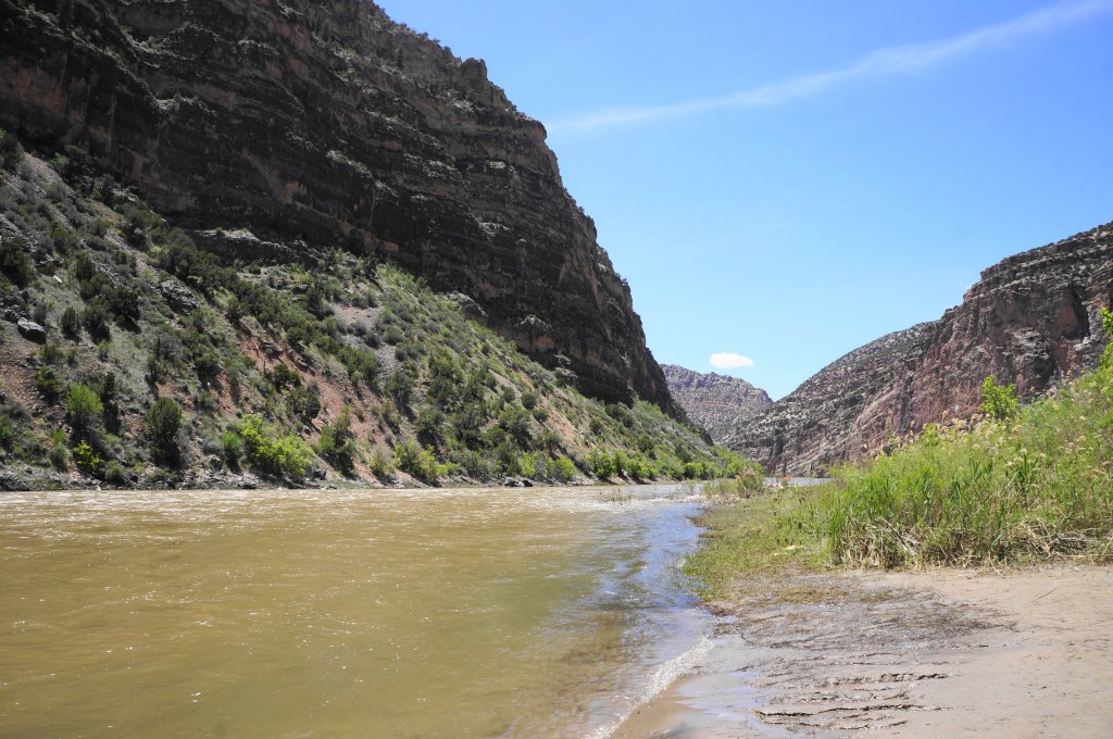From the shore, one can see upstream (left) through Whirlpool Canyon to the Colorado state line and beyond. Tucked around the corner, out of view, is the famous Steamboat Rock and Echo Park area. Downstream (right), the fast-flowing river heads toward Island Park and the main Quarry area of the National Monument, although again onward views are thwarted by the high cliffs.