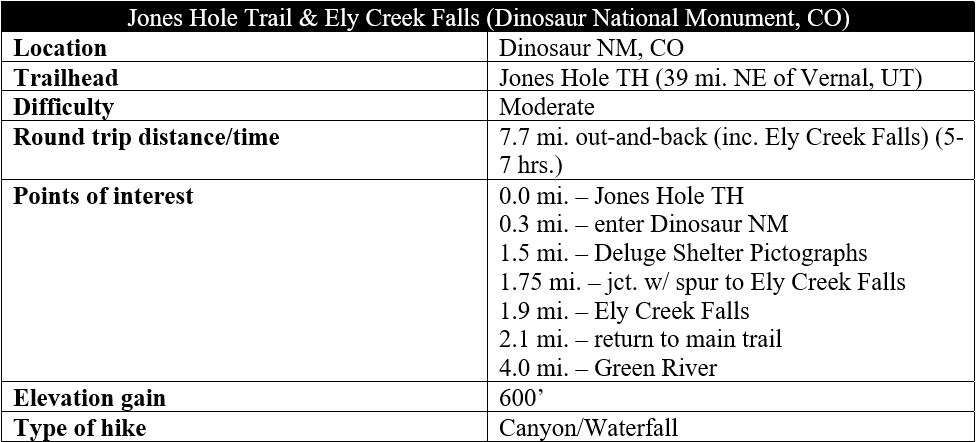 Although most famous for its prehistoric fossils, Dinosaur National Monument in northeast Utah and northwest Colorado covers more than 200,000 acres of canyon country that rivals the “Mighty Five” national parks farther south. Here the Green and Yampa Rivers—and their various tributaries—have carved a labyrinth of snaking gorges, narrow slots, and towering cliffs, including many of the same rock sandstone layers found in southern Utah. Entering this network of canyons from the north is the dramatic defile of Jones Hole, which features of one of the best day hikes in the park. From the Jones Hole Fish Hatchery in the north, the 3.5- to 4-mile trail heads down-stream, following the perennial Jones Hole Creek past hidden petroglyphs and minor waterfalls to its confluence with the mighty Green River. It is also worth the short detour around the half-way point to see the modest but pretty Ely Creek Falls.