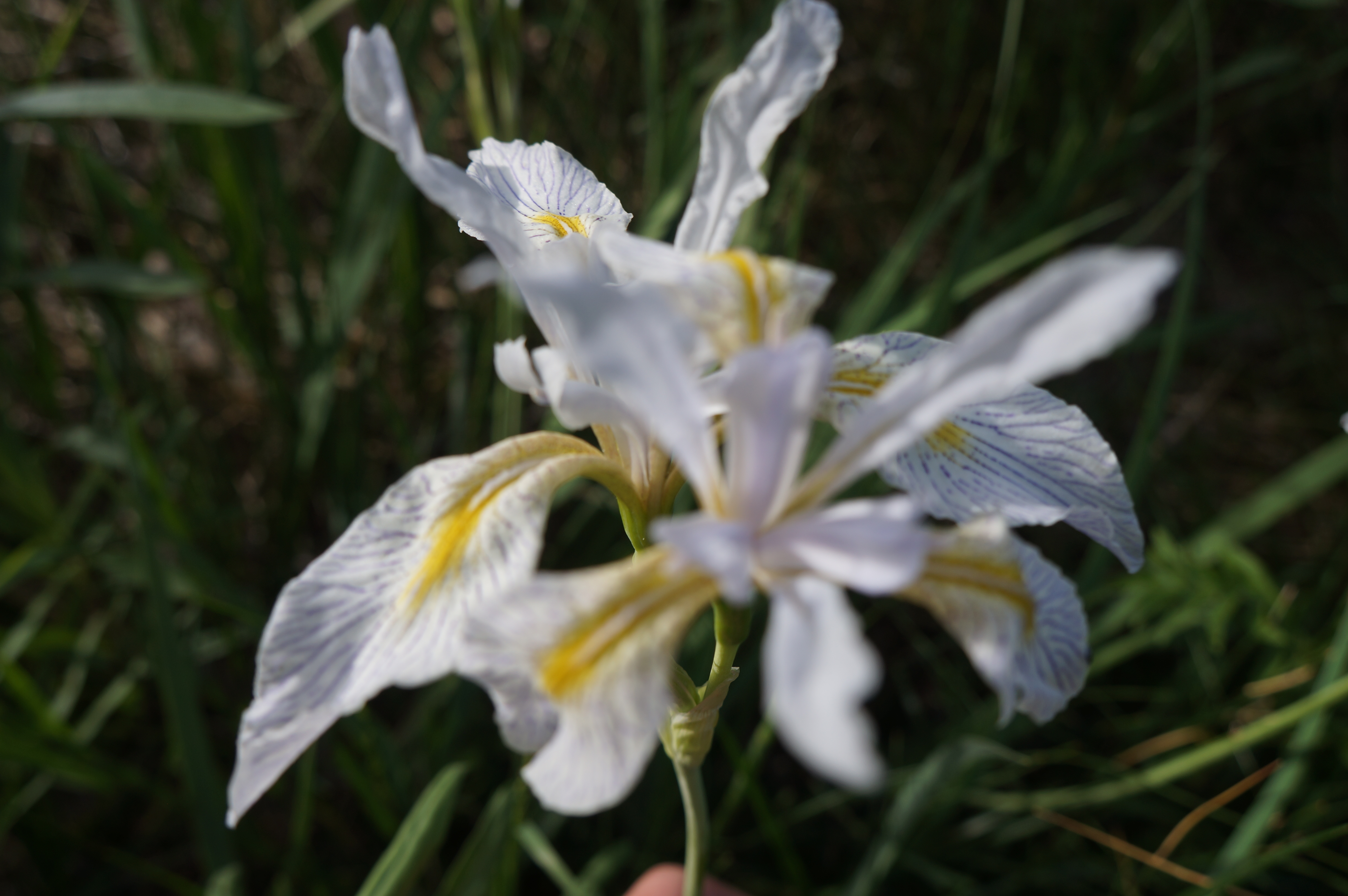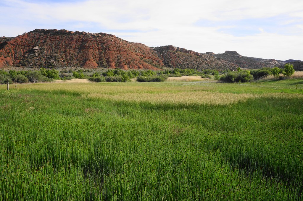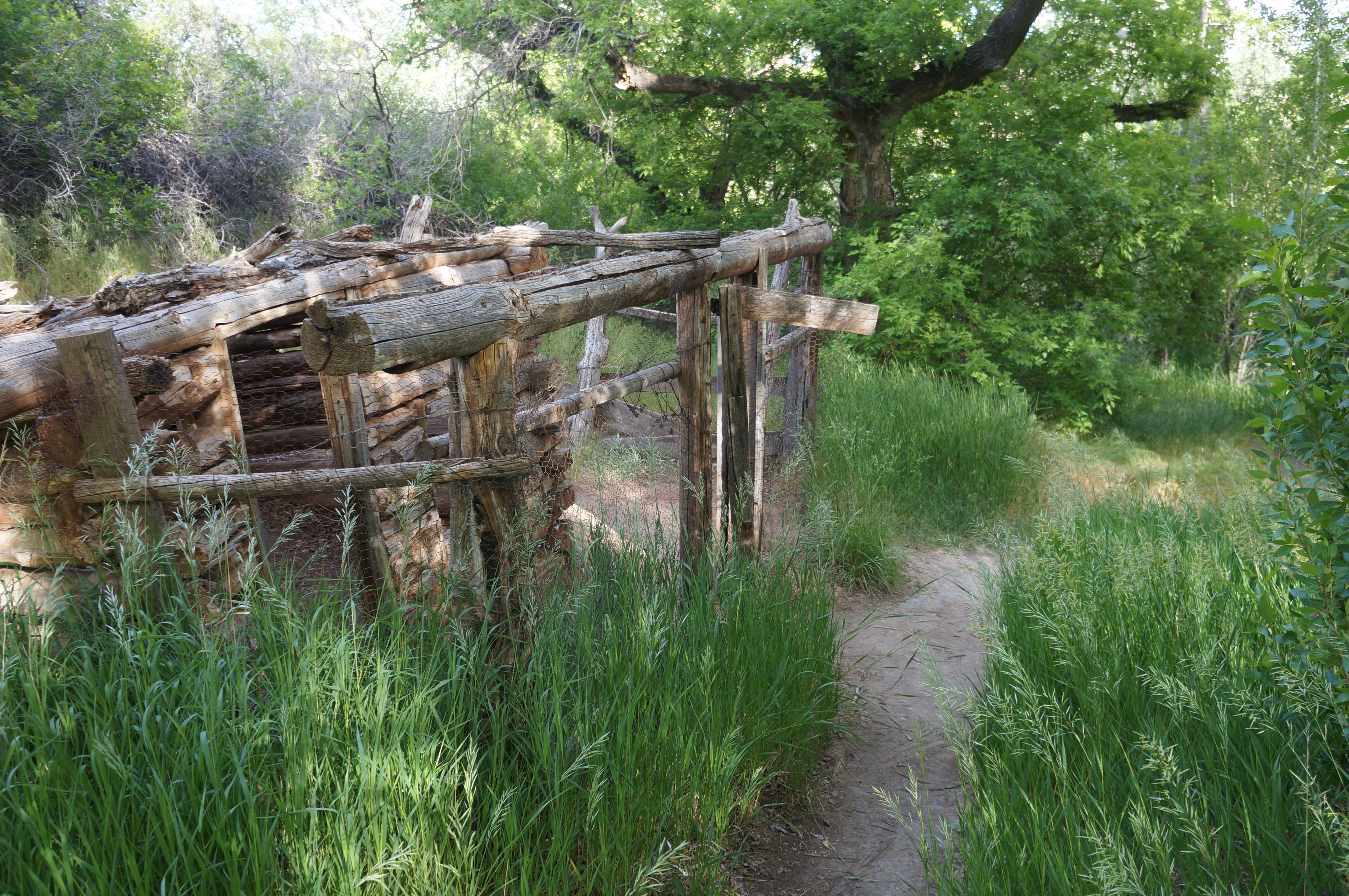 The Hog Canyon Trail cuts through Josie Morris’ old front yard, immediately passing a small but reliable spring (don’t drink!), followed quickly by the site of Josie’s old chicken coop on the left. Traversing riparian woodlands, the onward path passes a mucky retention pond on the right, with a secondary trail entering from the right. After passing through a gate/cattle guard, the trail emerges out into the open for the first time, revealing a look south across wispy grasslands toward Cub Creek and Daniels Canyon. The crumbly reddish ridge across the valley is composed of the familiar Moenkopi Formation, a Triassic period layer of sandstone.