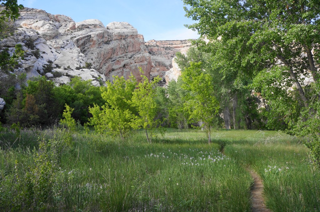 Horsetail, a bamboo look-a-like, is in abundance here as the trail skirts the field and crosses a sandy drainage, with views of the imposing slopes of Split Mountain off to the left. Here the Weber sandstone (a close cousin of the better-known Navajo sandstone) forms a hulking mass, uplifted along with the Rocky Mountains and then eroded by wind, water, and ice. There are dozens of side canyons that cut partway into the 1,500-foot-high mountain, with Hog and Box Canyons being merely two.