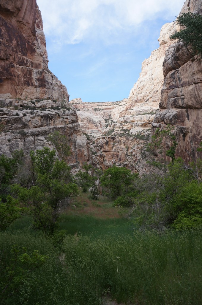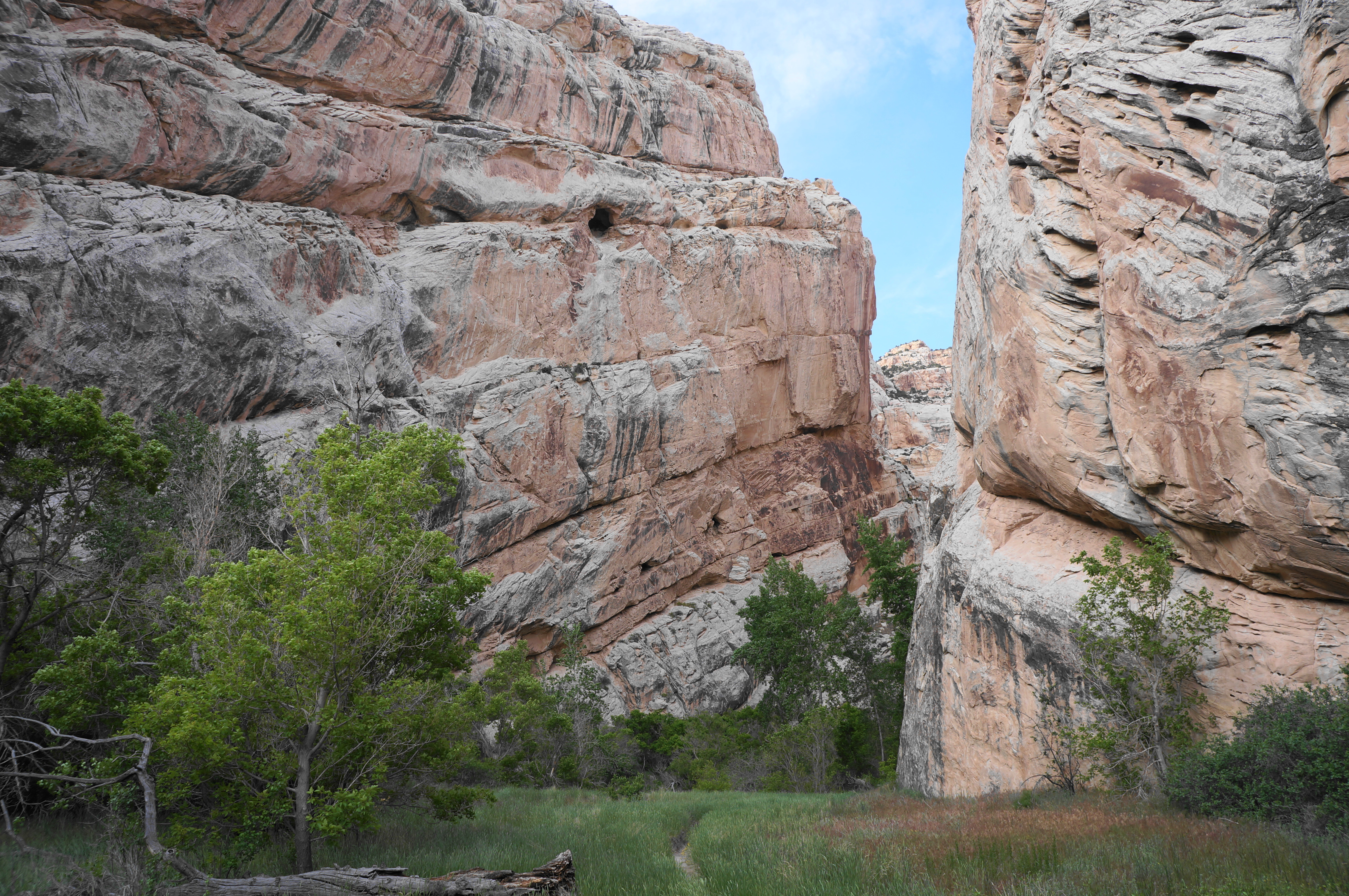 After heading up and down a set of two humps, the trail continues through forest again, passing through another wooden cattle guard. From here the path finally cuts northward and enters Hog Canyon, fronted by a beautiful meadow with sporadic tree cover and, in spring, blooming lilies. Ahead, the Weber sandstone thrusts upward at a twisted angle, and the canyon walls notably narrow. Passing what appears like a narrow entryway, look for tafoni—speckled honeycomb weathering—in the walls on the right and left.