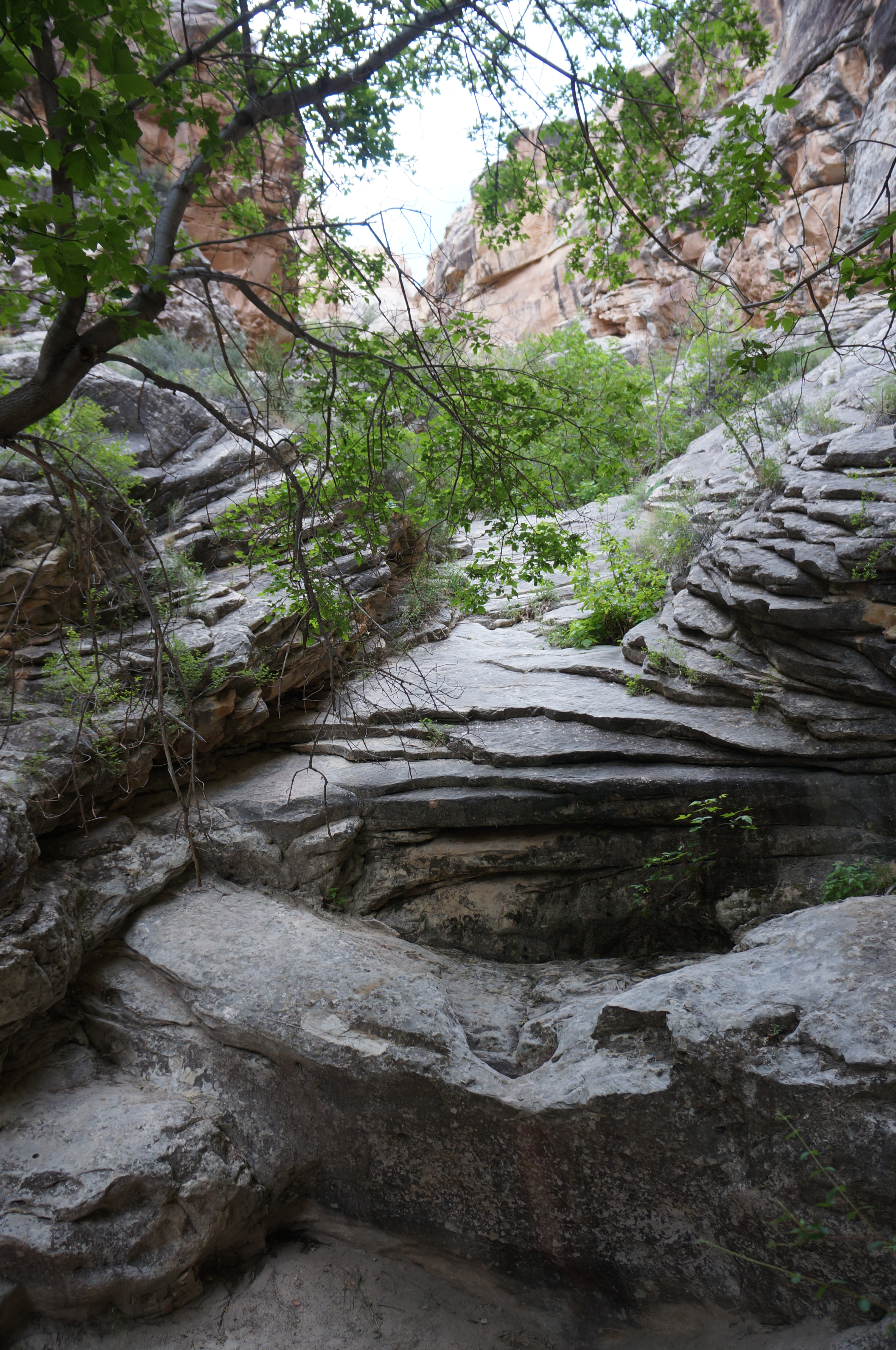 The riparian environment continues as the trail crosses a bridge over a minor tributary, then a second wooden span, this time over the main drainage in Hog Canyon. Cross back to the east side on a third bridge, then traverse another minor, brush-choked capillary. Just when hikers get the impression that they could continue on for miles like this, the route abruptly ends at a shady pouroff—it is possible to continue onward, although scrambling and eventually some sketchy climbing are required.