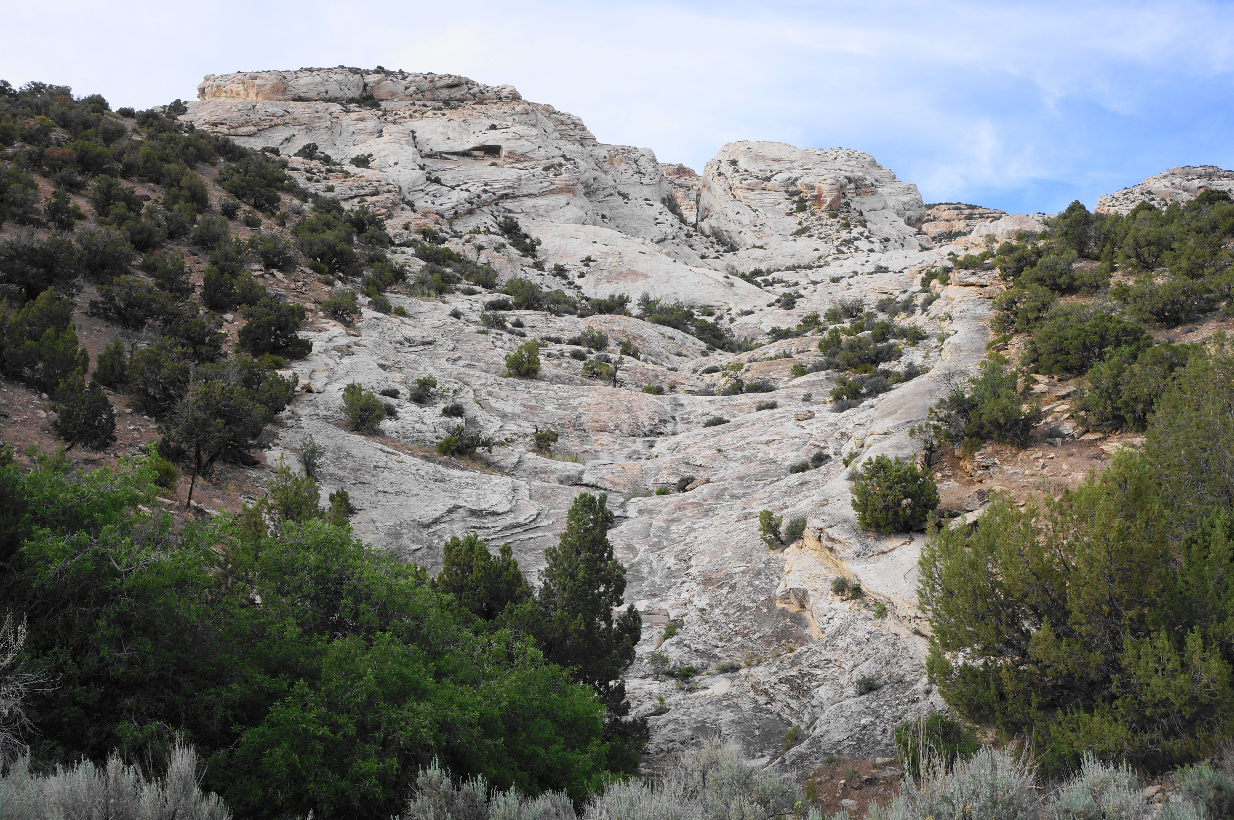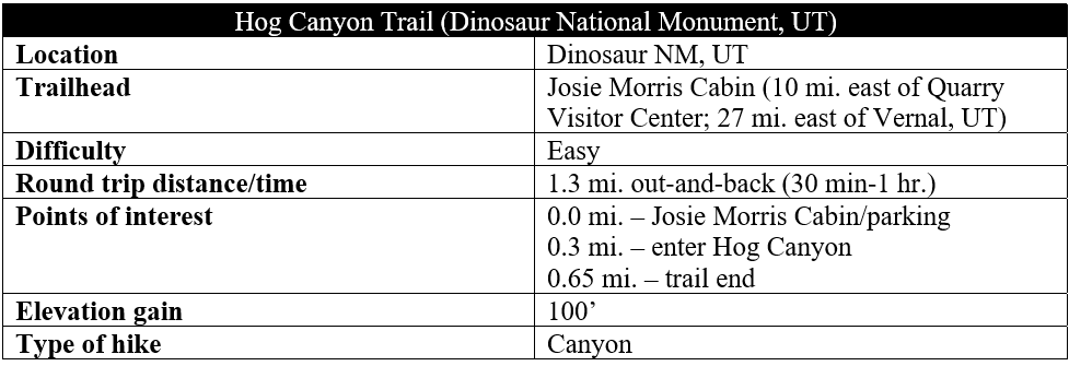 The Hog Canyon Trail begins from the parking area at the end of Cub Creek Road, which runs for ten miles beyond the Quarry Visitor Center in the Utah section of Dinosaur National Monument. There is a restroom at the end of the dirt (but improved) track, as well as the historic homestead of Josie Bassett Morris, a notably progressive and hearty resident who lived in the cabin she built here in the Cub Creek valley for 50 years. The cabin, as well as a few other small structures, are still present here.
