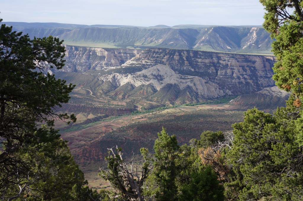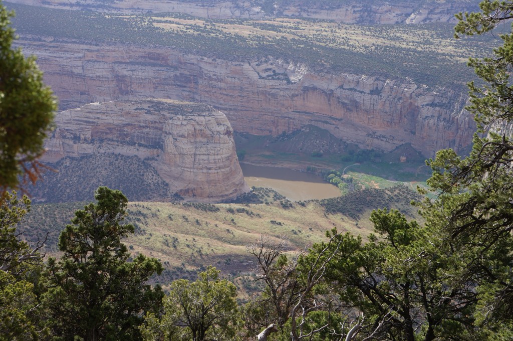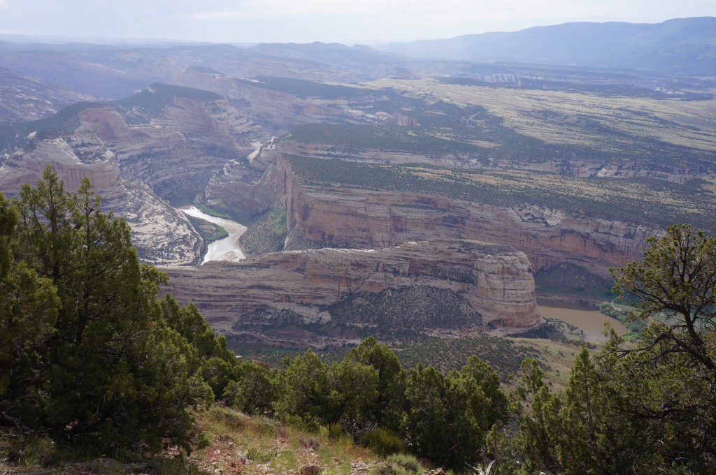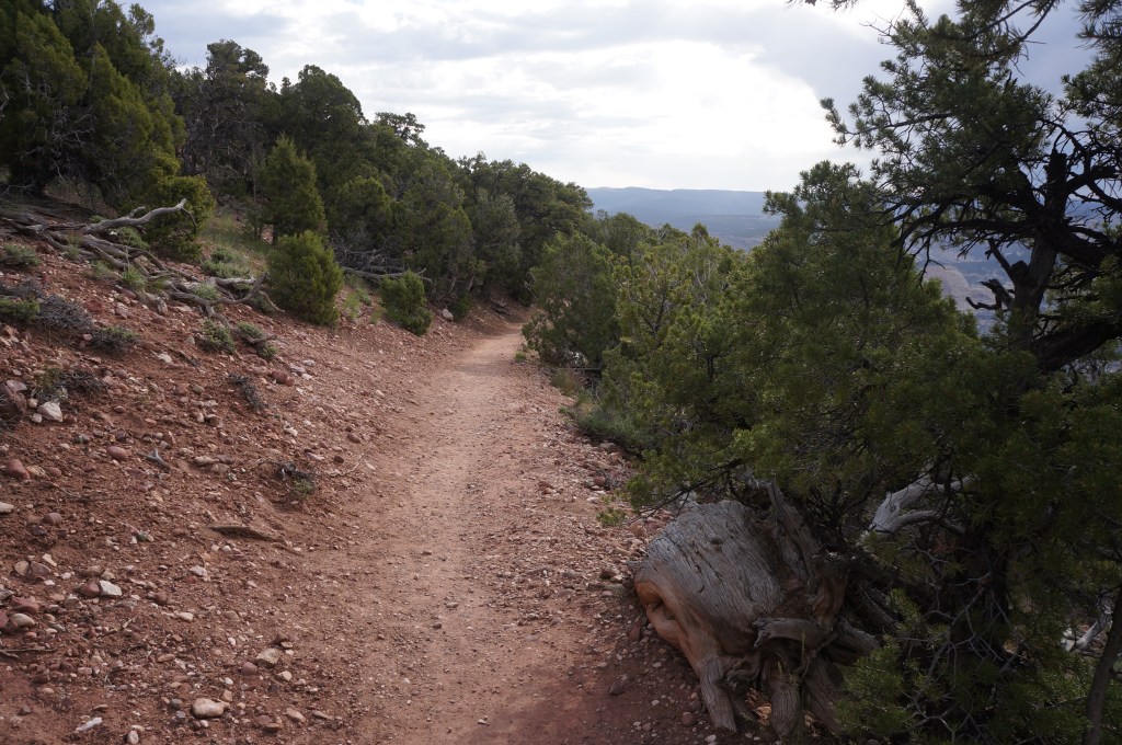 Views down to the network of canyons of Dinosaur are partly obscured at the start of the hike, but vistas improve as hikers make their way down the dusty trail. Notice the ubiquitous juniper trees as the initial route descends a set of switchbacks, with the similarly-hearty pinyon pines eventually working their way into the surroundings.