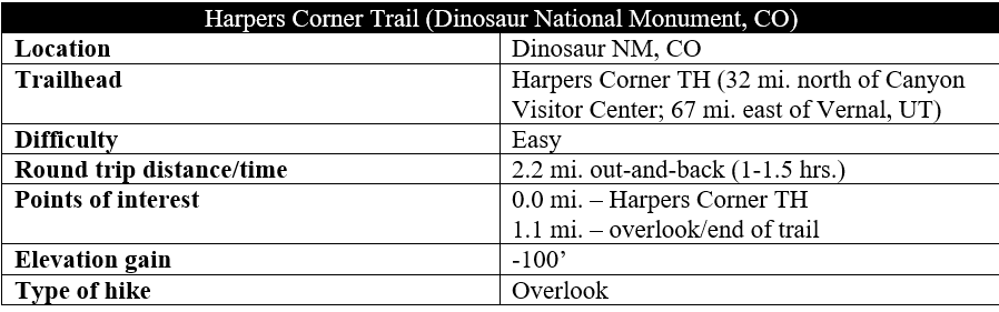 The 31-mile Harpers Corner Scenic Drive—which rises sharply from the small border town of Dinosaur, Colorado—culminates at its namesake, a lofty finger of land situated more than 2,000 feet above the Green River below. Upon arriving at the parking area at Harpers Corner after the long and curvy drive, visitors will likely be ready to get out and stretch their legs—making the short and easy Harpers Corner Trail (2.2 miles out-and-back) an attractive and worthy option.
