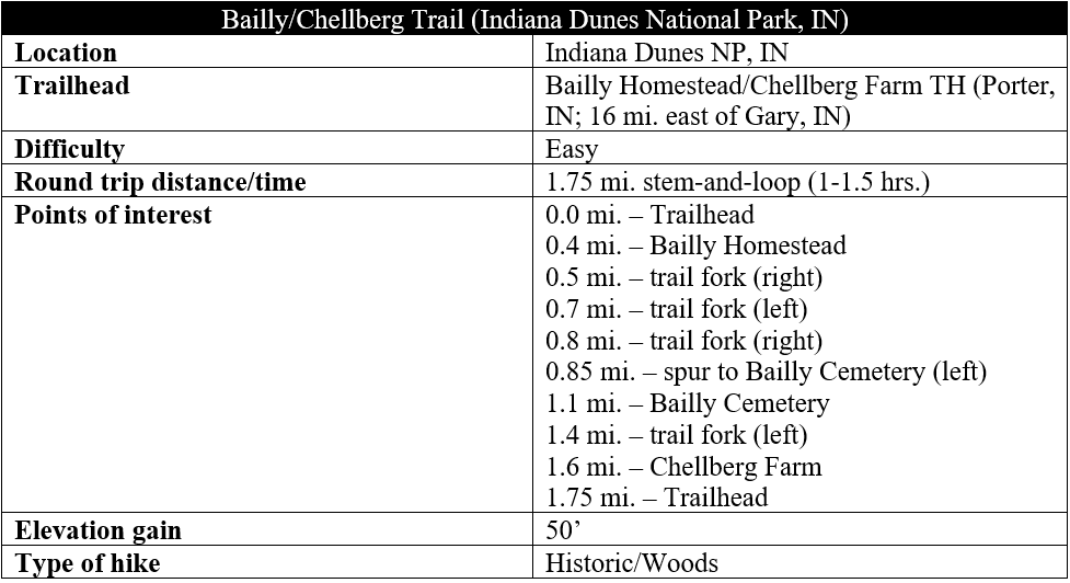 A prominent French Canadian fur trader, Joseph Bailly settled in the Indiana Dunes area in the early 19th century, establishing a trading post in 1822 near present-day Porter, Indiana. Decades later, Swedish immigrants Anders and Johanna Kjellberg purchased 80 acres of land on the other side of a small forest, establishing a small family farm and tapping the sugar maples to make maple syrup. Today, both the Bailly Homestead and Chellberg Farms still stand, incorporated into Indiana Dunes National Park and easily combined on a short, easy loop hike. In addition to the historic sites, the Bailly/Chellberg Trail traverses a fine section of deciduous forest and includes a spur to the impressive Bailly Cemetery. This easy walk covers about 1.75 miles and is a family-friendly hike in the Porter area.