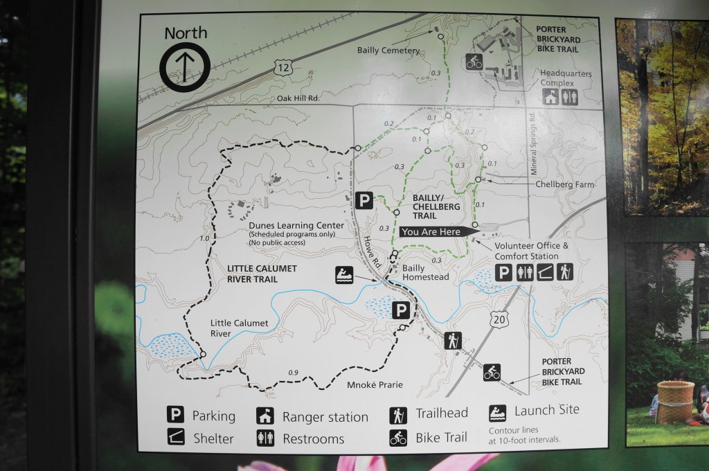 There are several options for connecting to the Bailly/Chellberg Trail loop, but the starting point that makes the most sense is the trailhead off Mineral Springs Road, just north of U.S. Route 20 and south of Oak Hill Road and the Park Headquarters area. (Note: The trailhead is marked “Little Calumet River Trail” on Google Maps.) There are several picnic verandas here, as well as a volunteer information station, which has limited hours.