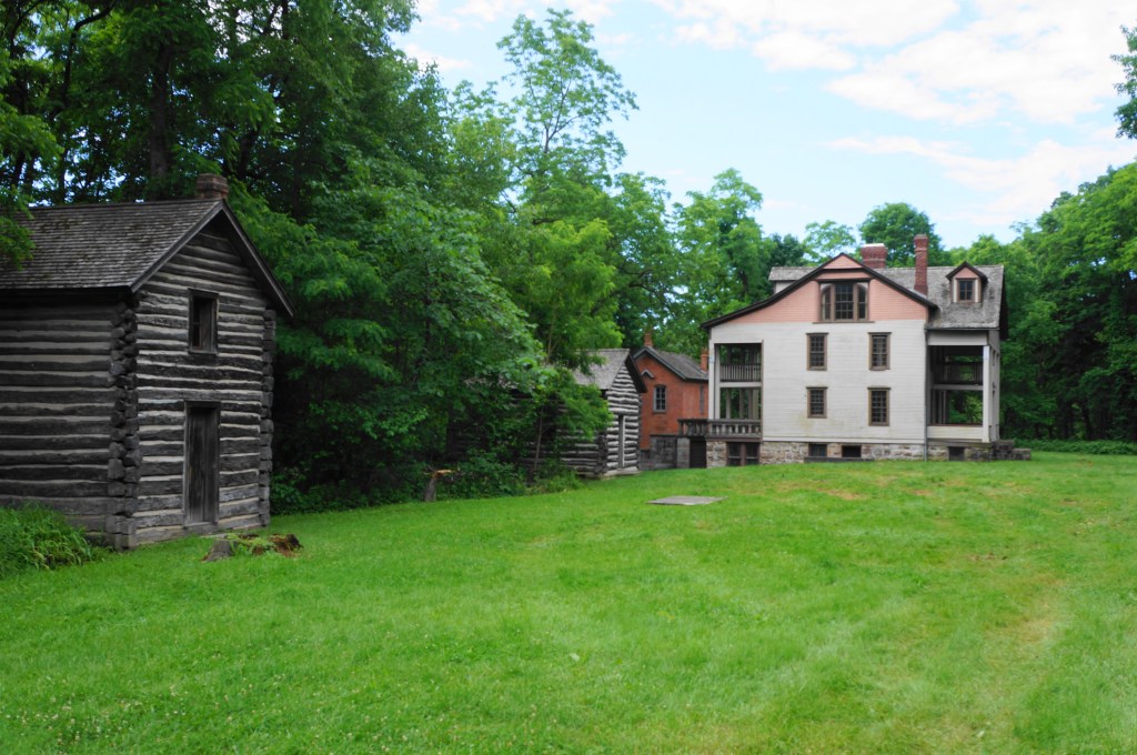 Here the wide track treads southwest, above the banks of an unnamed creek bed on the right. Soon the trail drops to cross the (often dry) drainage, then climbs briefly back to return to the flat basin. Head west through a sea of maples, oaks, and other deciduous varieties and emerge at around 3/10 mile at an open field. Look to the left for a historic plaque marking this area as a National Historic Landmark. Ahead, to the south, is the Bailly Homestead, a series of renovated structures dedicated to telling the story of Joseph Bailly, a fur trader who had unusually good relations with the Native Americans in the area. The main house on the property is an example of vernacular architecture: a building constructed without professional guidance and occurring outside any particular architectural tradition, usually made from local materials.