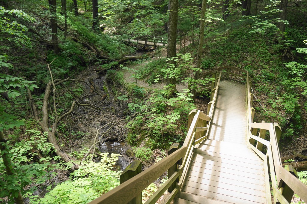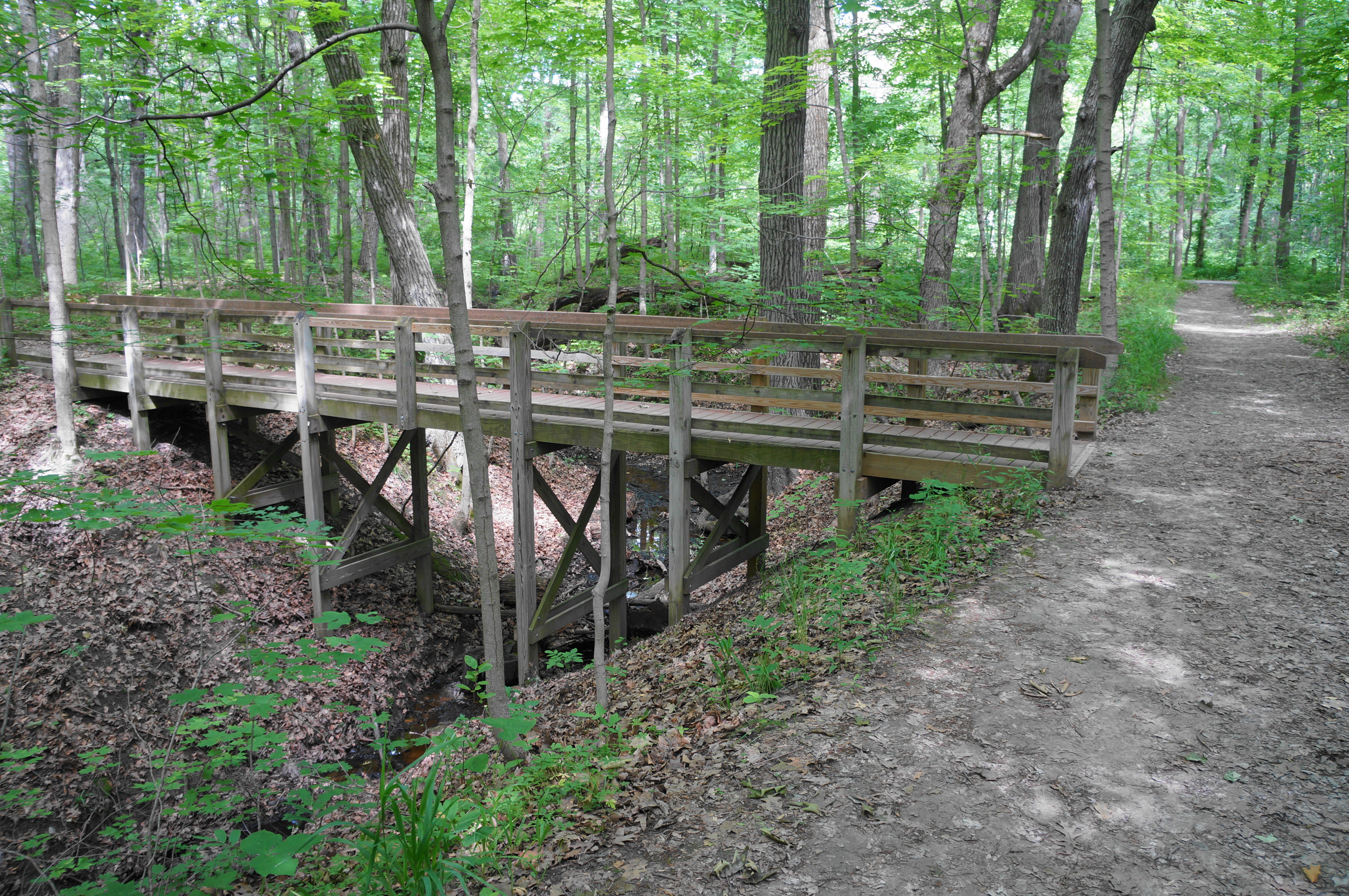 Pass a trail fork at ½ mile, continuing right and climbing a mild incline, followed by a row of four impressive, spindly oak trees. Come to a second fork at 7/10 mile, bear left, then stay right at a third junction minutes later. From here the Bailly/Chellberg Trail descends to clear the same drainage from before, crossing a bridge over a surprisingly deep-cut gully.