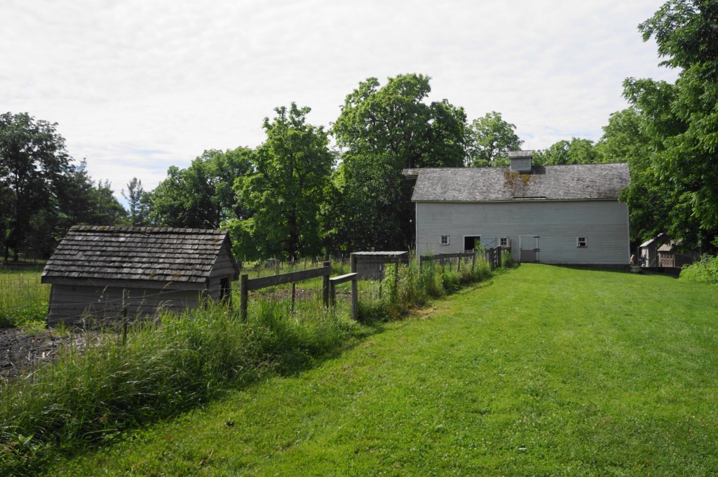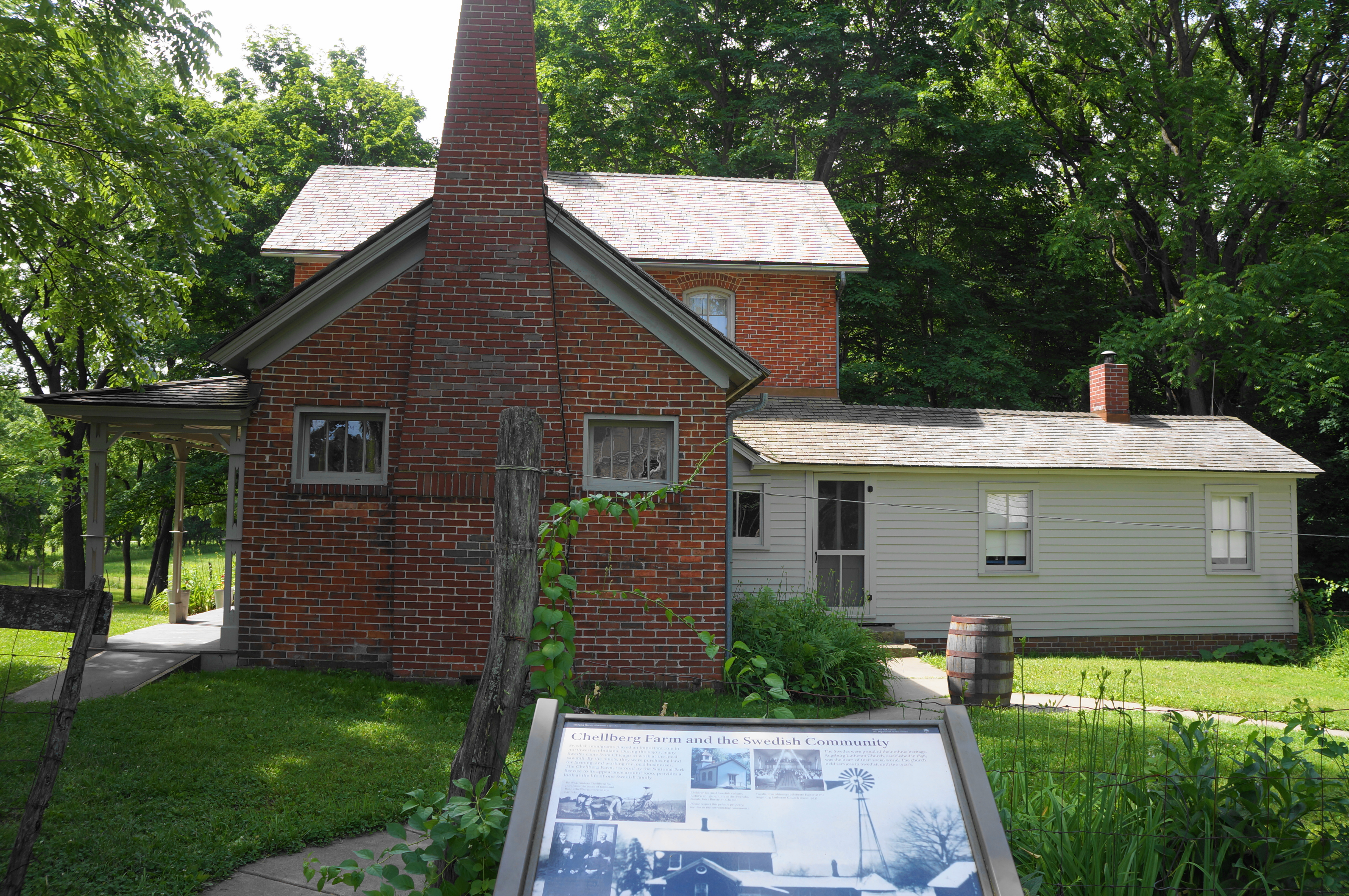 Here there is an unmarked junction. Bear right, entering the Chellberg Farm and approaching the various historic structures from the north. The Swedish Kjellberg—or Chellberg—family travelled to the United States in 1863 and eventually purchased this land and operated a working farm. The property was passed down two generations before being sold to the National Park Service in 1972. Today, visitors can tour the farm, which has a handful of live animals.