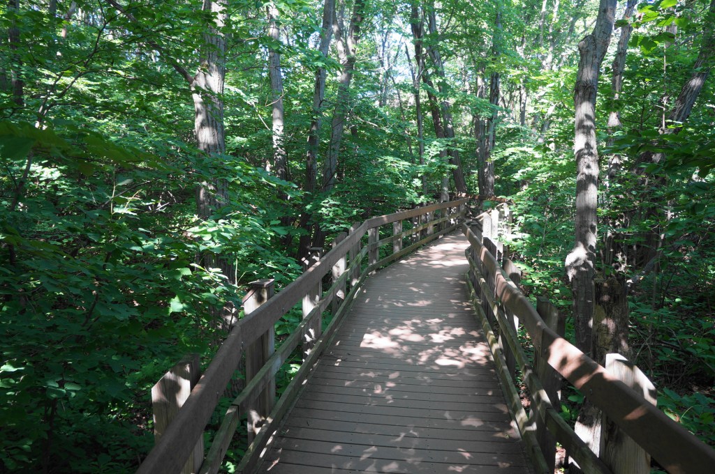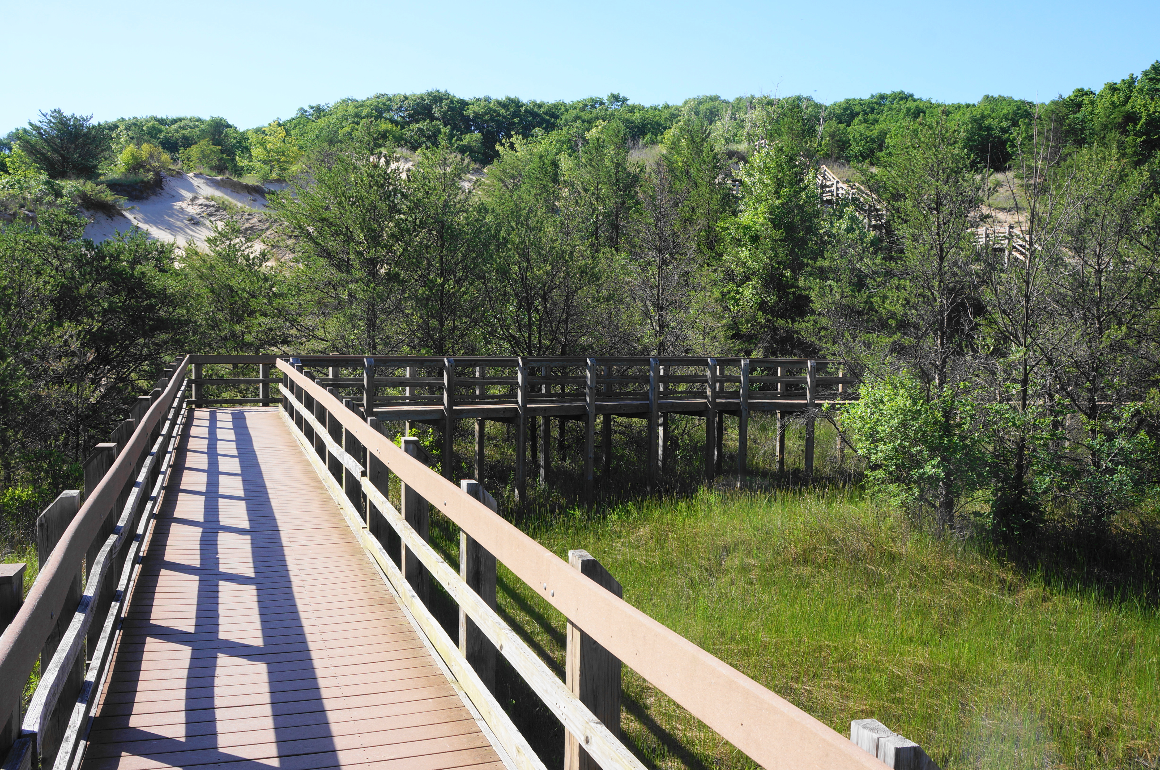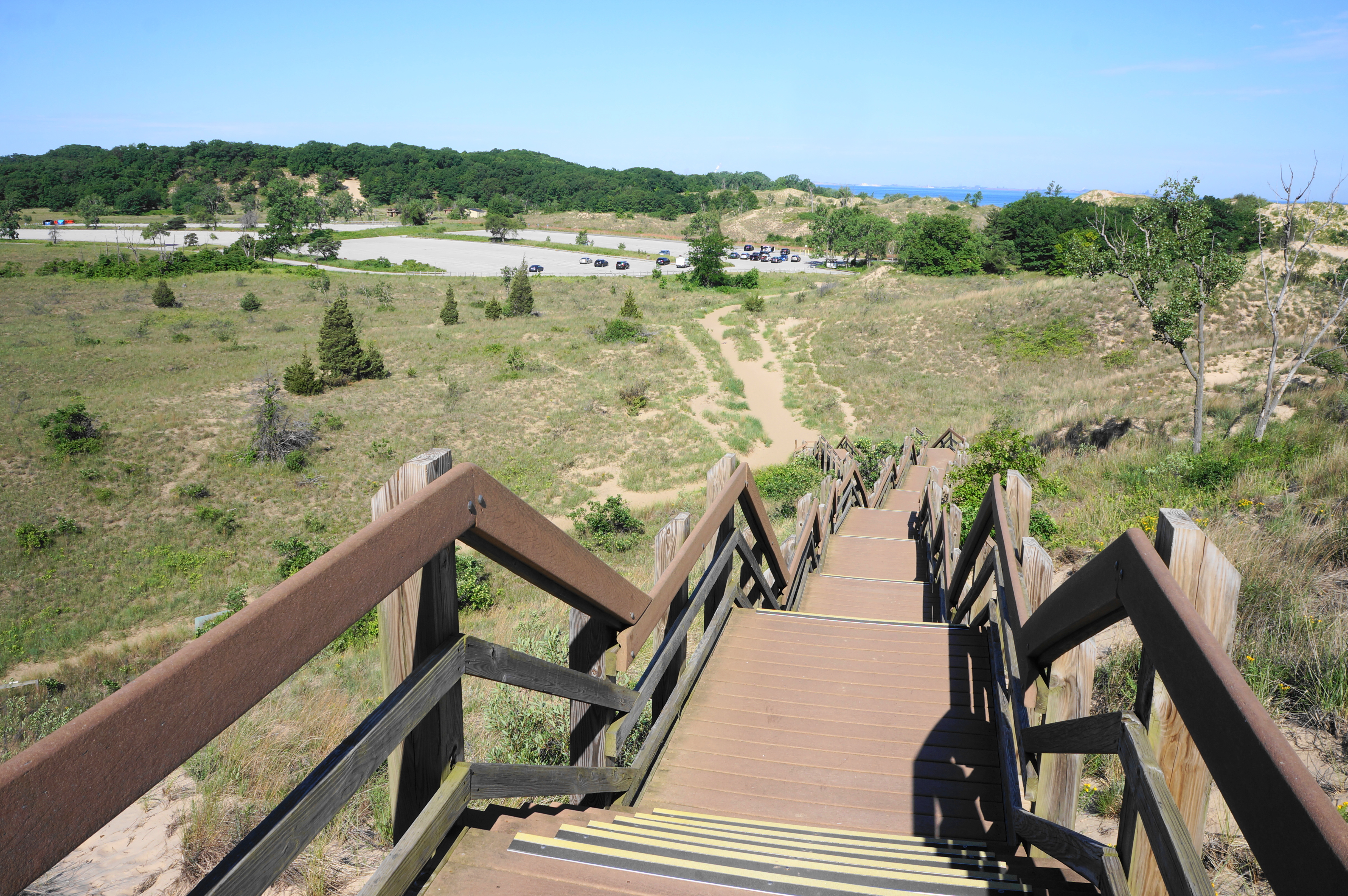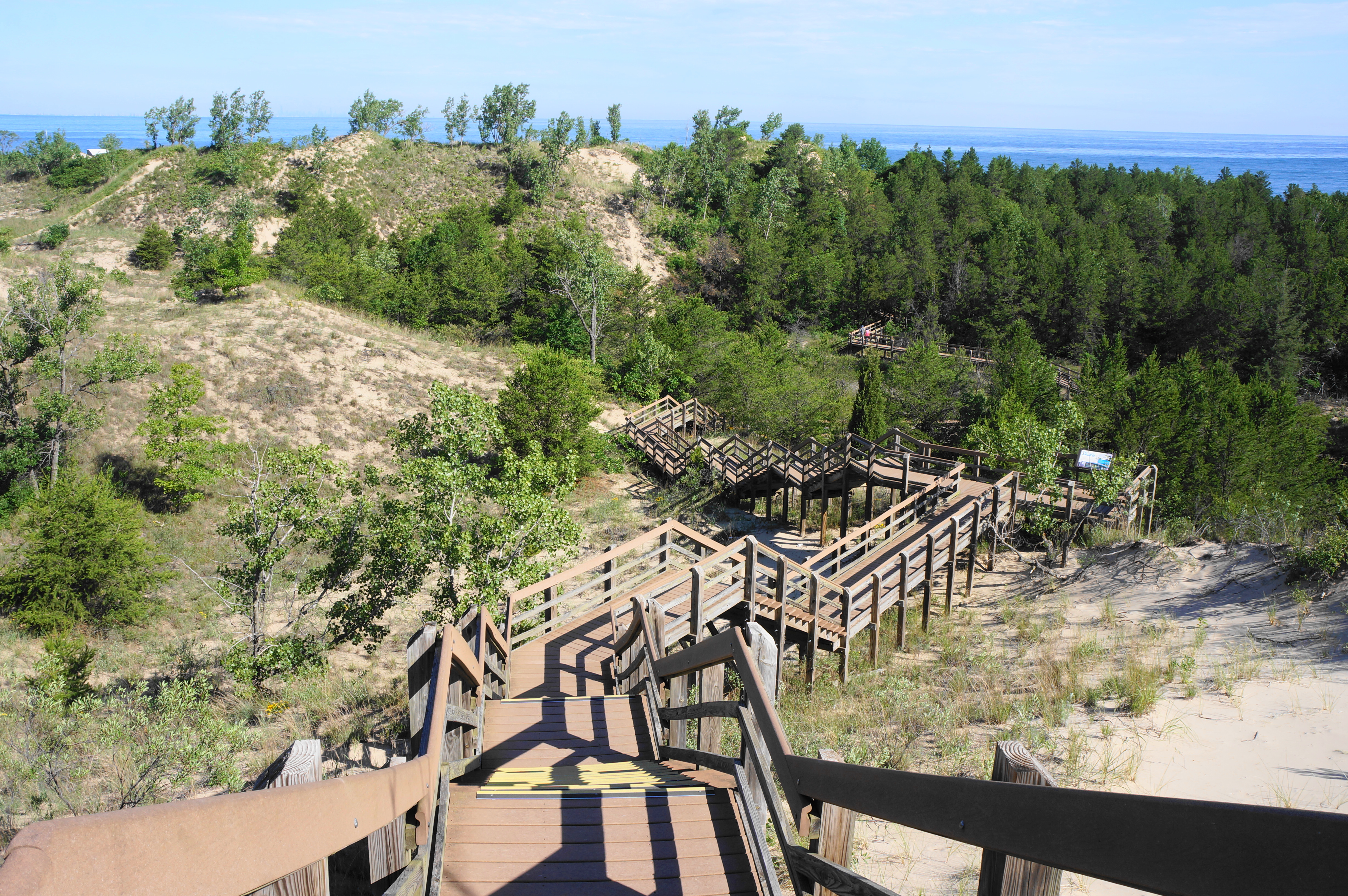 After cresting an initial lip, the trail drops to a small flat dotted with cottonwoods, followed by another climb into a forest of pines and oaks. By now you have already covered more than half the hike’s distance, but the second half is considerably tougher. After traversing a boardwalk section below Diana’s Dune, the onward route requires ascending 132 stairs, rising to heights with excellent views back to Lake Michigan and Chicago.