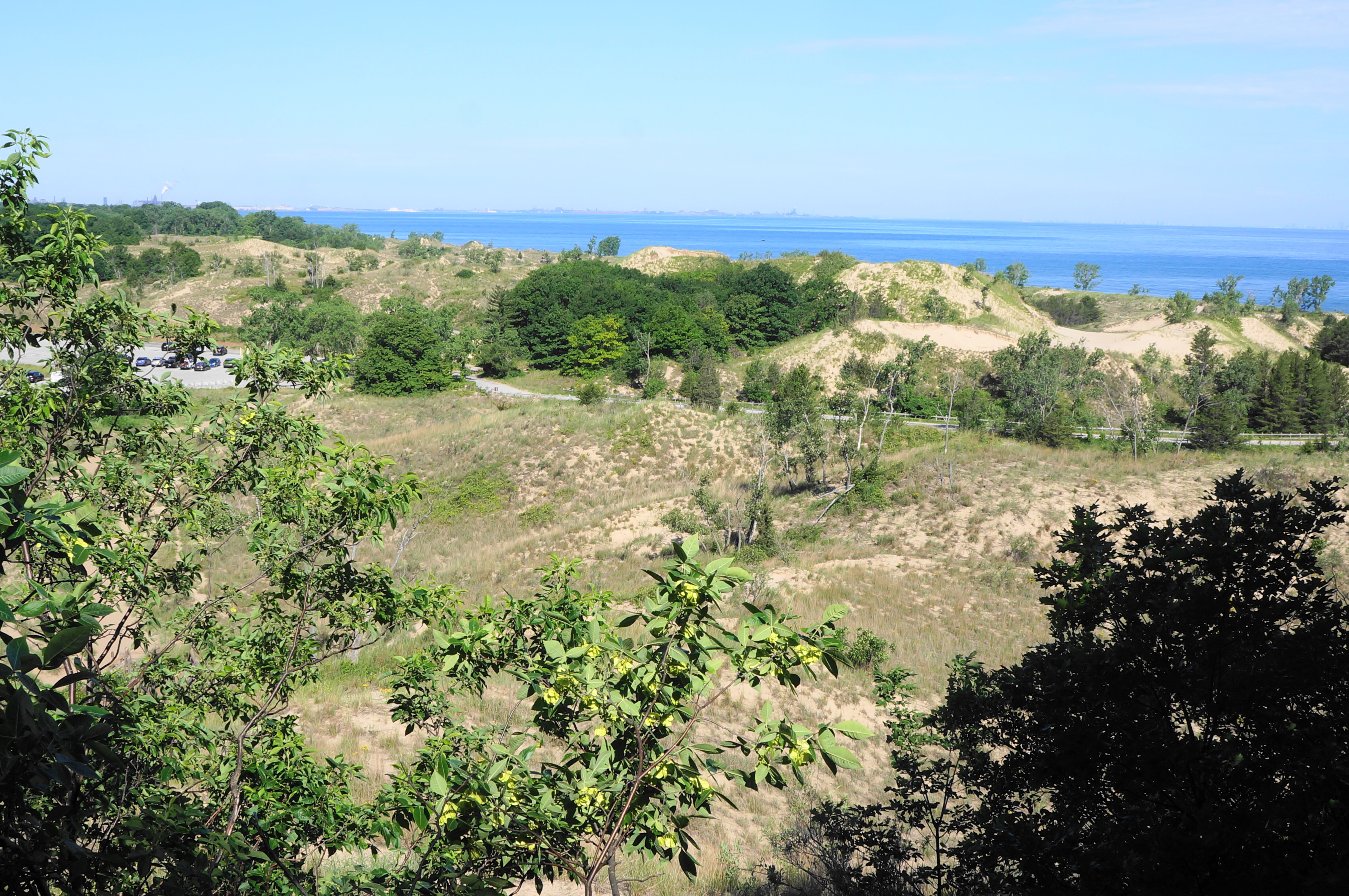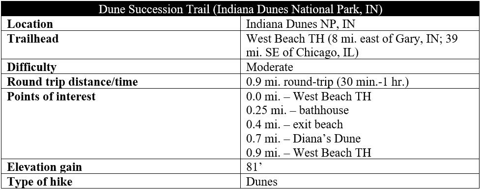 West Beach is a short drive from Gary, Indiana and located in a fee area inside Indiana Dunes National Park with three connecting trail loops. The Dune Succession Trail, beginning and ending at the large parking lot at West Beach, is the shortest but most scenic of the trio. From the parking area, walk north, following the wide, paved road toward the West Beach bath house, which can be absolutely jammed on a busy weekend. Walk through the bath house and descend from the wooden deck to the beach itself, a pleasant lakeside destination with distant views of Chicago.
