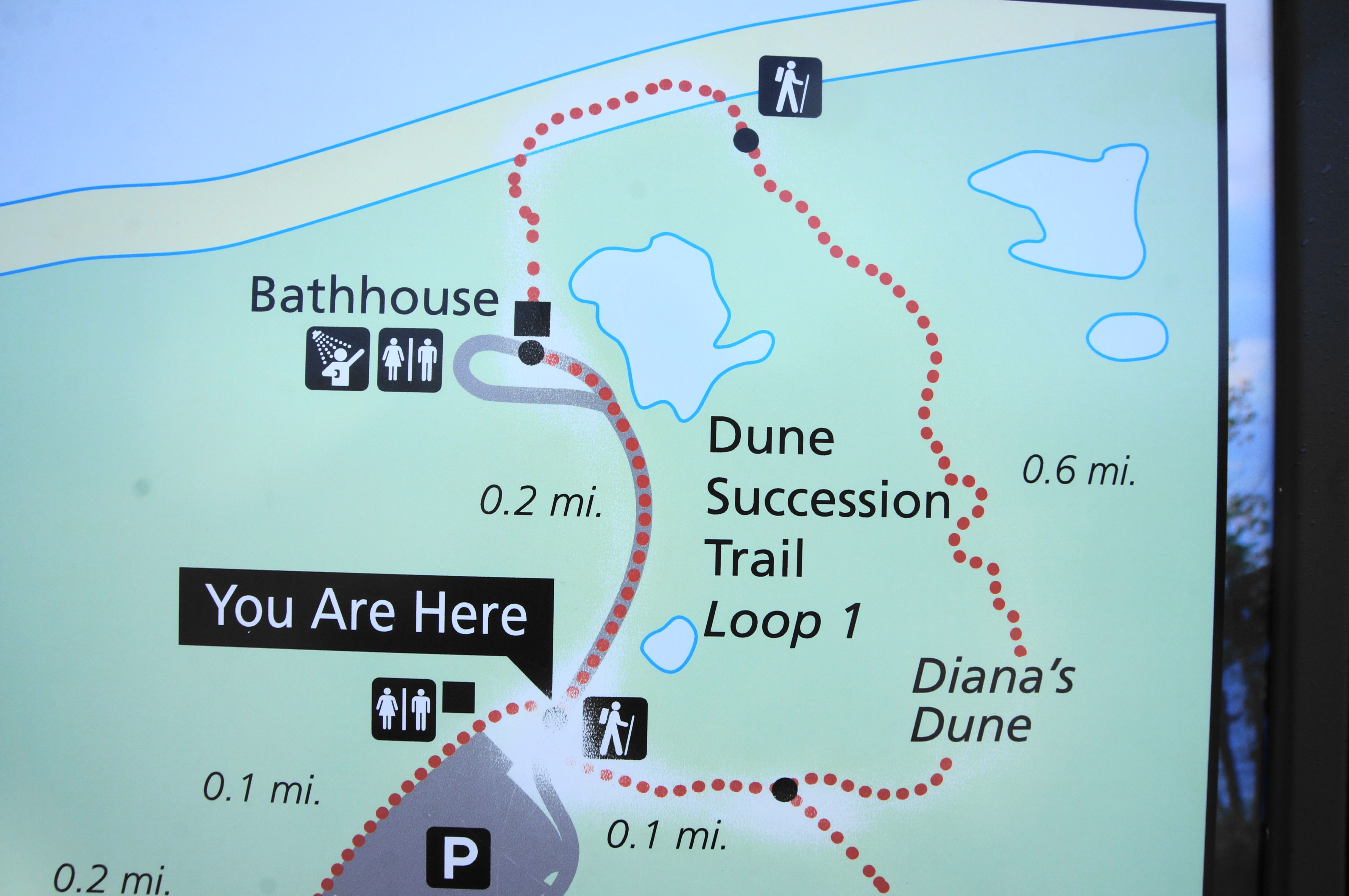 What goes up must come down, and so hikers from here must proceed down at least 160 stairs, returning to the open sun, in sight of the parking lot. At the base of the stairs, turn right, following the short sandy path back to the start. Congratulate yourself for having conquered Diana’s Dune, one of the more challenging climbs in the park.