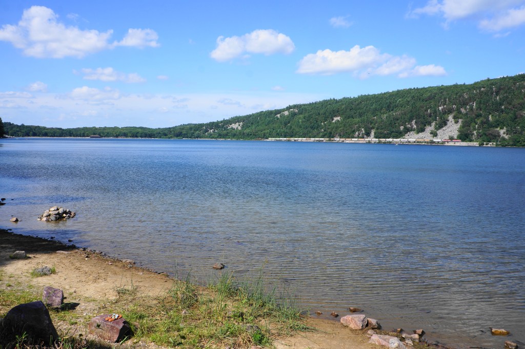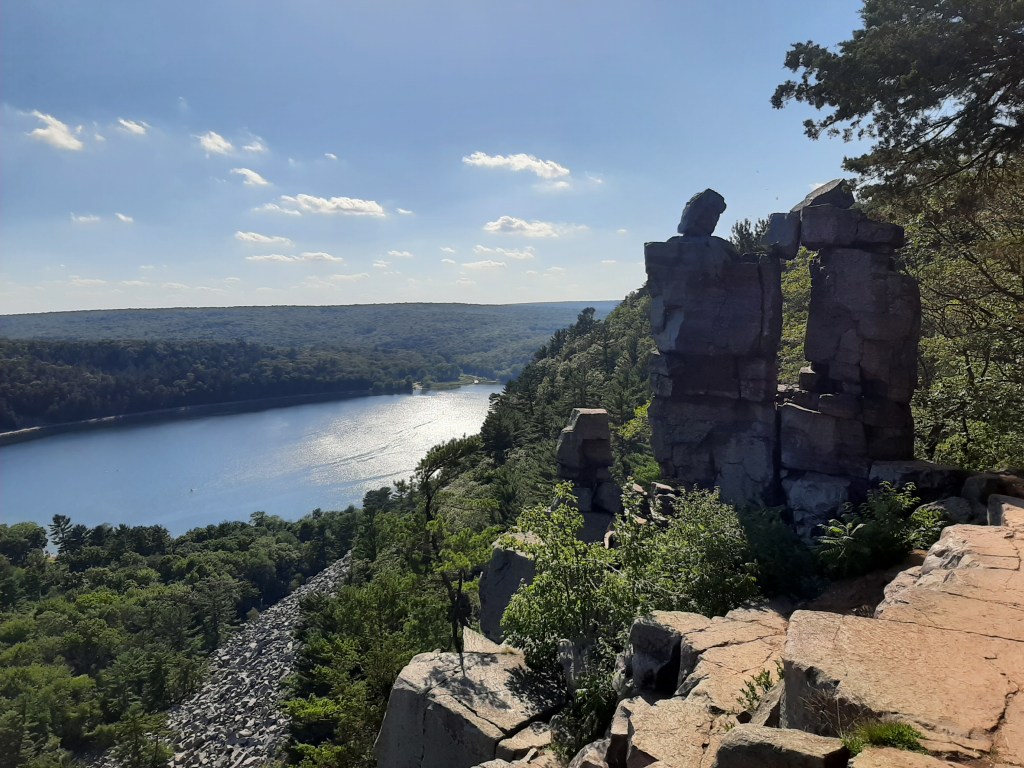 Follow the path to the base of a sharp left-hand bend and start of a stony staircase, inaugurating the steepest portion of the West Bluff Trail. Hikers will have to ascend 200+ steps in the next ¼ mile, rising seemingly endlessly to the top of the quartzite bluffs overlooking Devil’s Lake. At 8/10 mile, there is a bench with one of the better vistas, followed by a short up-and-down section with two additional staircases. By now one can see across the lake to the railroad and East Bluff on the opposite bank: this depression formed during the uplift of the Baraboo Range, a modest syncline that stretches east-west for around 25 miles, with the sink filling with fresh water that has no natural outlet.