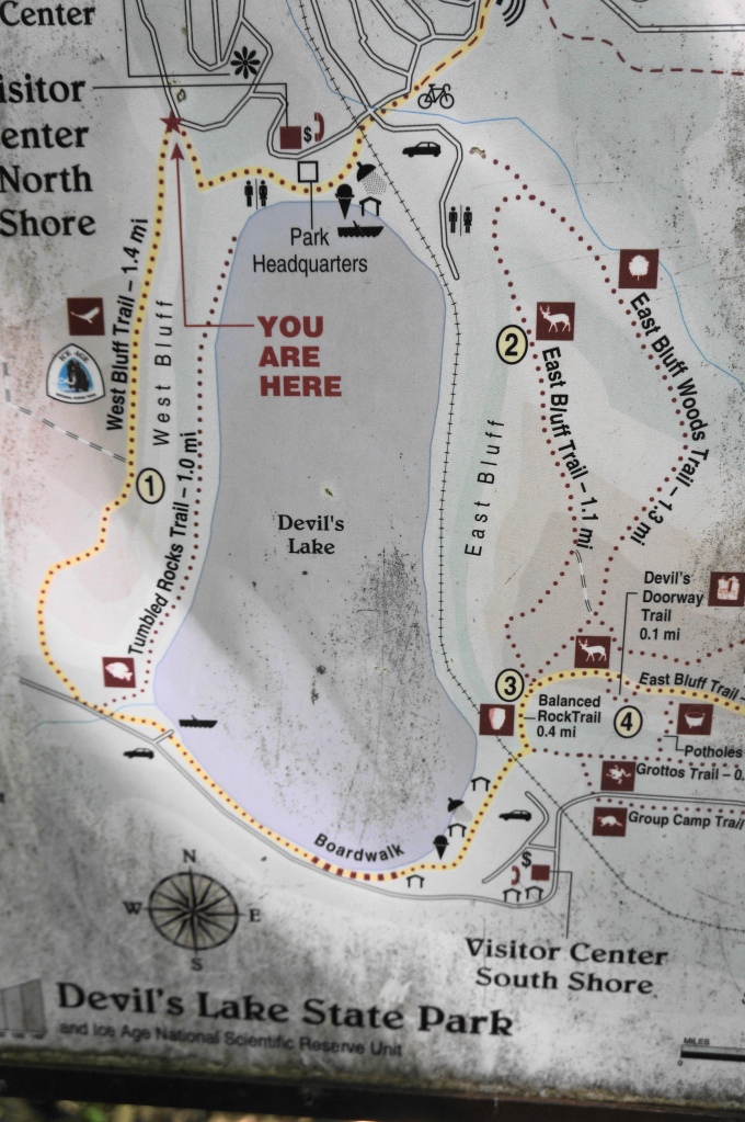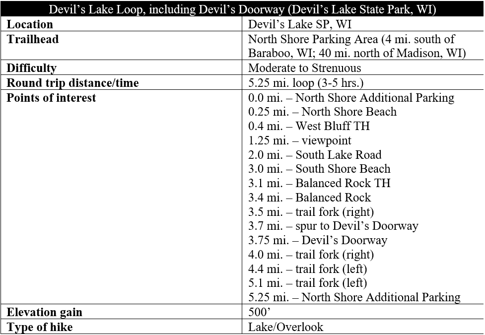 Devil’s Lake State Park is located about an hour from Madison, Wisconsin and an even shorter distance from Wisconsin Dells and the town of Baraboo. There are two primary entrances—North Lake and South Lake—with either offering access to the Devil’s Lake Loop hike described. For ease of navigation, this description begins at the more popular North Shore, an area containing a lengthy lakeside beach, many concession stands, several campgrounds, and a modest Visitor Center. Drive past the Visitor Center, paying the fee for entrance, and make your way toward the parking area at the northeast corner of Devil’s Lake. On a busy day, it’s likely you will be compelled to cross the railroad tracks and turn right at the Additional Parking Area. This is all the better, as this is an even more convenient start/end point for the loop hike.
