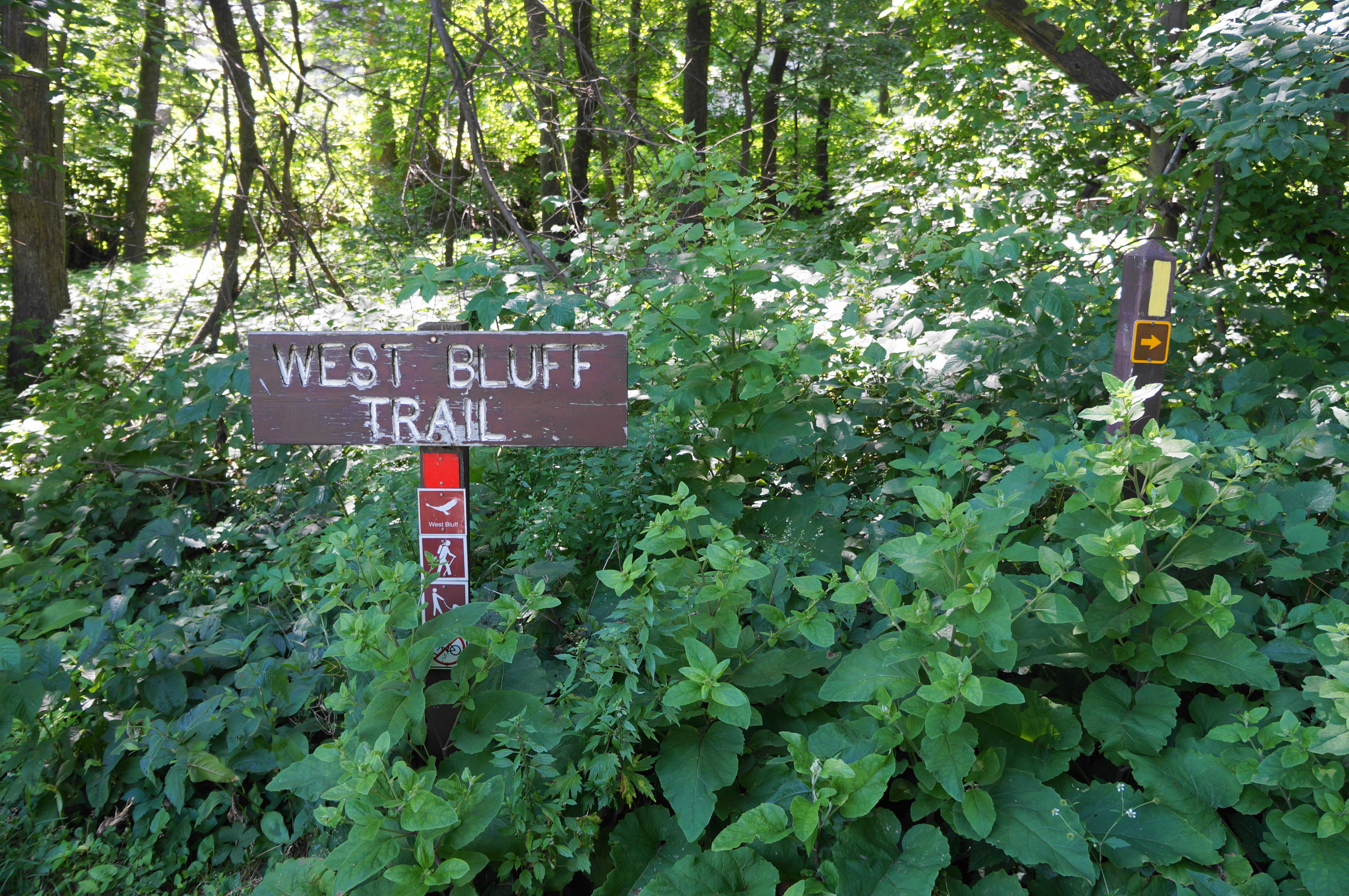 After briefly inspecting the darkness of the cave, continue downhill on the East Bluff Trail, staying right at a prominent spur trail at 5.1 miles. Minutes later, bear left at the wide junction with the East Bluffs Woods Trail, continuing northward. From here it is a short and easy walk to the Additional Parking lot, capping off the 5.25-mile hike.
