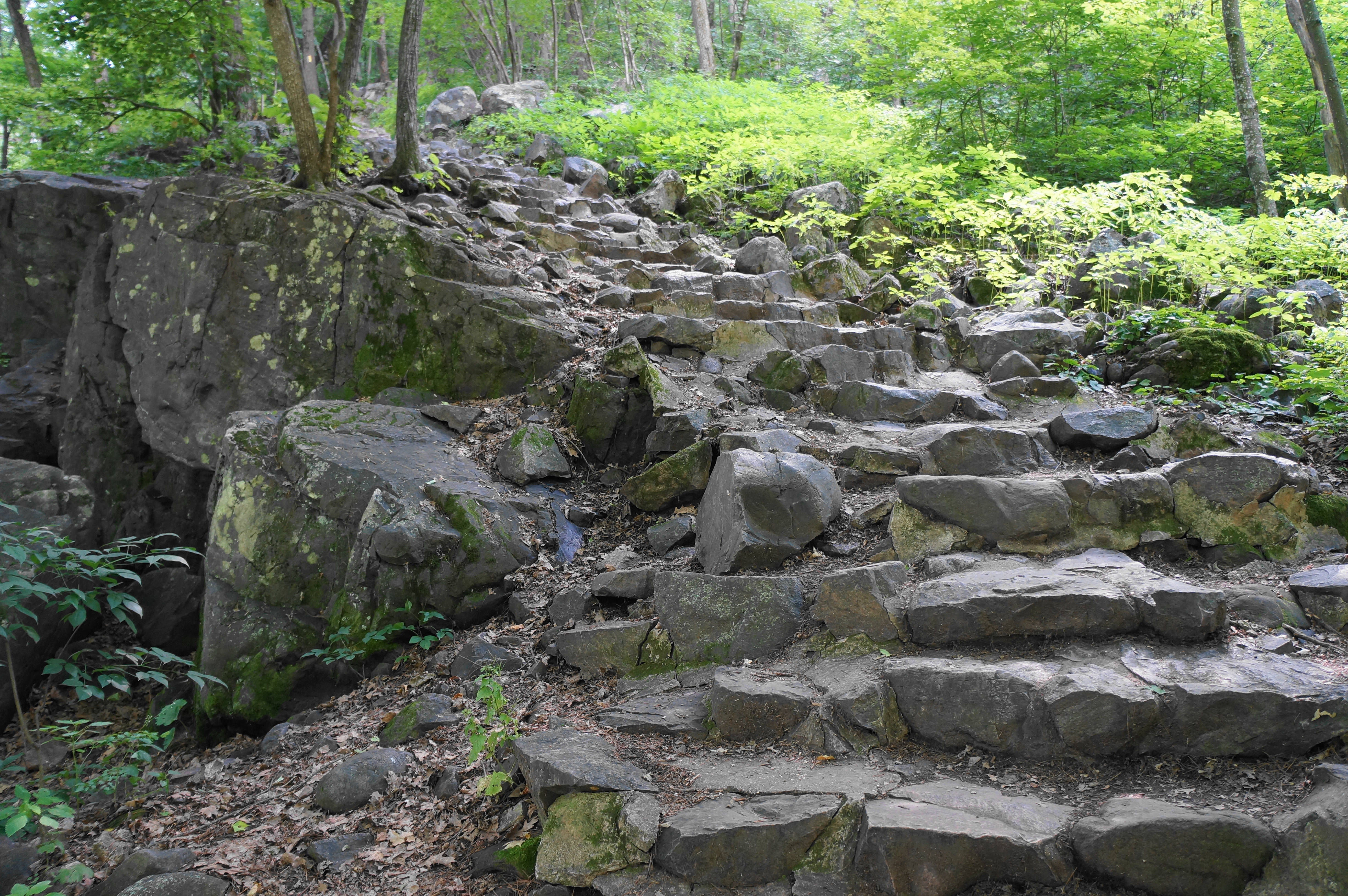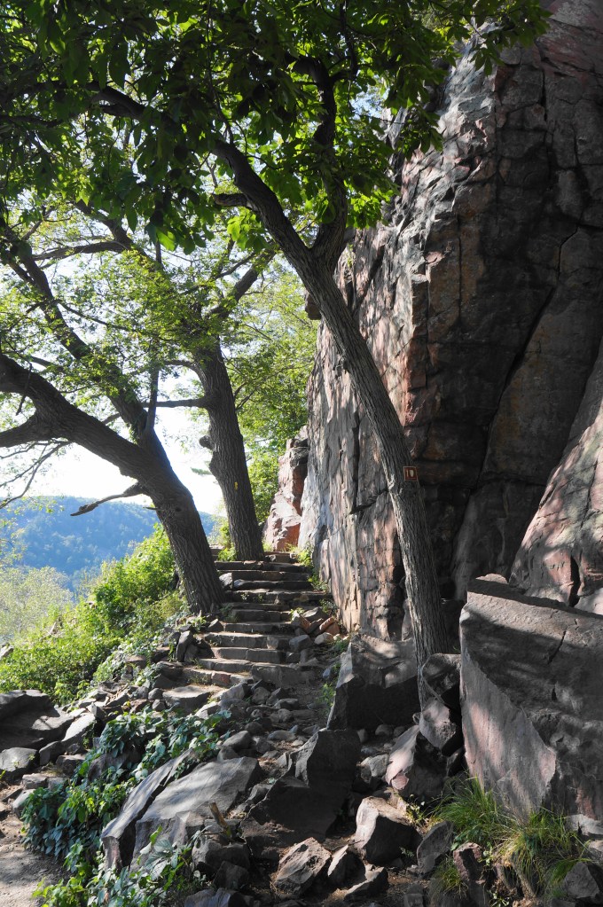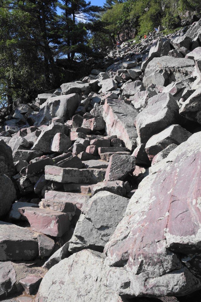Follow the narrow staircase through the boulder field, noticing the shift in the color of the quartzite from gray to a deep and attractive red. The exposed switchbacks can be slow-going if the trail is crowded—but be patient and take your time, using careful footing to work your way up the boulder slope. After a brief level section, the path rounds a right-hand bend with excellent views of the lake, then hugs a high cliff on the right.