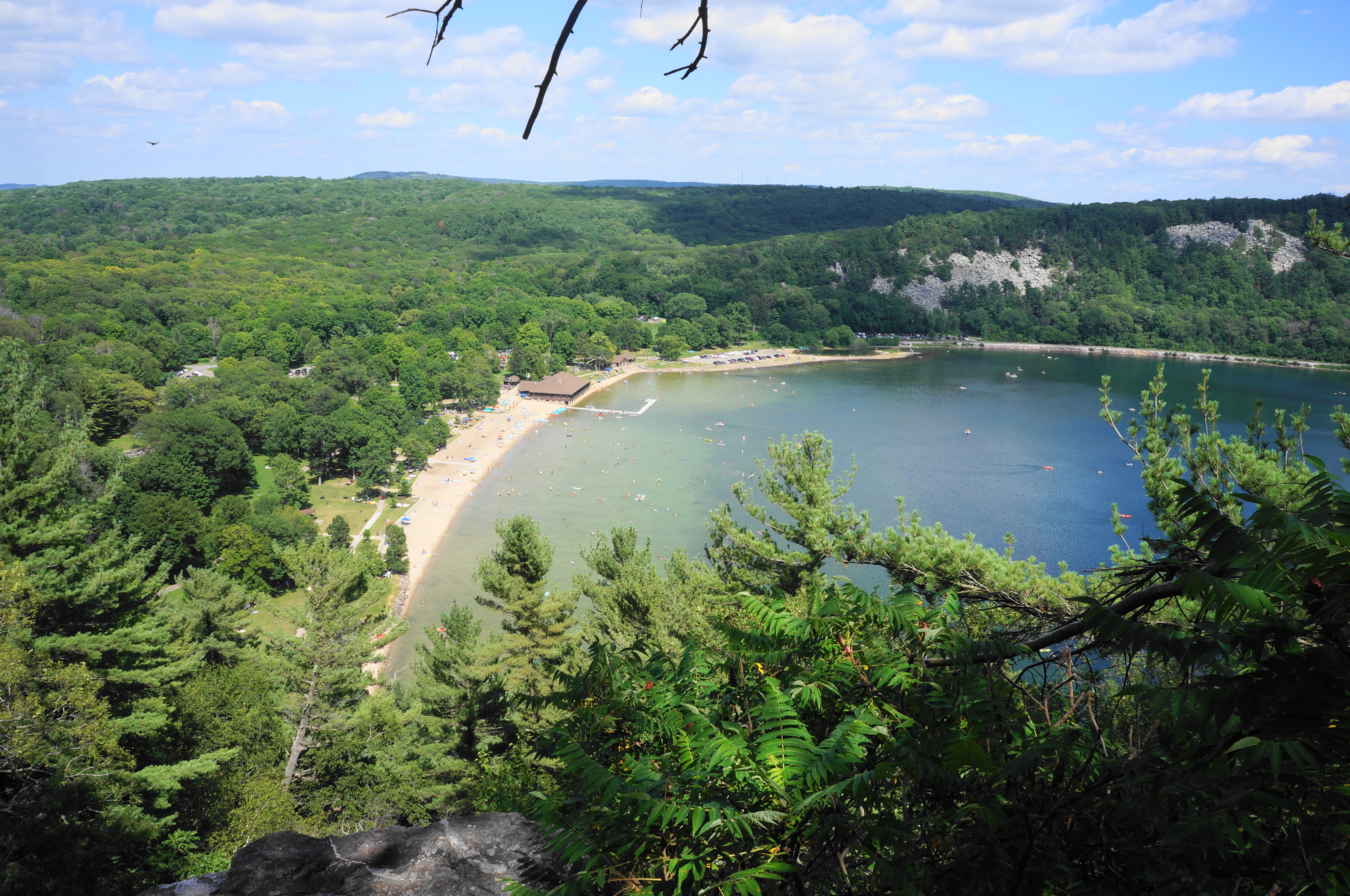 The next stretch involves a milder but persistent ascent, starting to leave the dull noise of the crowded beach behind. At 1.25 miles, with a short radio tower on the left, there is an official viewpoint on the right. Here one can look through the viewfinder at the lake and mountains below and walk out to the edge of the craggy bluffs, nearly 500 feet high. This is one of the most interesting vistas in the entire park—and perhaps one of the best in the entire state of Wisconsin.