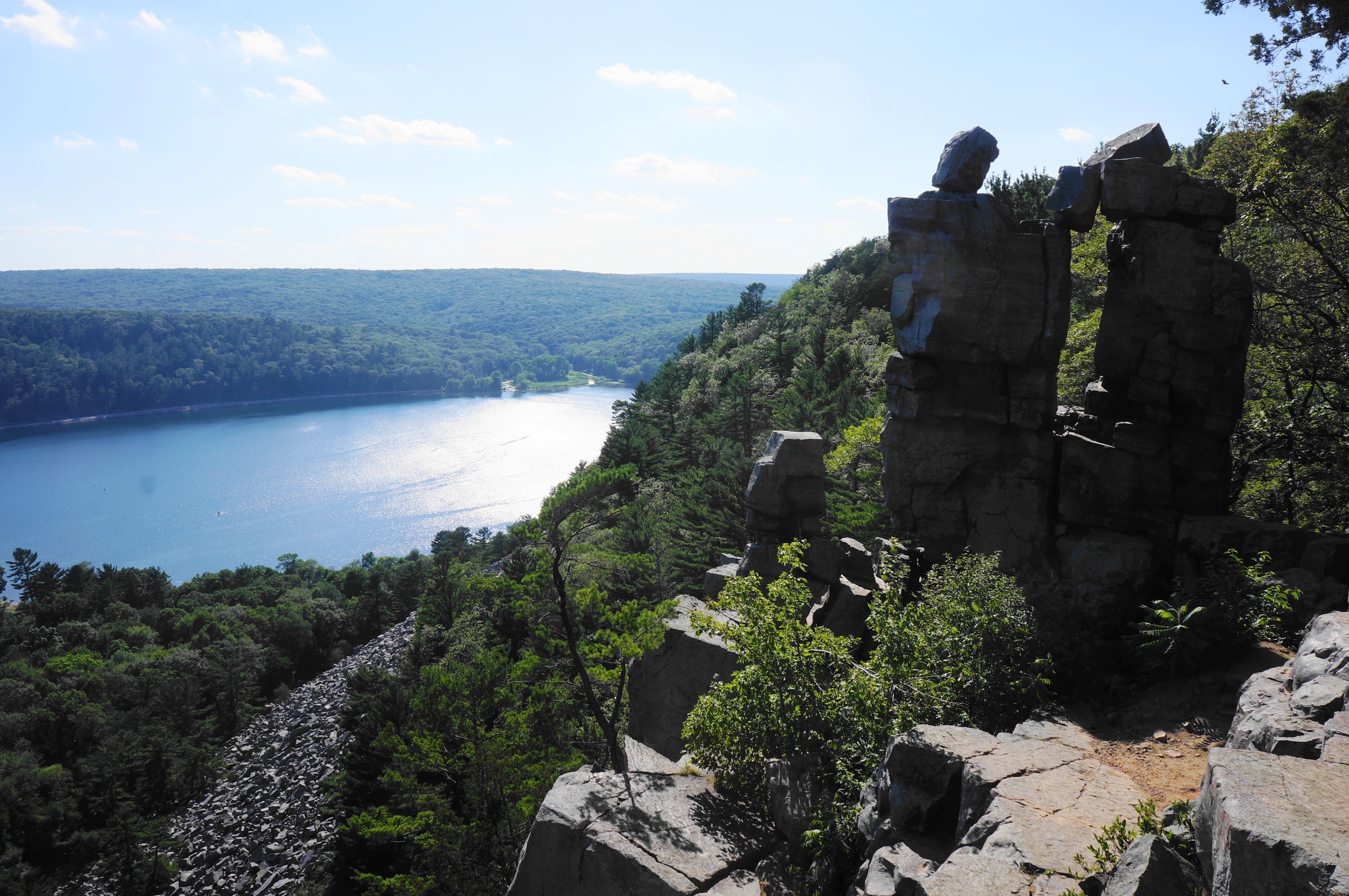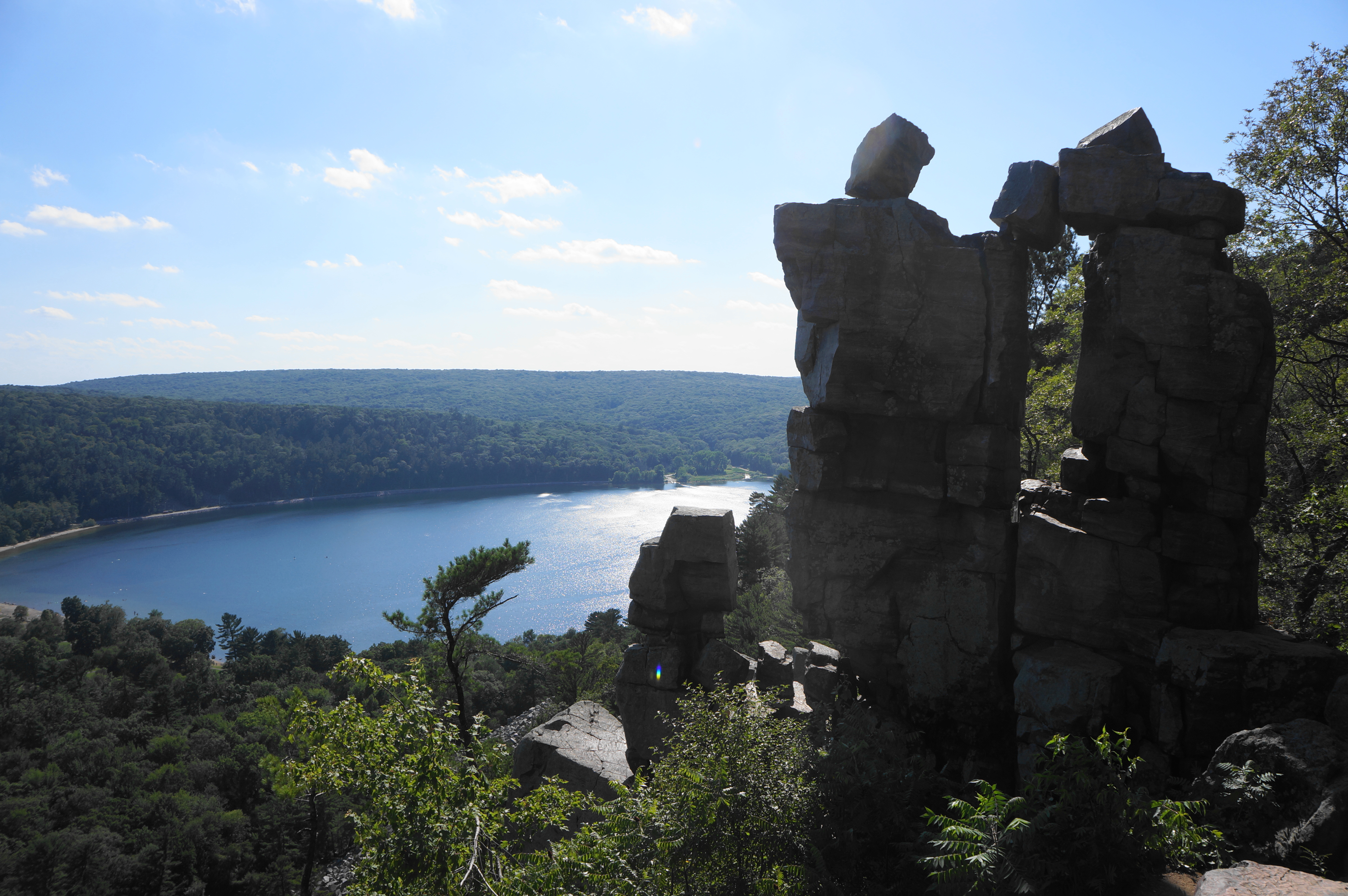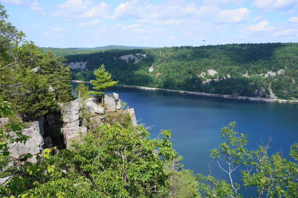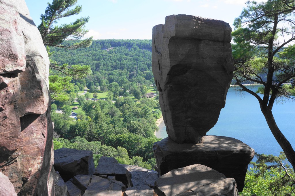 Heading east on the partly paved track, it is an easygoing walk on the East Bluff Trail for 300 yards, with limited views through the trees down to the valley and South Bluff. At 3.7 miles, bear left on the marked spur to Devil’s Doorway, which drops precipitously down a shelf (which may require the use of hands) and then descends steeply to a natural ledge at the precipice of the cliffs. Look to your right, where an impressive collection of stony blocks has formed a natural archway, high above the lake below: this is Devil’s Doorway, one of the most iconic natural sights in the state of Wisconsin. (Note: The sun is best here in the mornings; by evening the setting sun casts a shadow over the rock face and it is tough to photograph.)