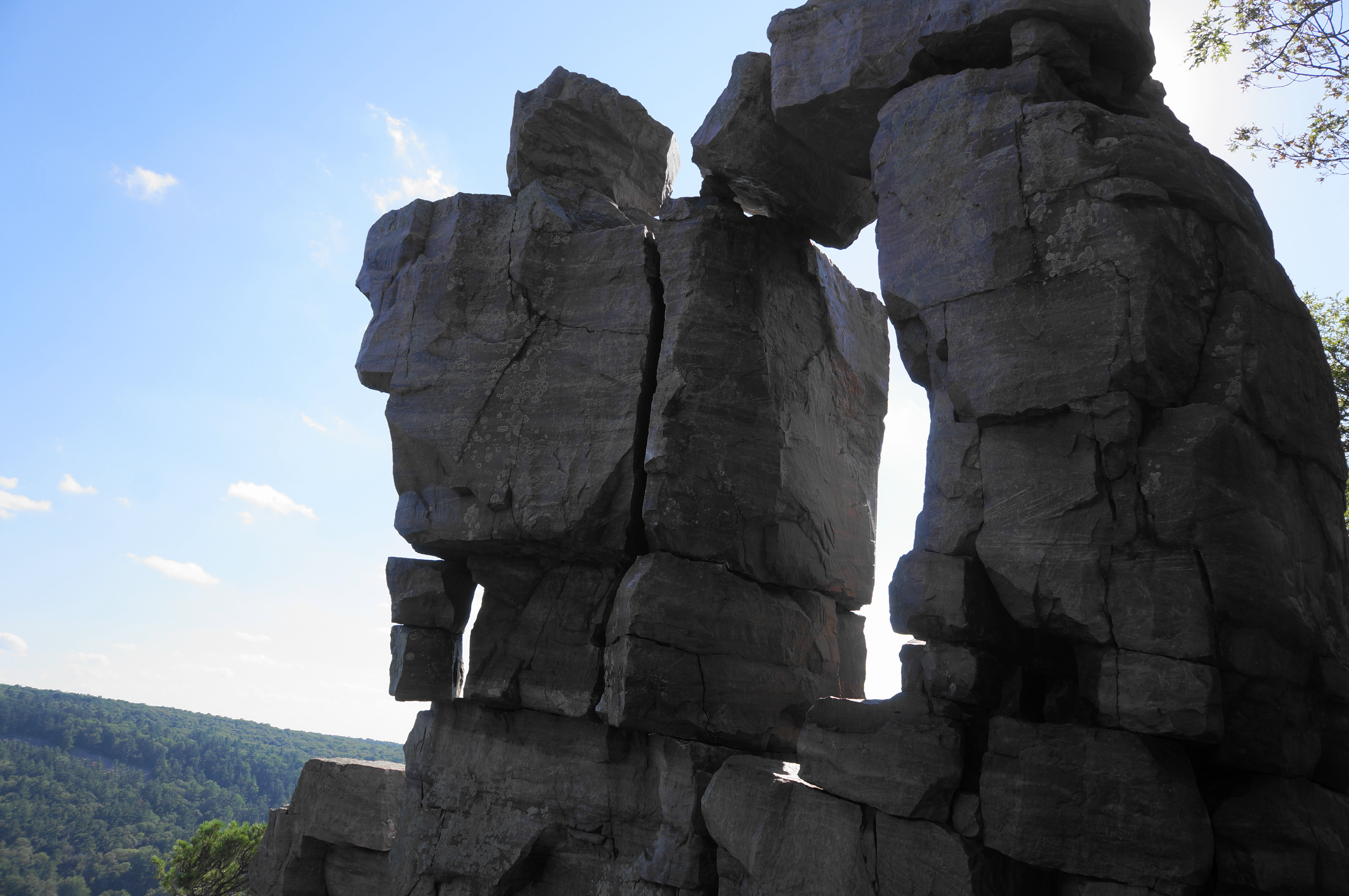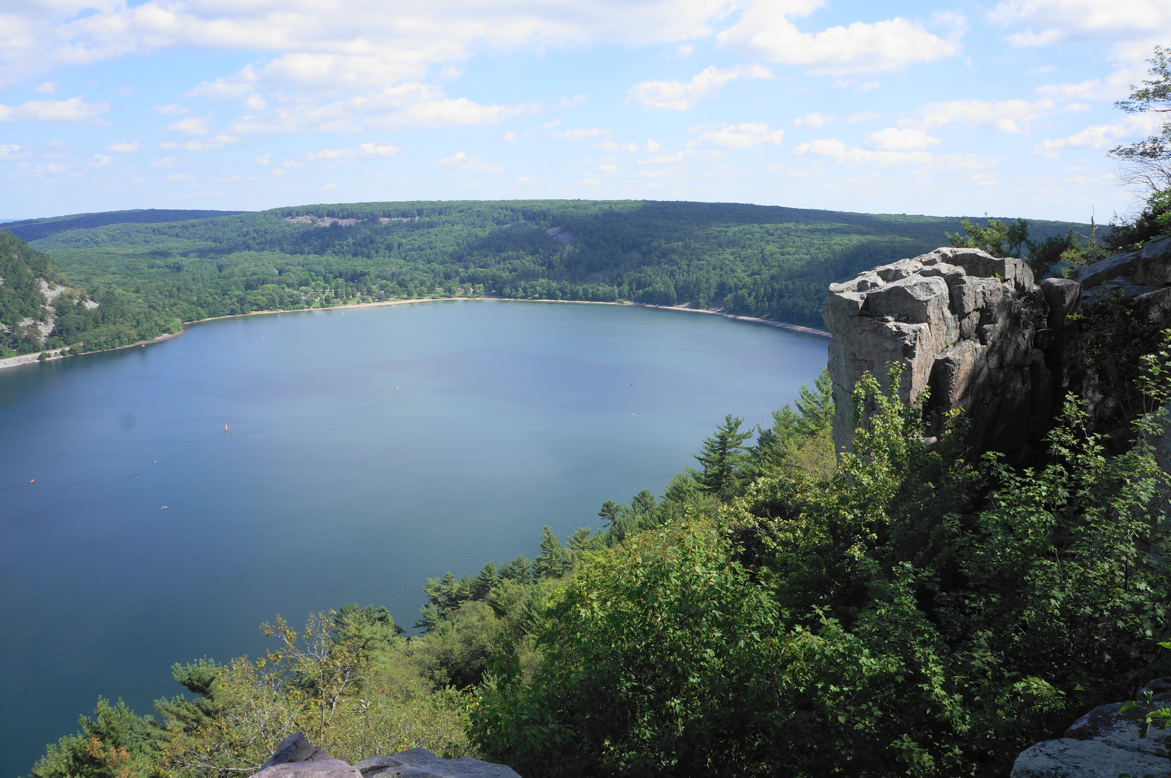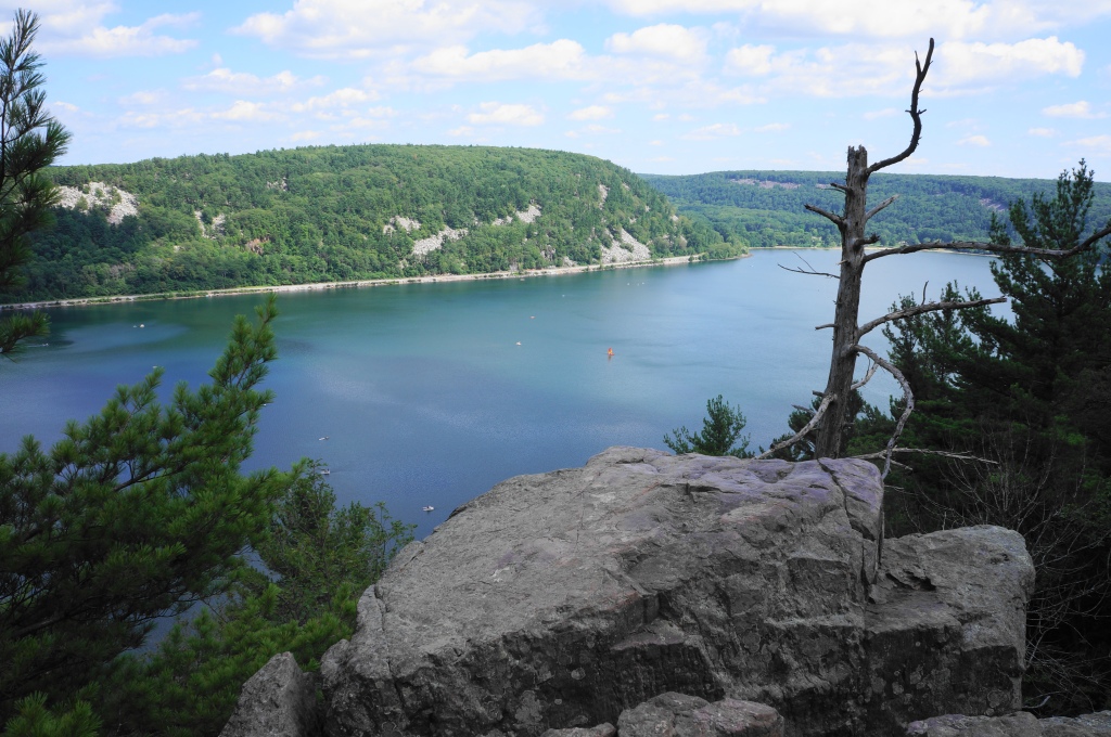 Heading east on the partly paved track, it is an easygoing walk on the East Bluff Trail for 300 yards, with limited views through the trees down to the valley and South Bluff. At 3.7 miles, bear left on the marked spur to Devil’s Doorway, which drops precipitously down a shelf (which may require the use of hands) and then descends steeply to a natural ledge at the precipice of the cliffs. Look to your right, where an impressive collection of stony blocks has formed a natural archway, high above the lake below: this is Devil’s Doorway, one of the most iconic natural sights in the state of Wisconsin. (Note: The sun is best here in the mornings; by evening the setting sun casts a shadow over the rock face and it is tough to photograph.)