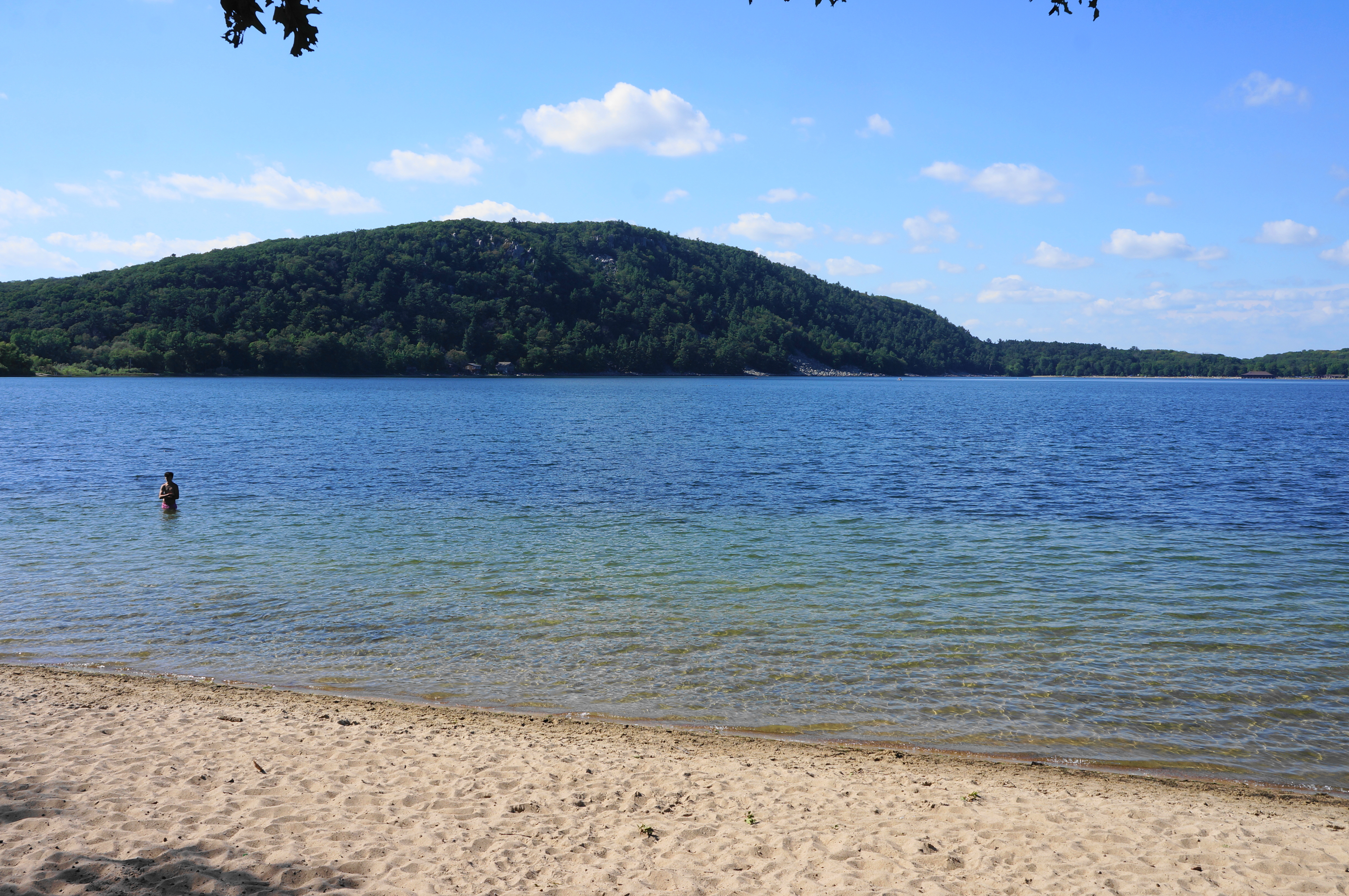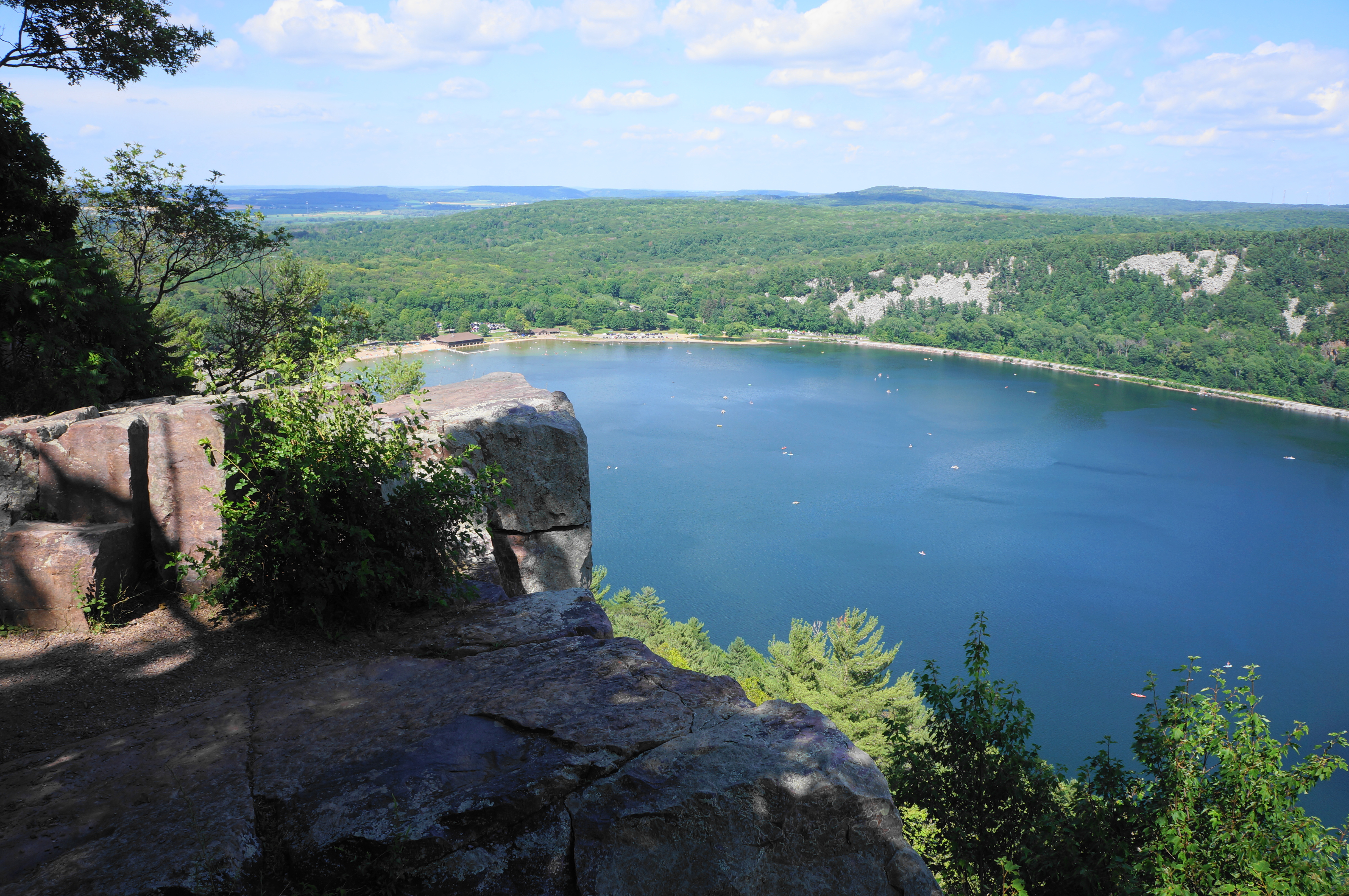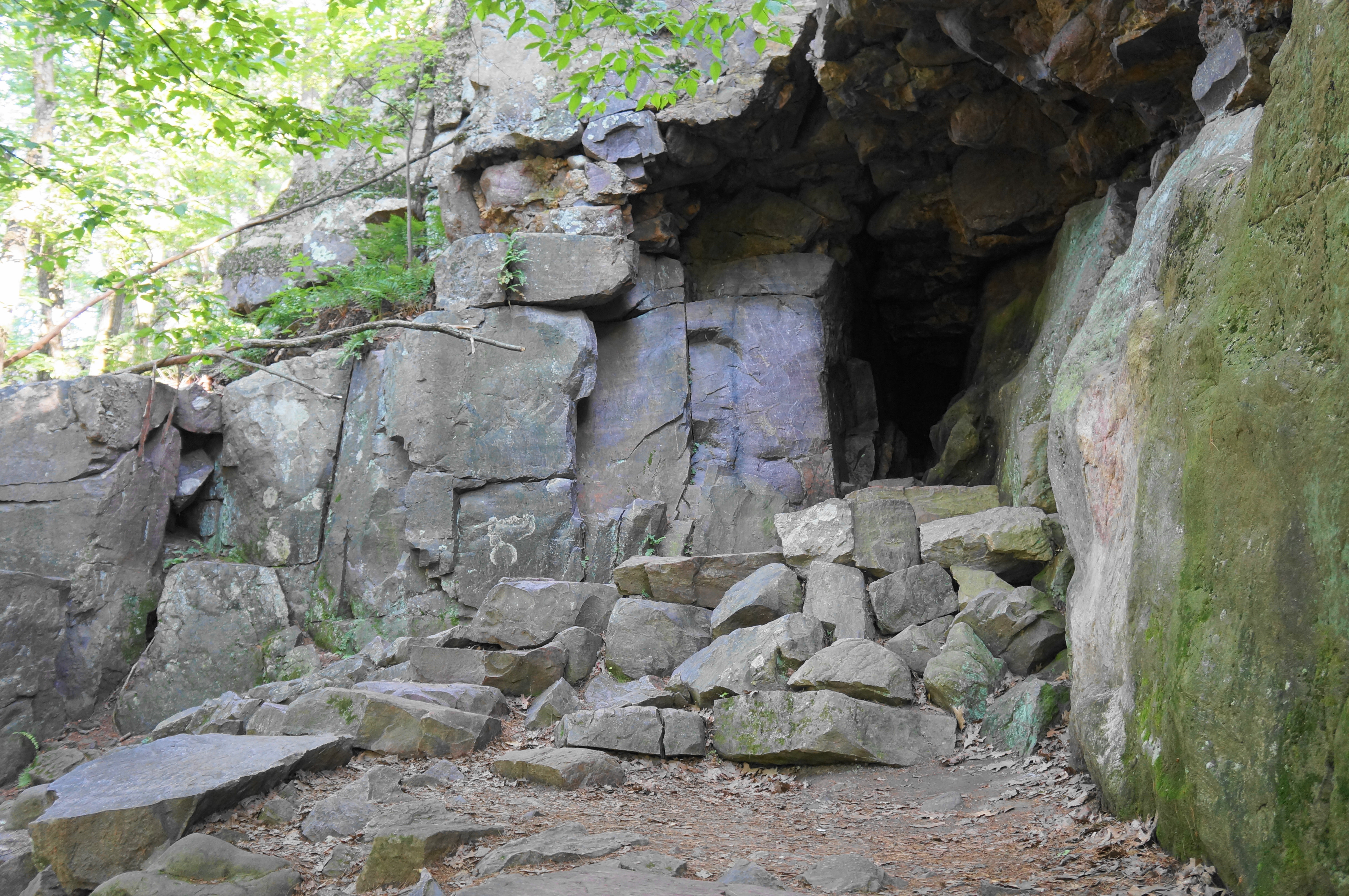 At first the trail keeps its distance from the cliffside and lake, weaving through dense woods and edging northeast. The path comes to a junction again at about 4.4 miles, with an unnamed connector coming in from the right. Stay left and head north, passing occasional rock outcrops and treading progressively downhill. The path comes close to the cliff’s edge again at a point called Pride Rock; vistas become more common as the East Bluff Trail descends further to Bison Rock and rounds a right-hand bend with a small but surprisingly deep cave on the right.