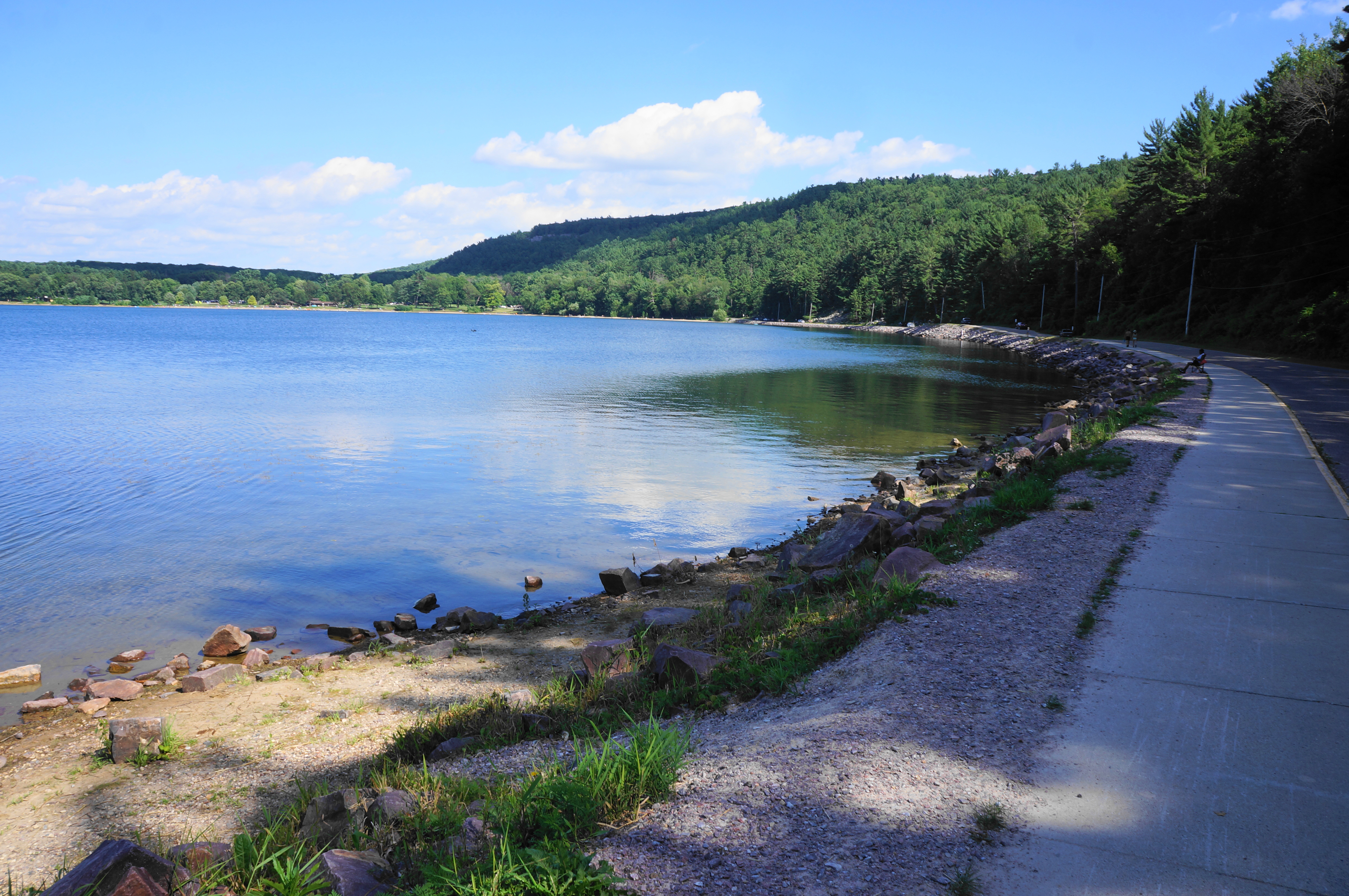Head straight, following the left shoulder of South Lake Road eastward. The road quickly passes a swampy inlet of Devil’s Lake on the left, followed by a road spur to the South Lake Boat Landing and Pet Swim Area. Continue along the road, eventually coming to a more established sidewalk that directly hugs the walled shoreline.