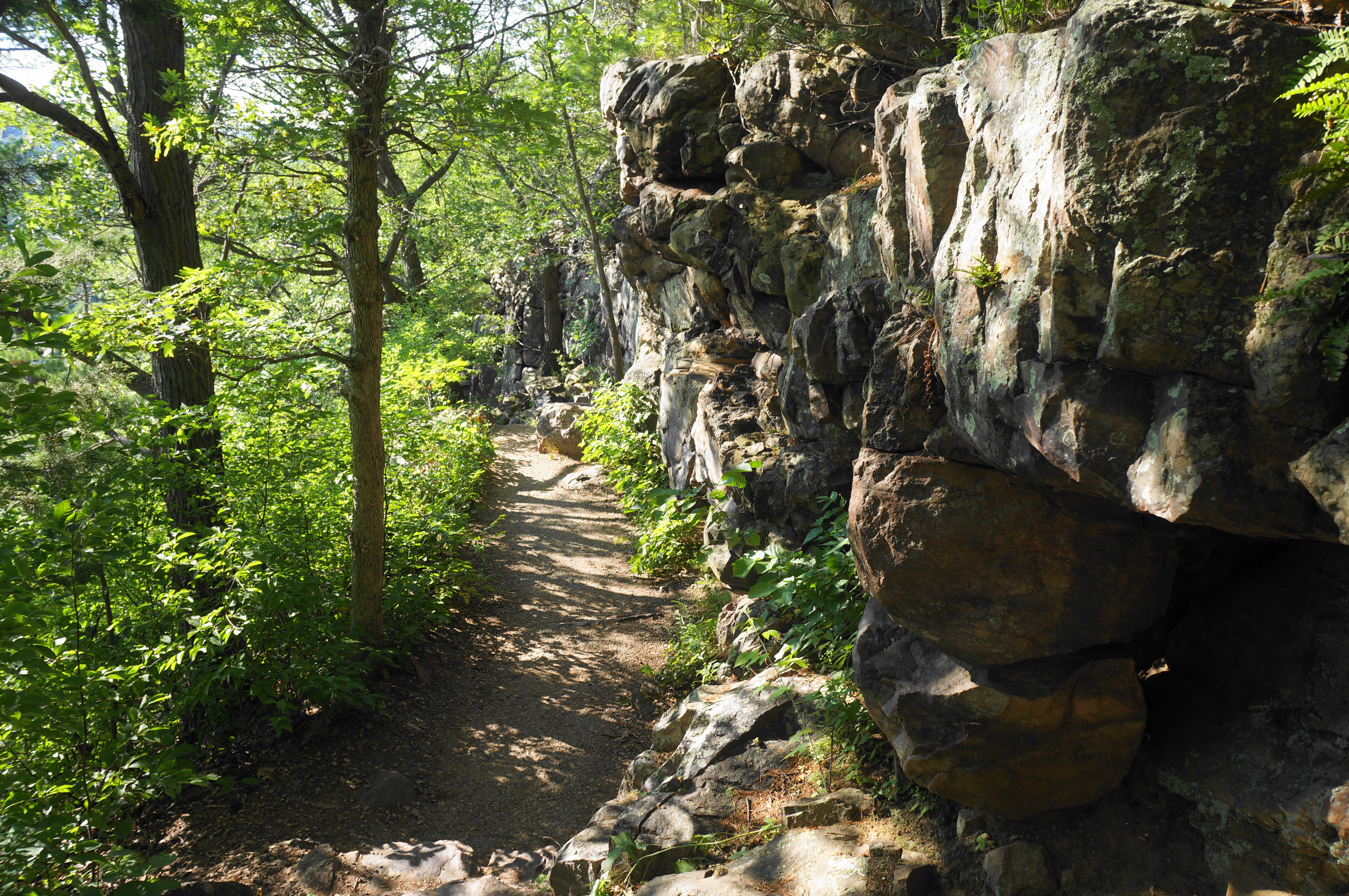 Follow the paved track to its conclusion, at the base of a sloping rock pile of quartzite, the predominant rock type in the area. Here the onward route veers right and turns to crushed gravel, the start of the red-blazed West Bluff Trail. This marks the start of the first of two significant ascents on the hike—though it begins mildly at first as the trail keeps the quartzite slope and a small drainage on the left.