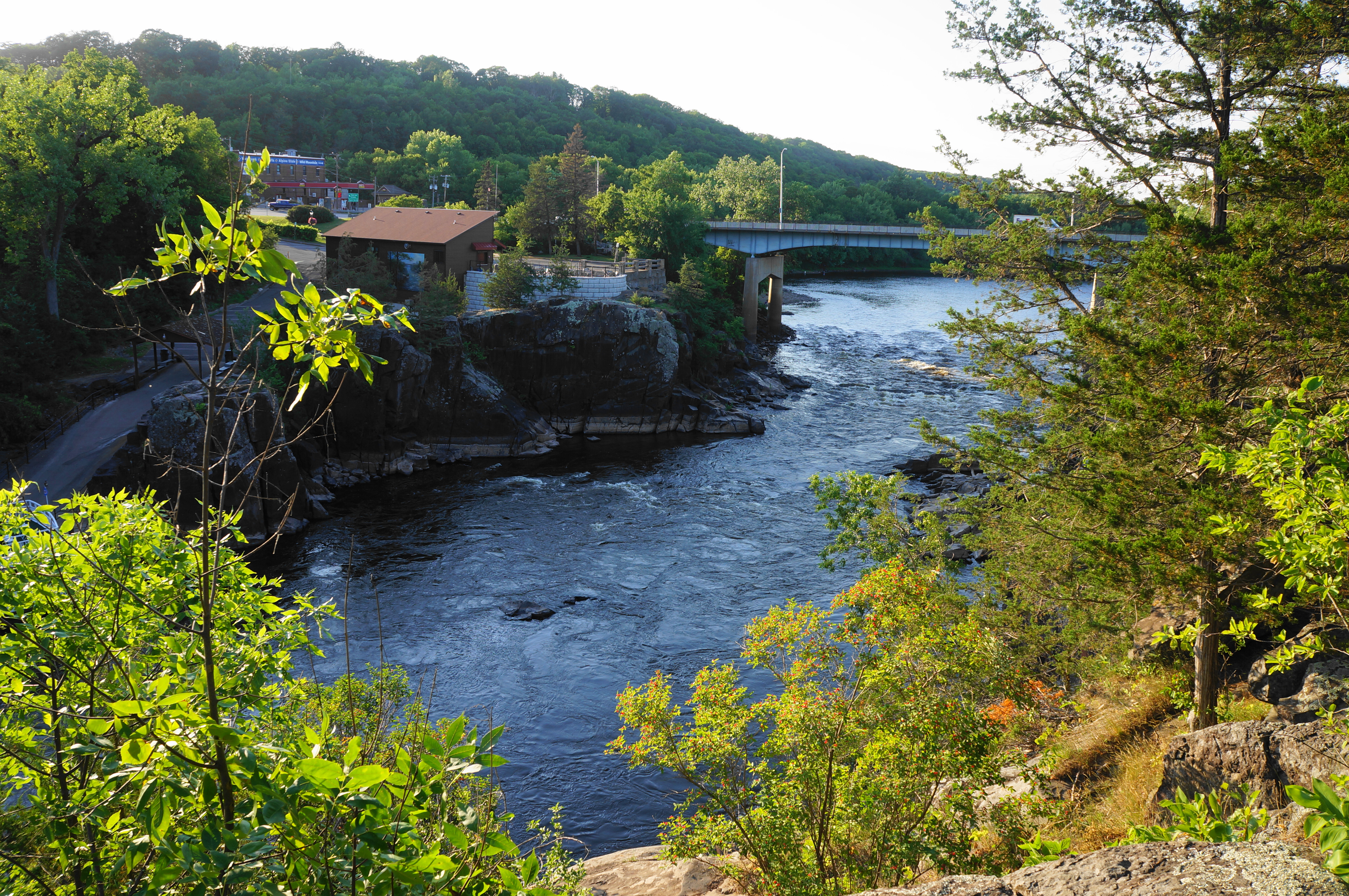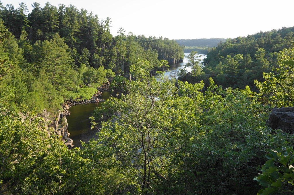 Head west on the gravel-packed trail and stay left at the junction, following the widely-used track as it approaches the cliffside. Basalt boulders abound on both sides of the trail, remnants of an ancient faulting process dating to around one billion years ago. Within 1/10 mile, the Pothole Trail offers its first views of the Dalles of the St. Croix, a narrow gorge carved by relentless water flows at the end of the last Ice Age, when glaciers melted and the riverway carved a deep channel in the basalt. Downstream (south), the river takes an abrupt right turn before widening and easing as the dalles section ends.