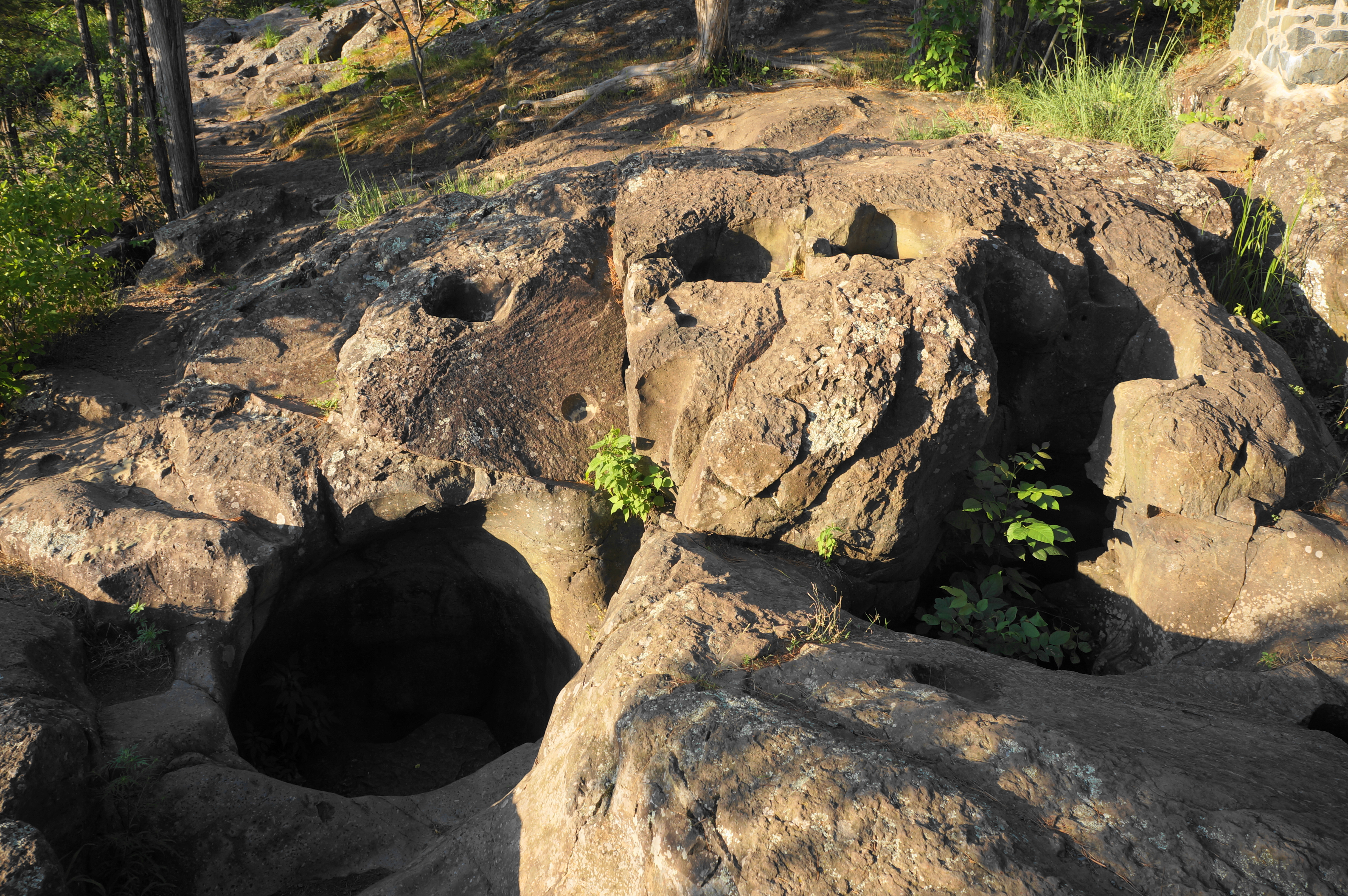 Evidence of ancient lava flows, prehistoric seas, and glacial erosion abounds at the Dalles of the St. Croix, a narrow gorge situated on the border of Minnesota and Wisconsin, about an hour’s drive from the Twin Cities. In addition to the high basalt walls that frame the dalles, the St. Croix River—once much higher and more powerful than it is today—has left behind peculiar potholes, some quite deep, with many dotting the clifftops on both sides of the waterway. Perhaps the best option for seeing them is the Pothole Trail, situated in Interstate Park on the Wisconsin side (not to be confused with Interstate State Park on the Minnesota side). The short, 0.4-mile loop also offers some of the area’s best views down into the gorge.