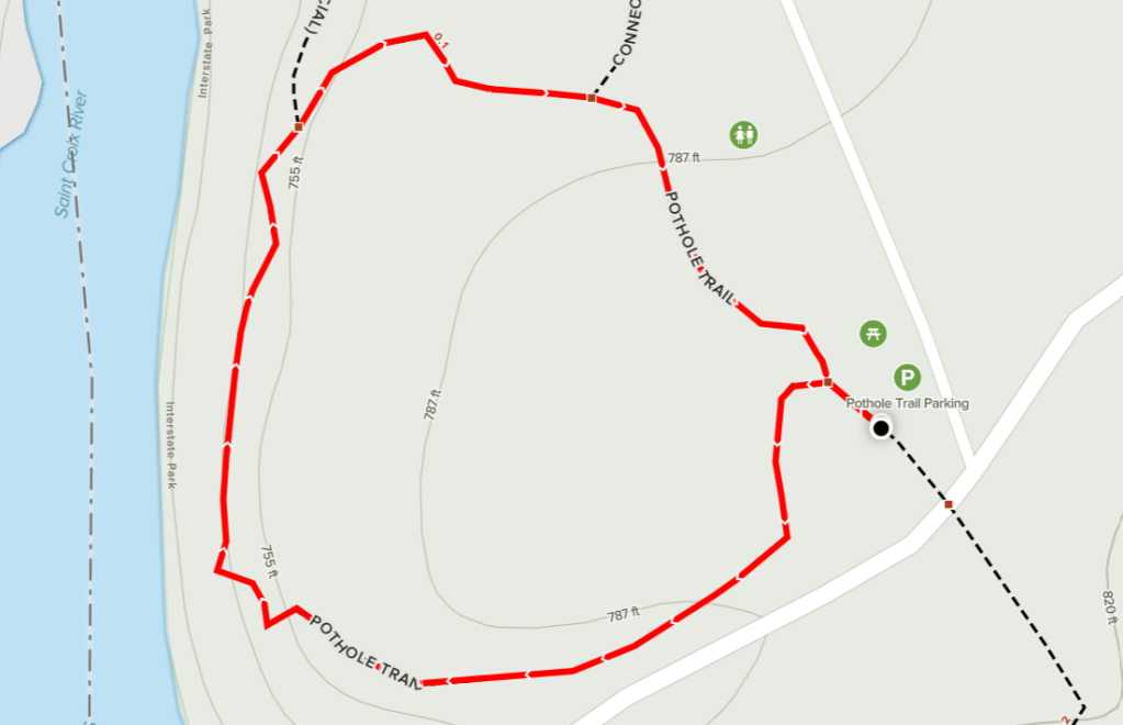 To access the Pothole Trail, enter Interstate Park in St. Croix Falls, Wisconsin, passing the Ice Age Interpretive Center on the left. Continue around a left-hand and right-hand bend, then bear right and park in the small parking area at the intersection of the North Campground road with the main park track. Here one will find signs for the Pothole Trail, which doubles as the end of the long-distance Ice Age National Scenic Trail.