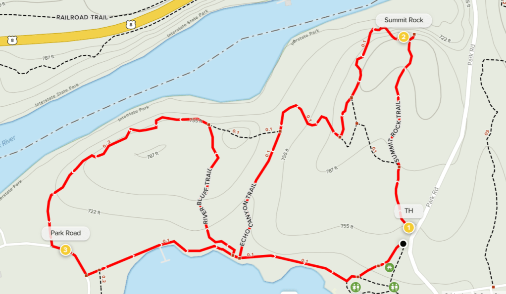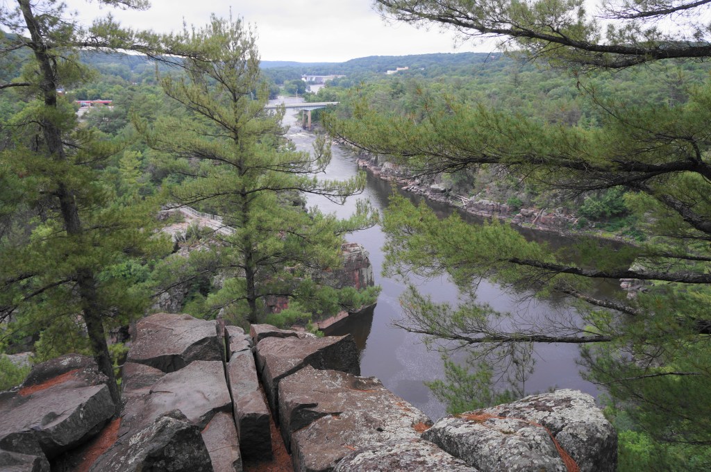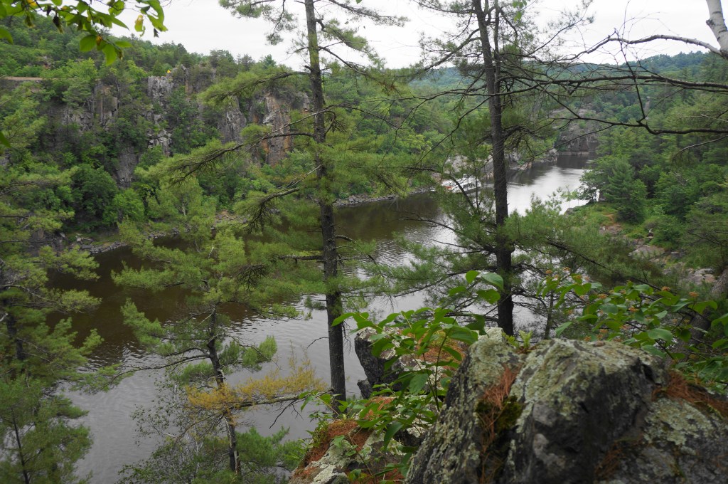Head south from St. Croix Falls, Wisconsin and bear west on Park Road, the main thoroughfare in Interstate Park. Plan to stay on the winding road for about 2.5 miles; just before the beach at Lake O’ the Dalles, bear right and park at the small roadside parking lot for the Summit Rock Trail. South of the narrowest point in the gorge, the Summit Rock Trail explores a perched bluff area above the Dalles, offering the best views of the St. Croix River on the hike.