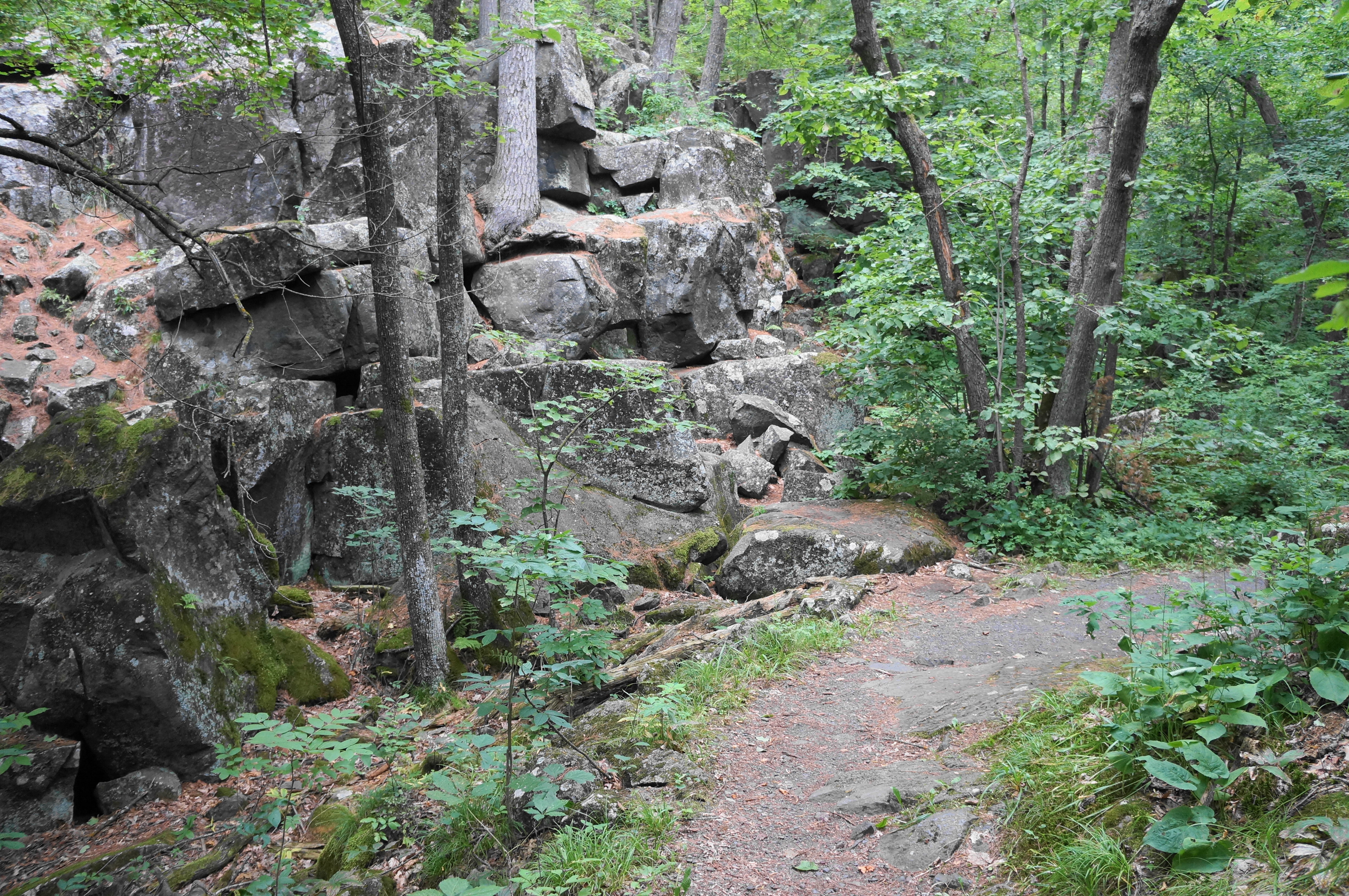 Soon the Summit Rock Trail turns away from the river, finding a break in the cliffs and descending steeply to a junction at 3/10 mile. Head right, then descend additional stairs and bear right again at the next, unmarked fork. By now, hikers are on the graveled Echo Canyon Trail, a confusing track with few views of the river but surprises around every corner amid the labyrinth of basalt notches and outcrops. At around 4/10 mile, look for an arrow pointing left and follow it, avoiding the temptation to drop down what seems like the main trail heading for the riverbank. (Note: If you are approaching the St. Croix by way of a steep descent, this is the wrong way!)