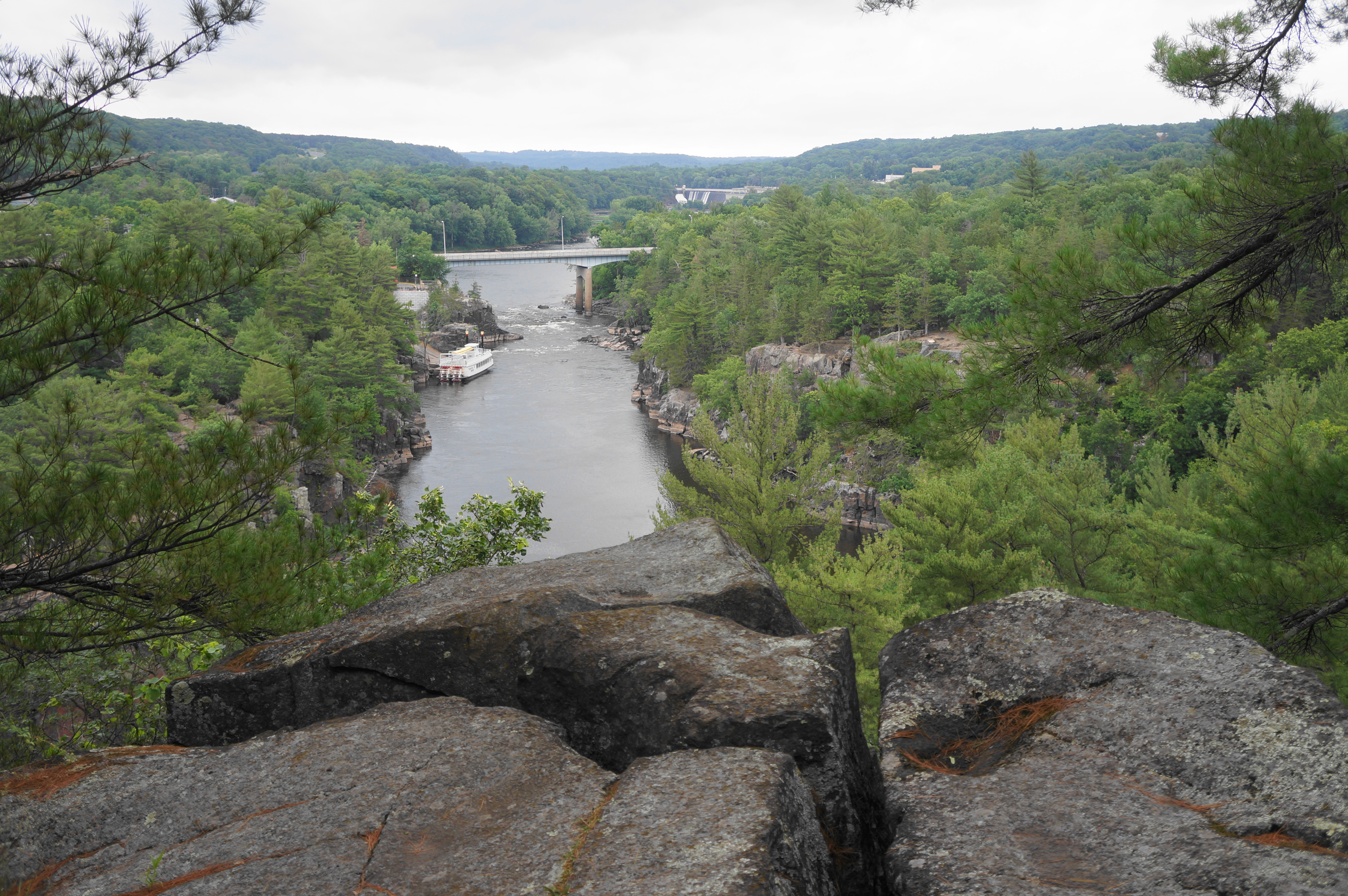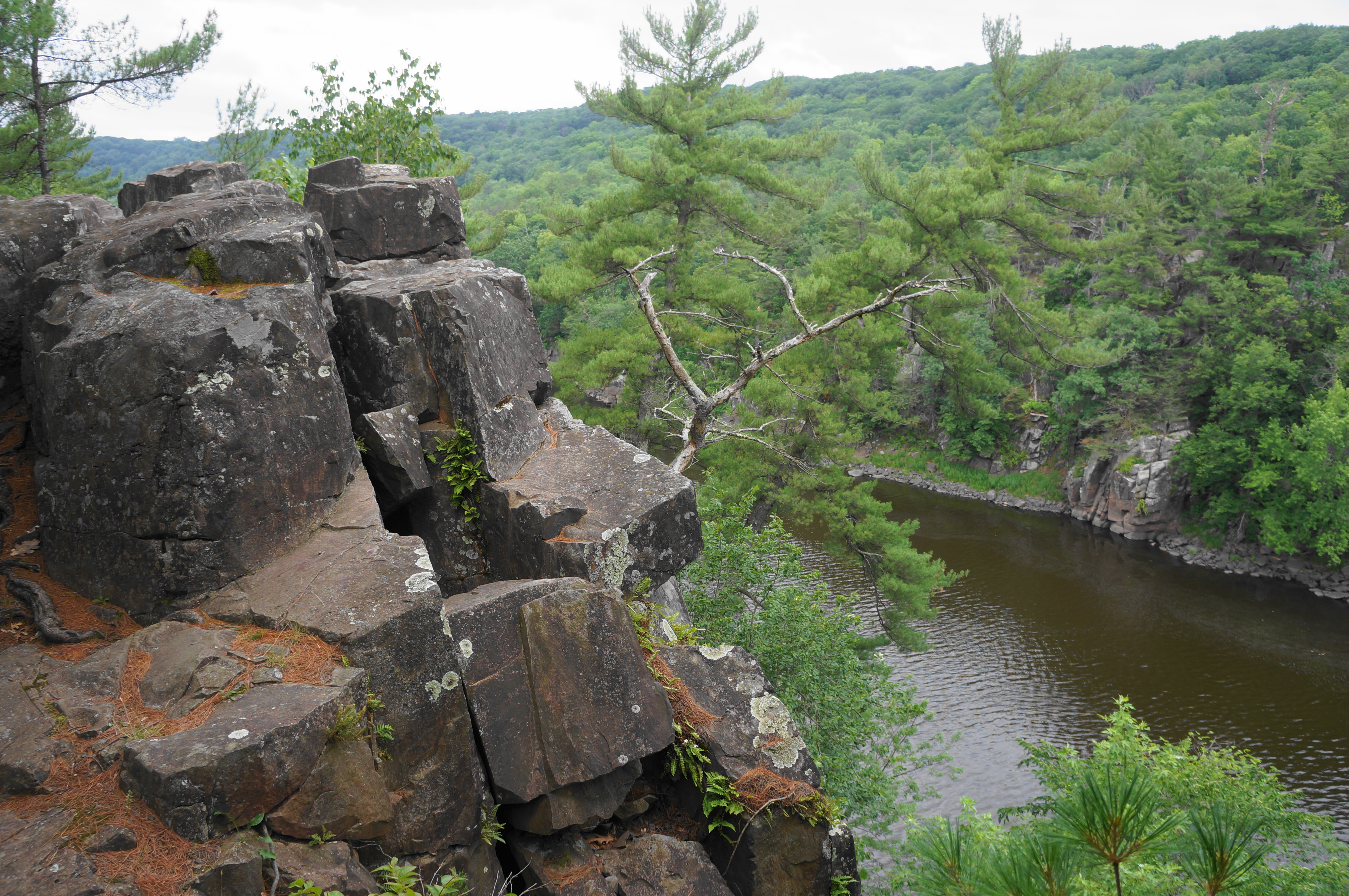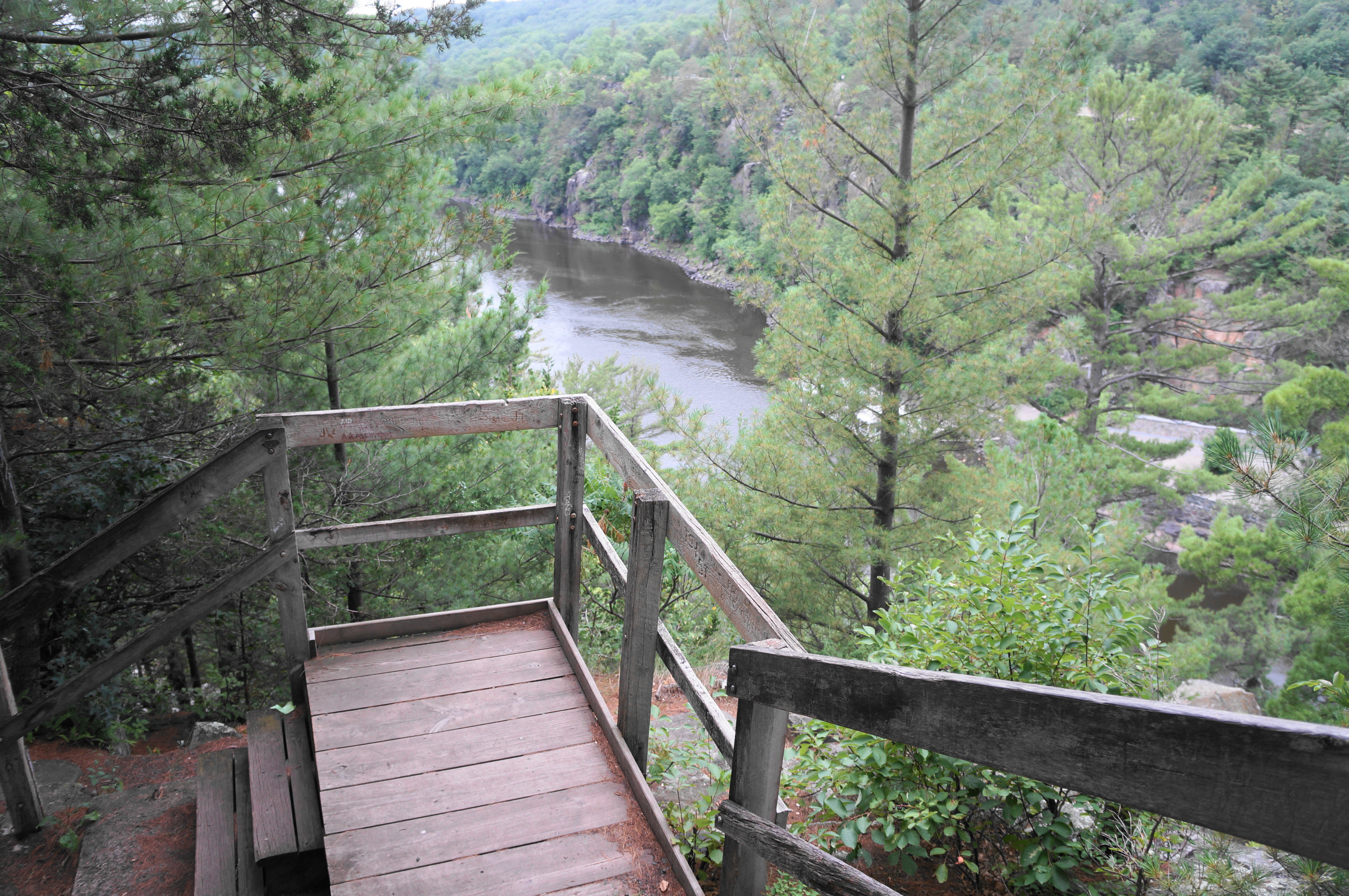 The trail begins by climbing a stone staircase, entering the Dalles of the St. Croix River State Natural Area. The first junction comes at around 100 yards into the hike, and visitors should bear right to see the best views. Make your way through a passage with a mossy basalt outcrop on the left, then climb another narrow staircase as the singletrack comes to a flattop overlooking the Dalles of the St. Croix. This is the most impressive gorge along the St. Croix drainage, though it is visibly dammed upstream. The uplands beyond are part of the quaint towns of Taylors Falls, Minnesota and St. Croix Falls, Wisconsin, largely hidden by the dense deciduous tree cover.
