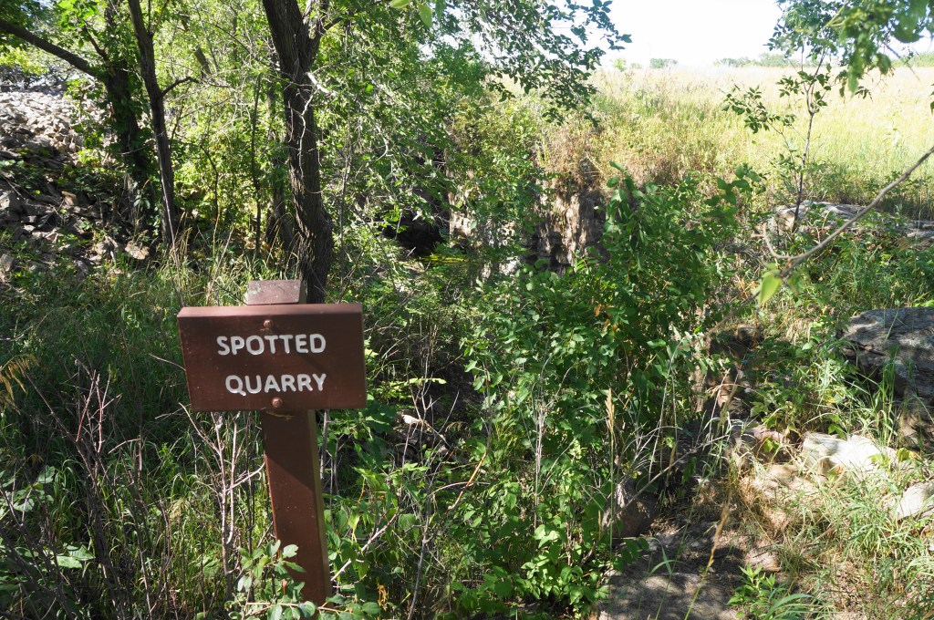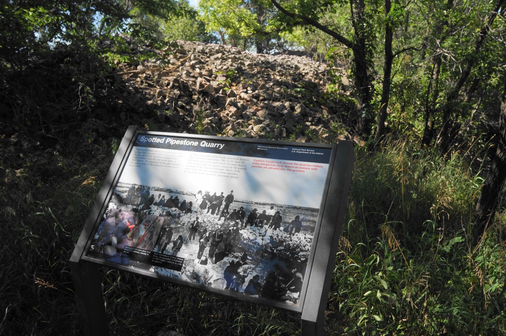 Come to a trail junction at about ¾ mile and stay left, coming within sight of the Visitor Center. The route quickly passes through a strip of exposed quartzite, coming to another fork, where hikers can head right to check out the Exhibit Quarry—an active quarry site where the pipestone layer is exposed—or bear left to check out additional dig sites.