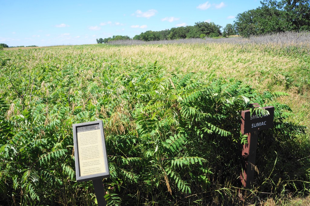 After the quarry, the asphalted route bears right, reemerging into the open, and comes to a dam at the base of Lake Hiawatha, a reservoir on Pipestone Creek built by the Civilian Conservation Corps in the 1930s. Off to the left is a field of smooth sumac, which turns a vibrant red in the fall. As an interpretive sign points out, a cottonwood tree in the distance was used in a religious ceremony called the Sun Dance.