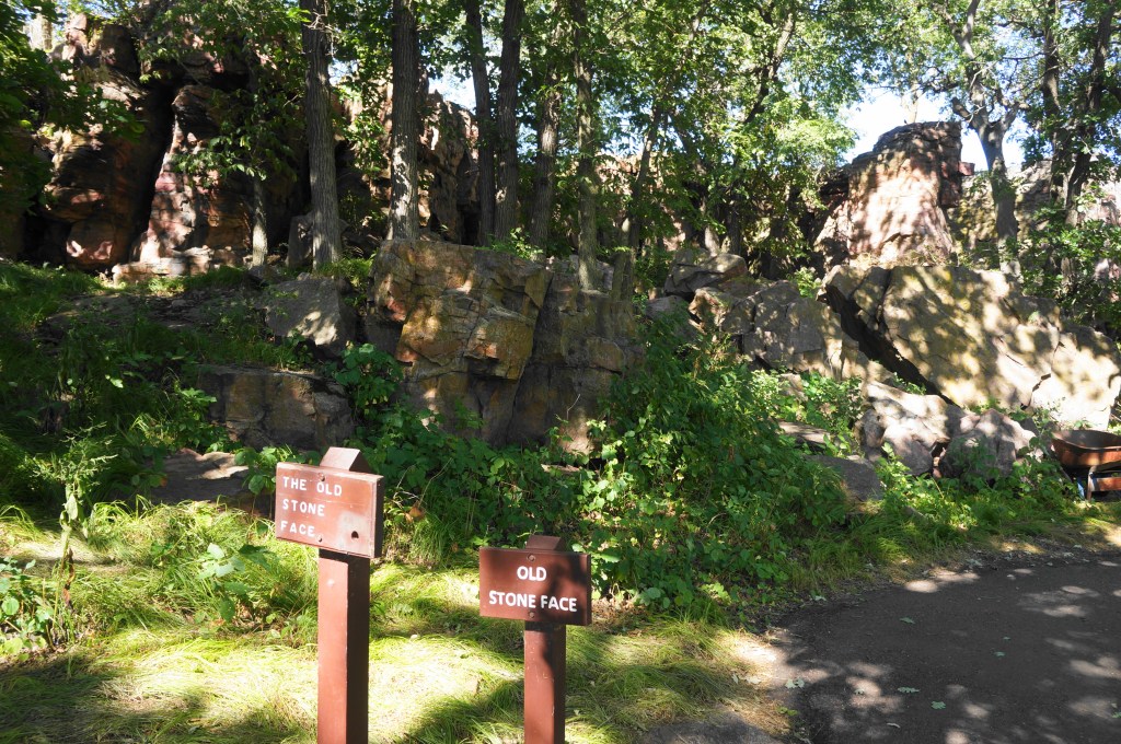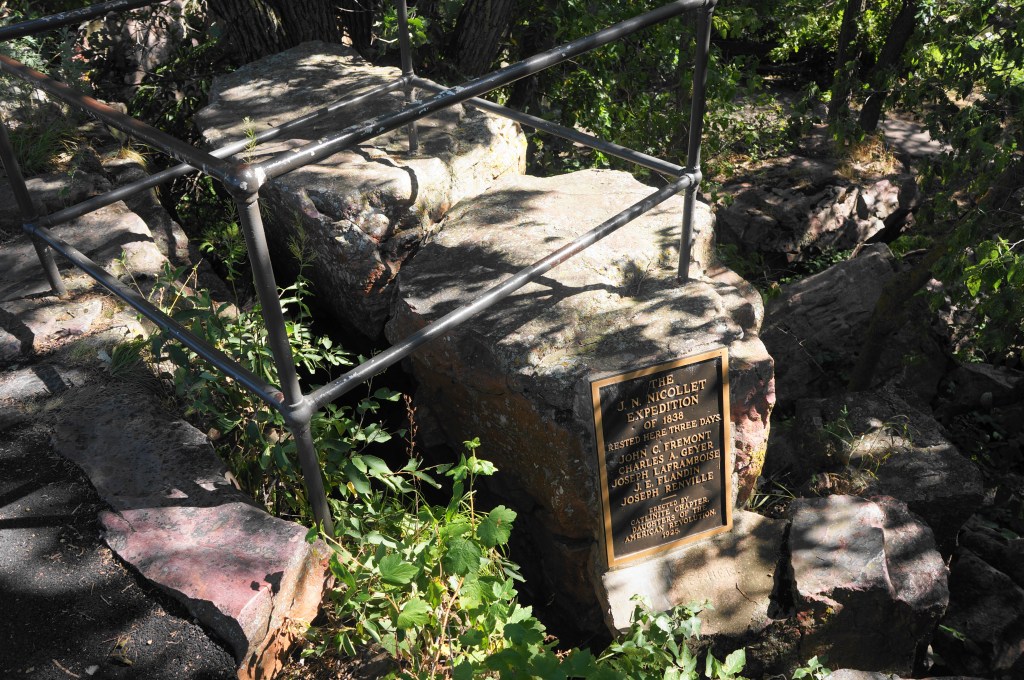 Parallel the creek as the trail approaches the quartzite cliffs, reentering a shaded section where the route splits. Head left on this minor diversion, which climbs around an outcrop called the Old Stone Face. The trail ascends to the rim of the cliffs, with a field off to the left, and soon comes to the Nicollet Marker, a stone inscription commemorating a 3-day visit by a U.S. government-sponsored exploration mission in 1838 that included famed explorer, military general, and failed presidential candidate John C. Fremont.