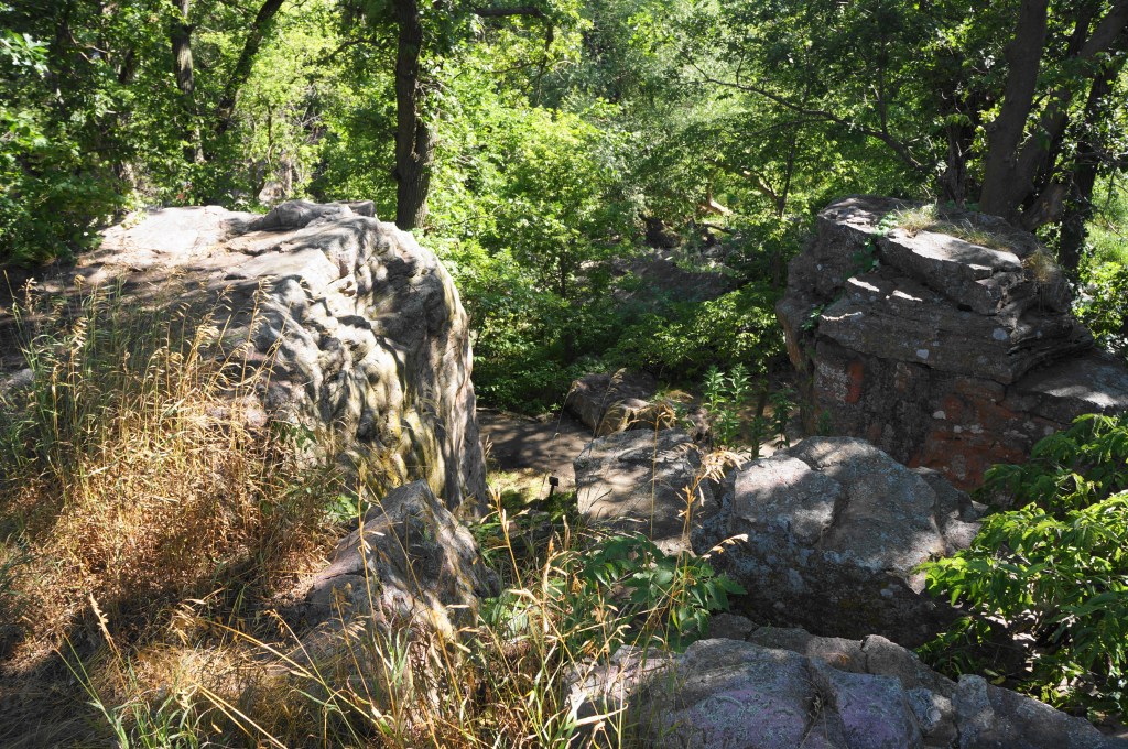 Just beyond the marker is Leaping Rock, a high outcrop that was once site of a dangerous ritual: daring individuals jumped from the cliff to the rock top, 12 feet away; successful leapers would stick an arrow in the stone to celebrate their feat, but those missed sometimes paid with their lives.