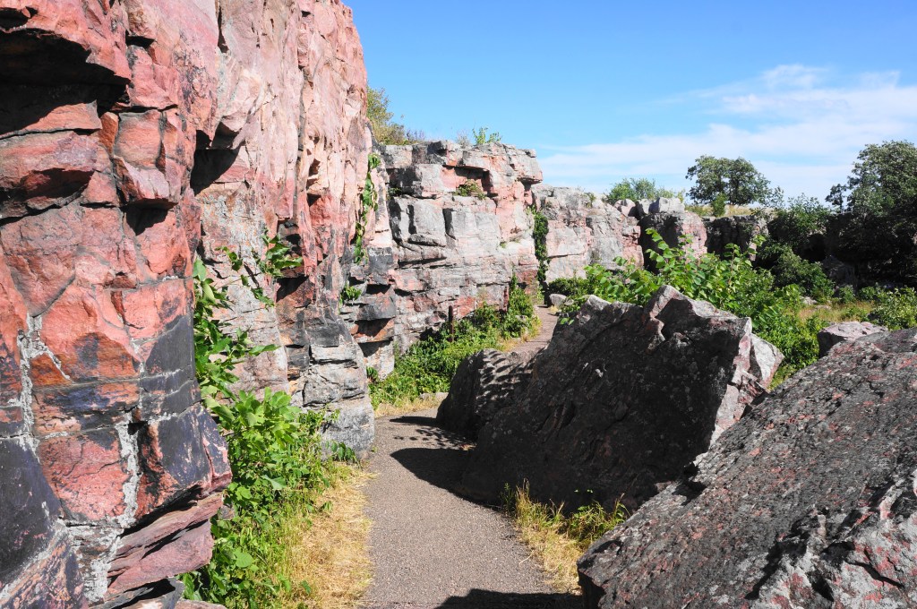 Pipestone National Monument in southwest Minnesota preserves the site of an active pipestone quarry used by the Sioux and other American Indian tribes to craft famed “peace pipes” popularized by groups in the northern plains of the United States. The Sioux Quartzite that predominates in the park dates to the Proterozoic eon, forming a line of bluffs rising to 20-30 feet above the tallgrass prairie, at one point forming a drainage that produces Winnewissa Falls, a pretty 20-foot plunge. The area thus mixes natural beauty with historic significance and is best experienced on the ¾-mile Circle Trail, the main walk in the park.