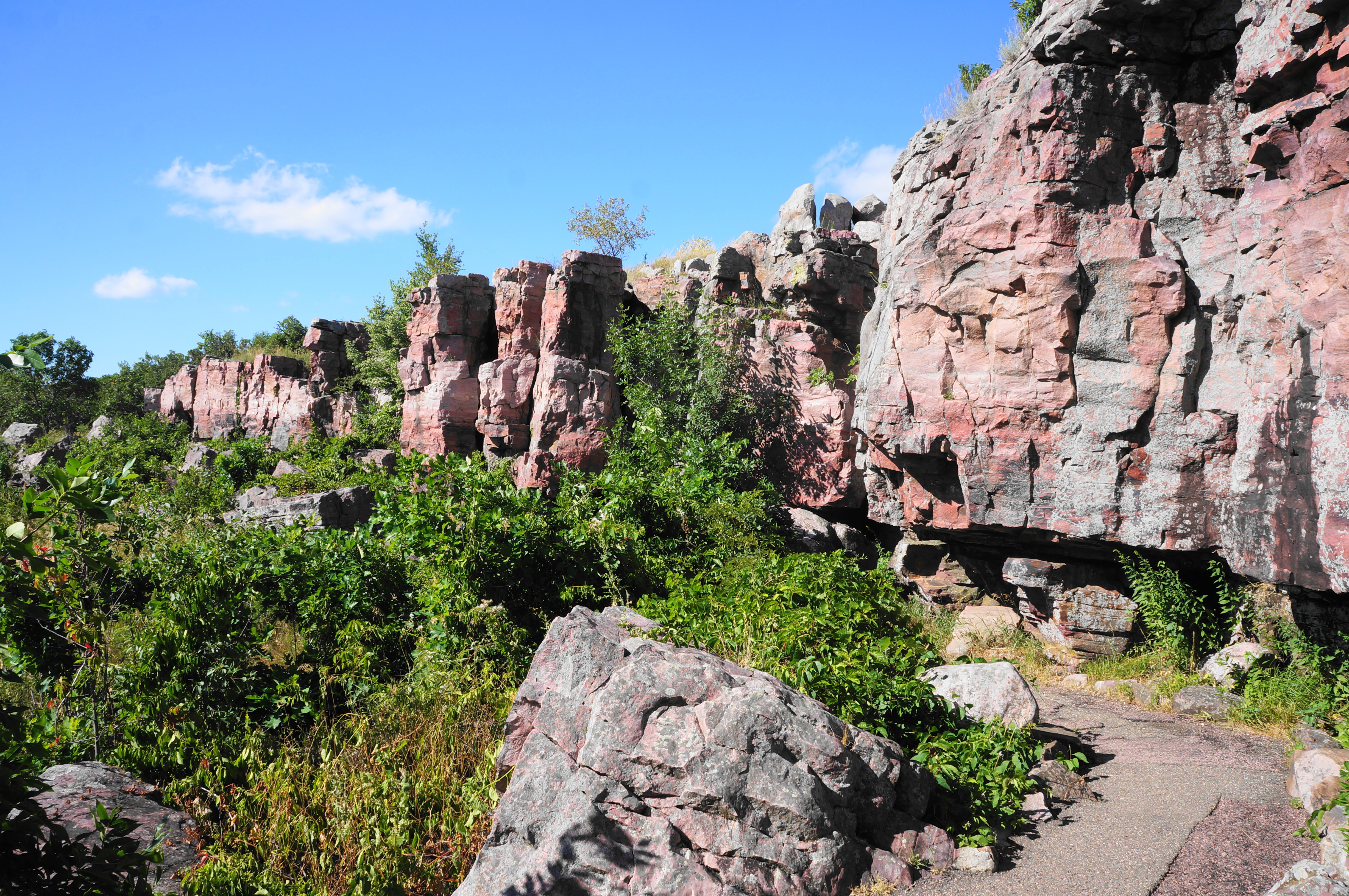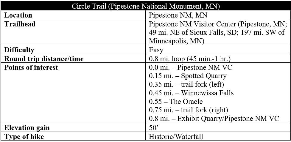 Pipestone National Monument in southwest Minnesota preserves the site of an active pipestone quarry used by the Sioux and other American Indian tribes to craft famed “peace pipes” popularized by groups in the northern plains of the United States. The Sioux Quartzite that predominates in the park dates to the Proterozoic eon, forming a line of bluffs rising to 20-30 feet above the tallgrass prairie, at one point forming a drainage that produces Winnewissa Falls, a pretty 20-foot plunge. The area thus mixes natural beauty with historic significance and is best experienced on the ¾-mile Circle Trail, the main walk in the park.