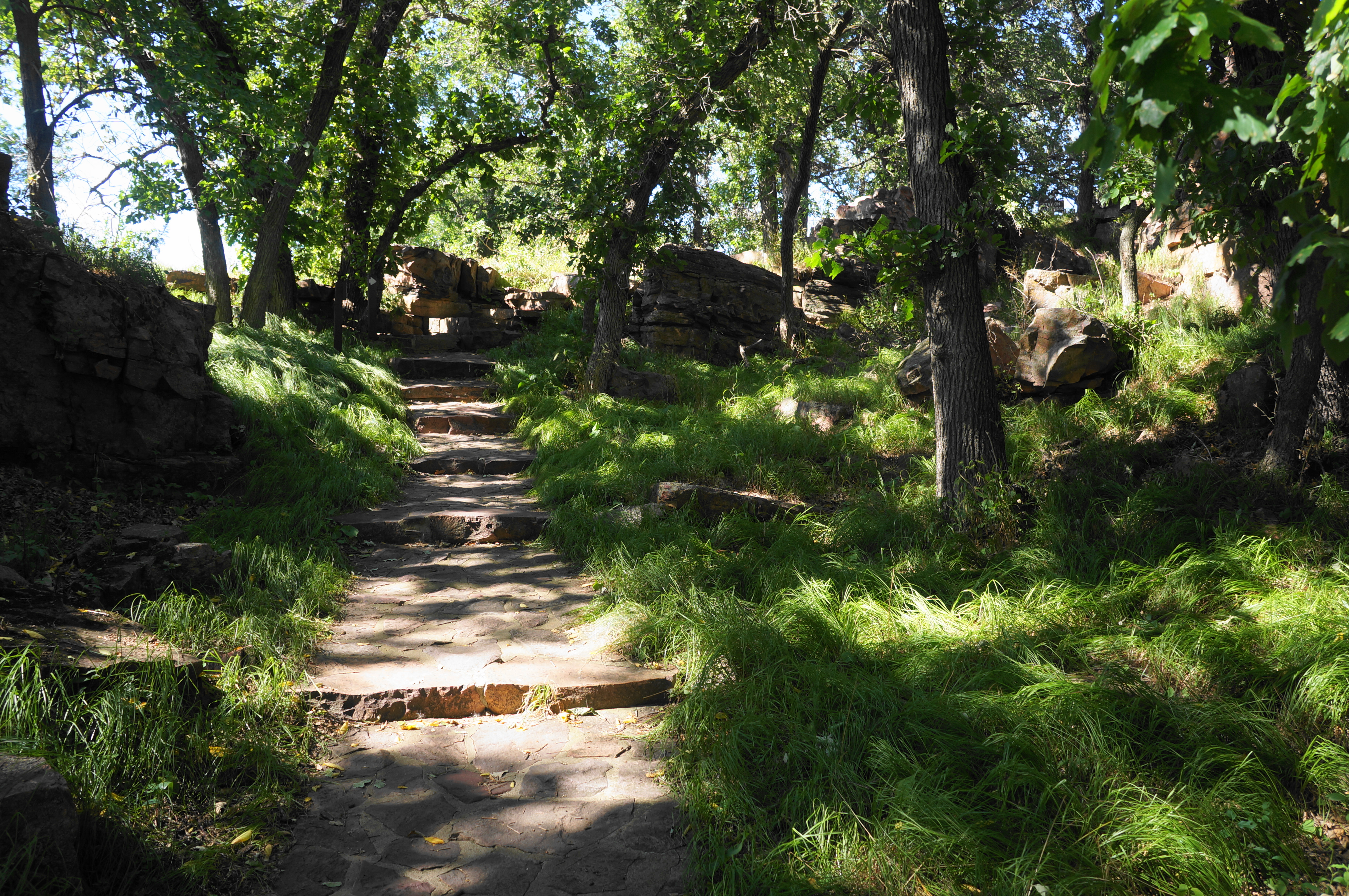 At 301 acres, Pipestone National Monument is the smallest National Park Service unit in Minnesota and the only one in the southwest of the state, near the South Dakota border. Park at the Visitor Center, located about 1.5 miles from the town center in Pipestone, and enter the building for an orientation and chance to talk with active pipe makers. The Circle Trail actually begins by walking through a door out the Visitor Center heading north. (Note: If the center is closed, one can walk around the maintenance area to the north to reach the start.)