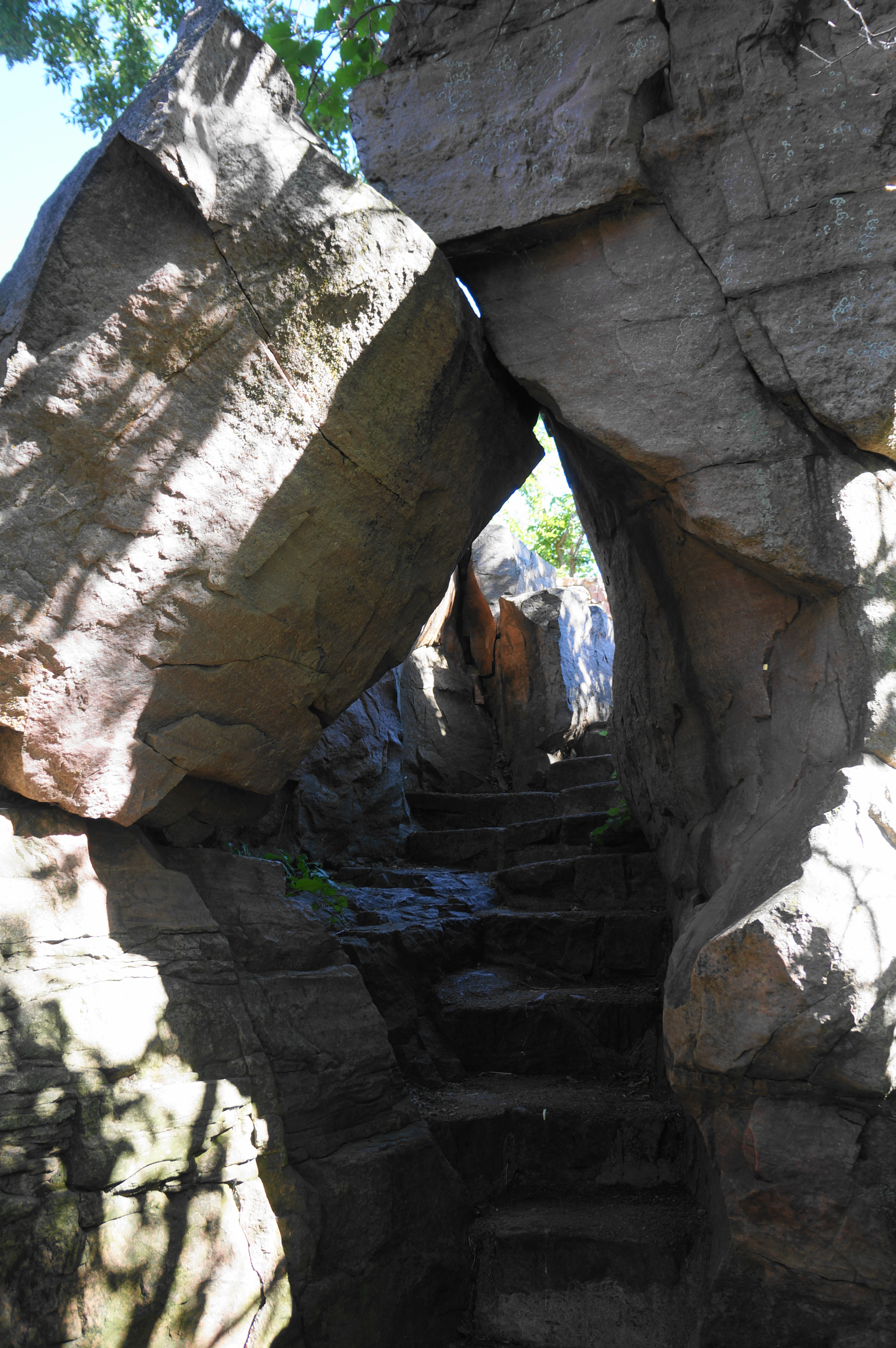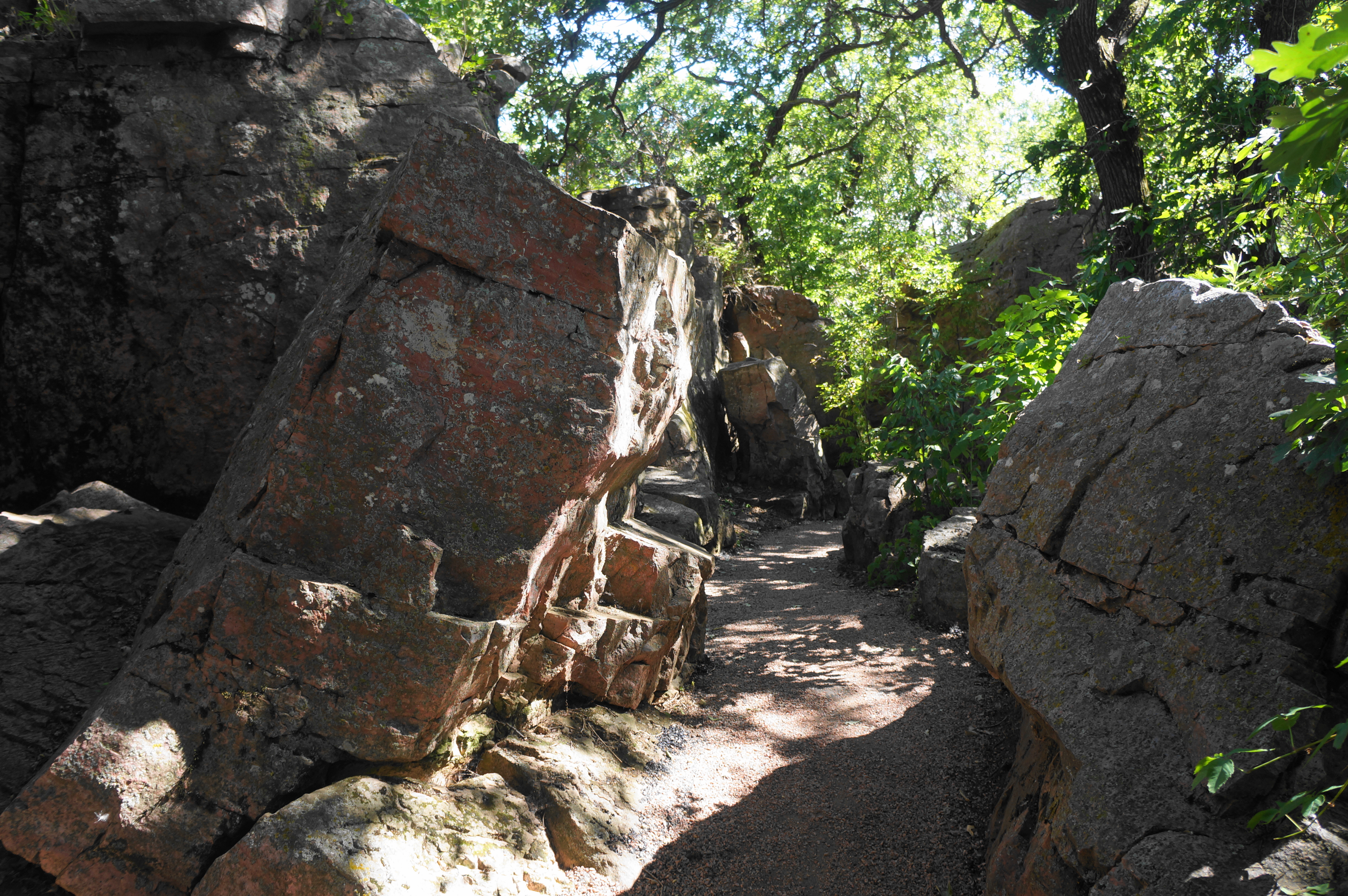 Parallel the creek as the trail approaches the quartzite cliffs, reentering a shaded section where the route splits. Head left on this minor diversion, which climbs around an outcrop called the Old Stone Face. The trail ascends to the rim of the cliffs, with a field off to the left, and soon comes to the Nicollet Marker, a stone inscription commemorating a 3-day visit by a U.S. government-sponsored exploration mission in 1838 that included famed explorer, military general, and failed presidential candidate John C. Fremont.