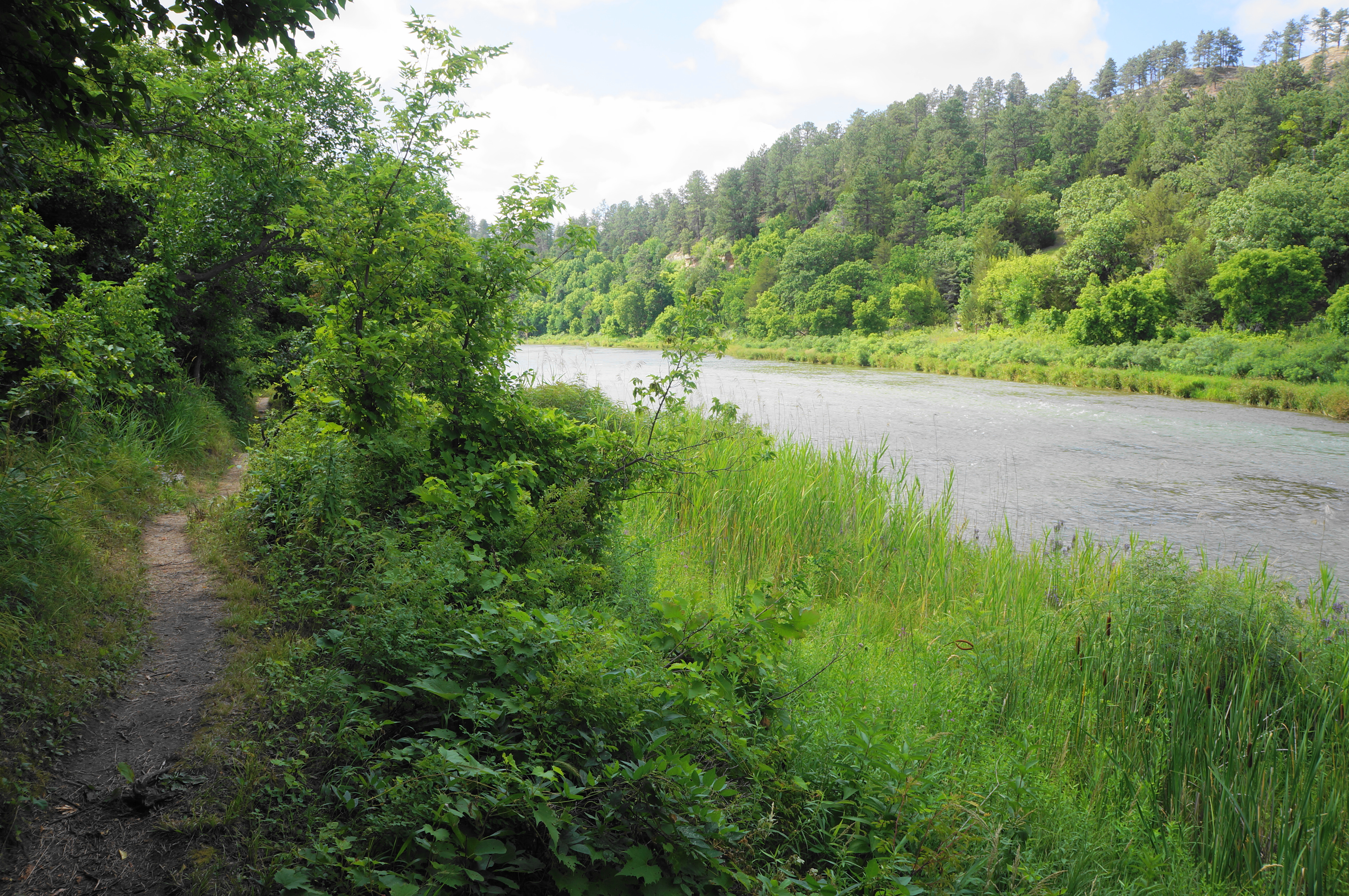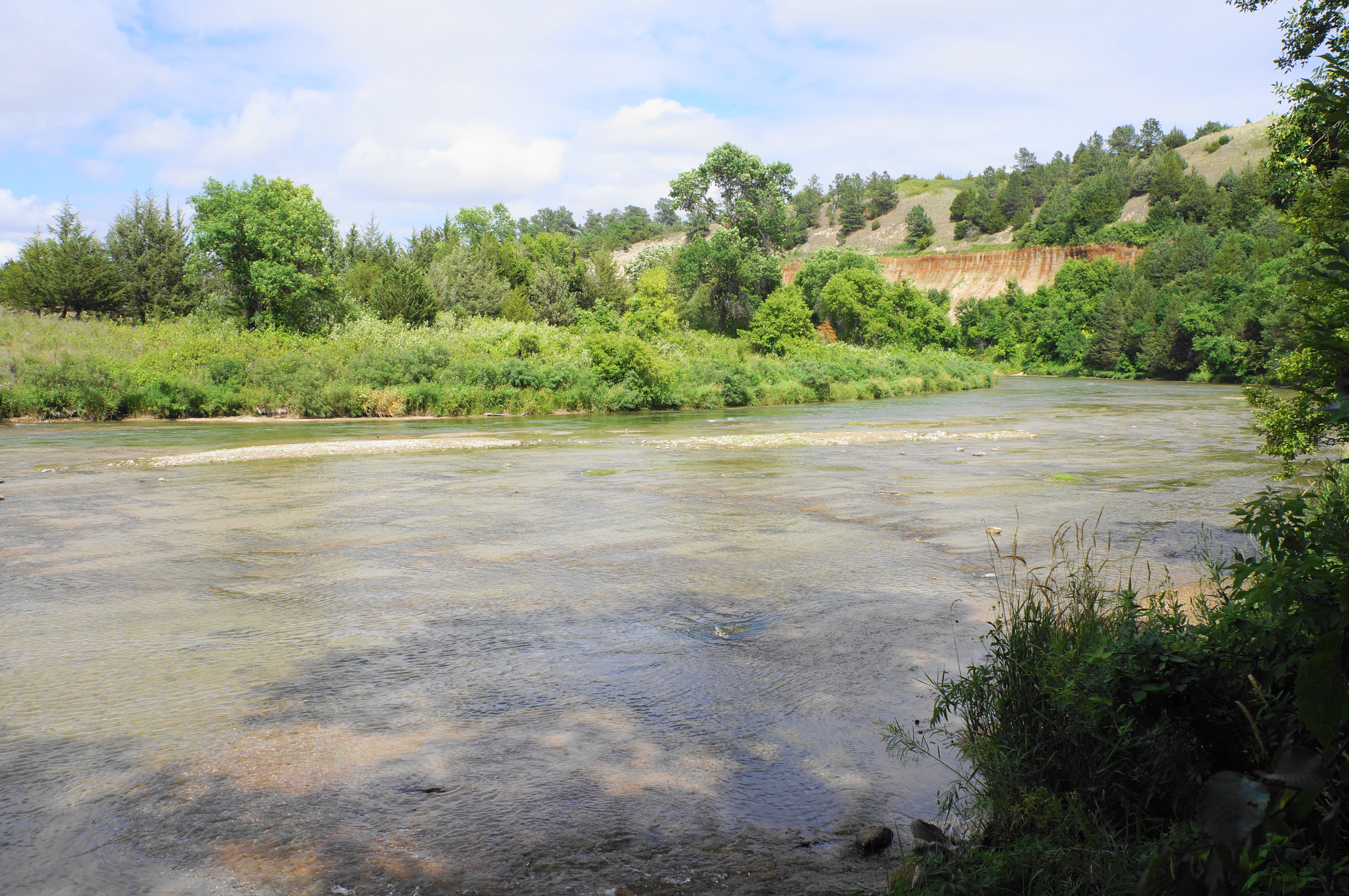 It’s perhaps a little anticlimactic to reach the showstopper of the hike in the first 1/10 mile, but the onward Fort Falls Trail remains pleasant and worth following to complete the 8/10-mile circuit. From the base of the falls, the narrow track—now dirt—continues to parallel the creek as it flows downstream. A little over 100 yards from the falls, the trail reaches the banks of the Niobrara River and a trail sign for Fort Falls; the onward path bends west (left) here, below the chalky sandstone cliffs.