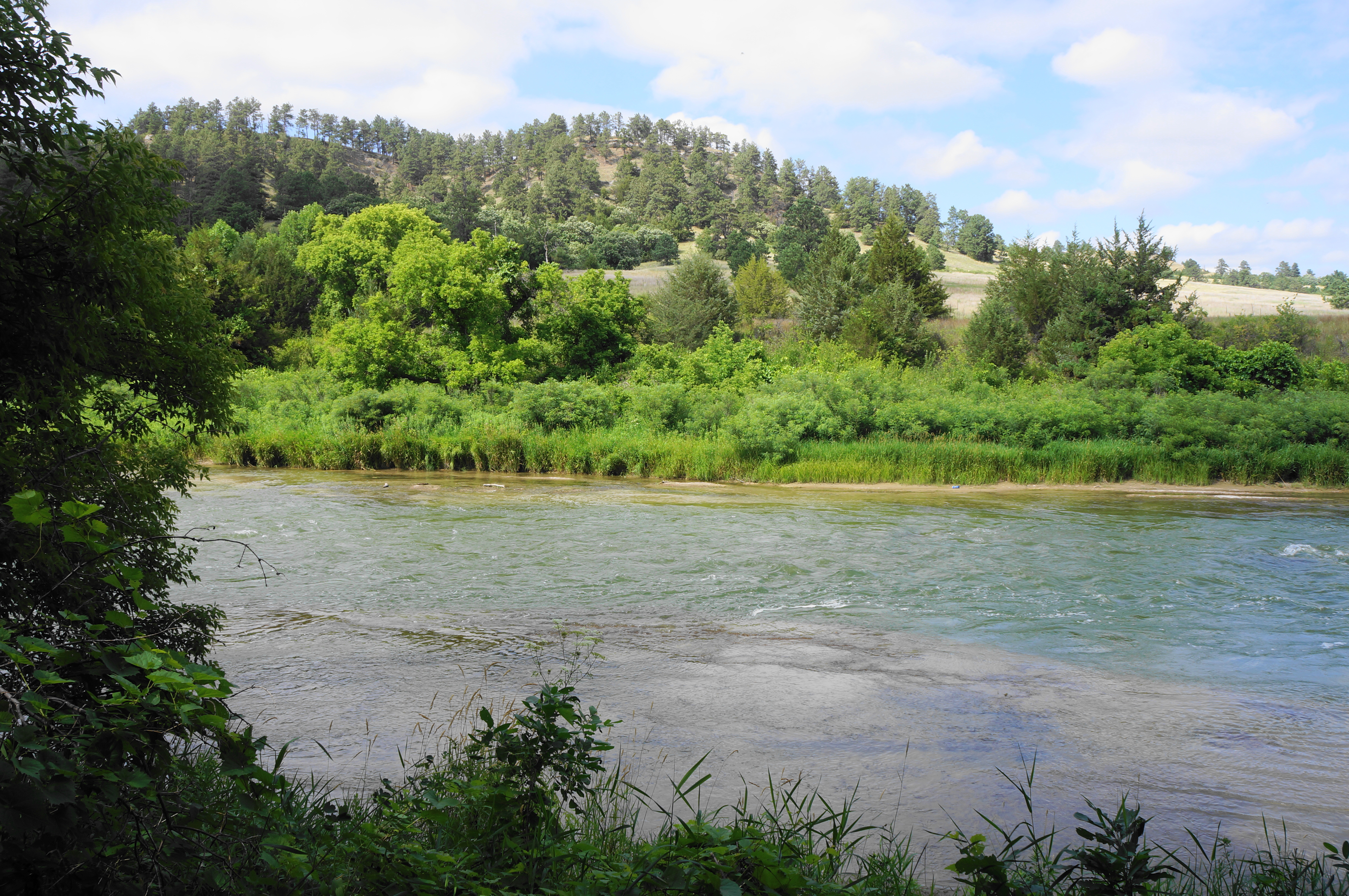 The view of Fort Falls is partly obscured by the dense thicket, but the contours of the snaking waters are clear. The waterfall was formed by a weakness in the Valentine Formation that is capped by the harder siltstone of the Rosebud Formation.
