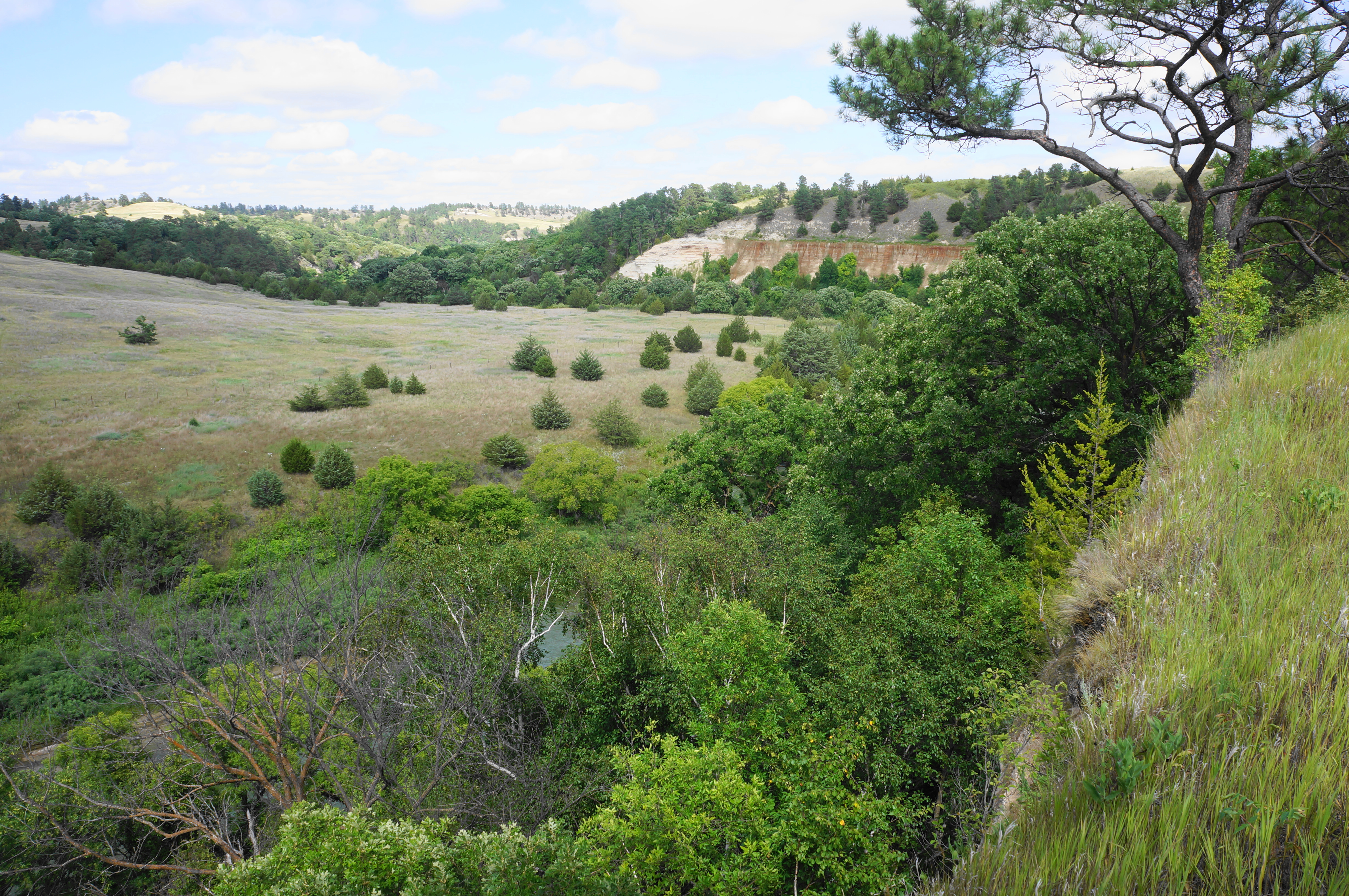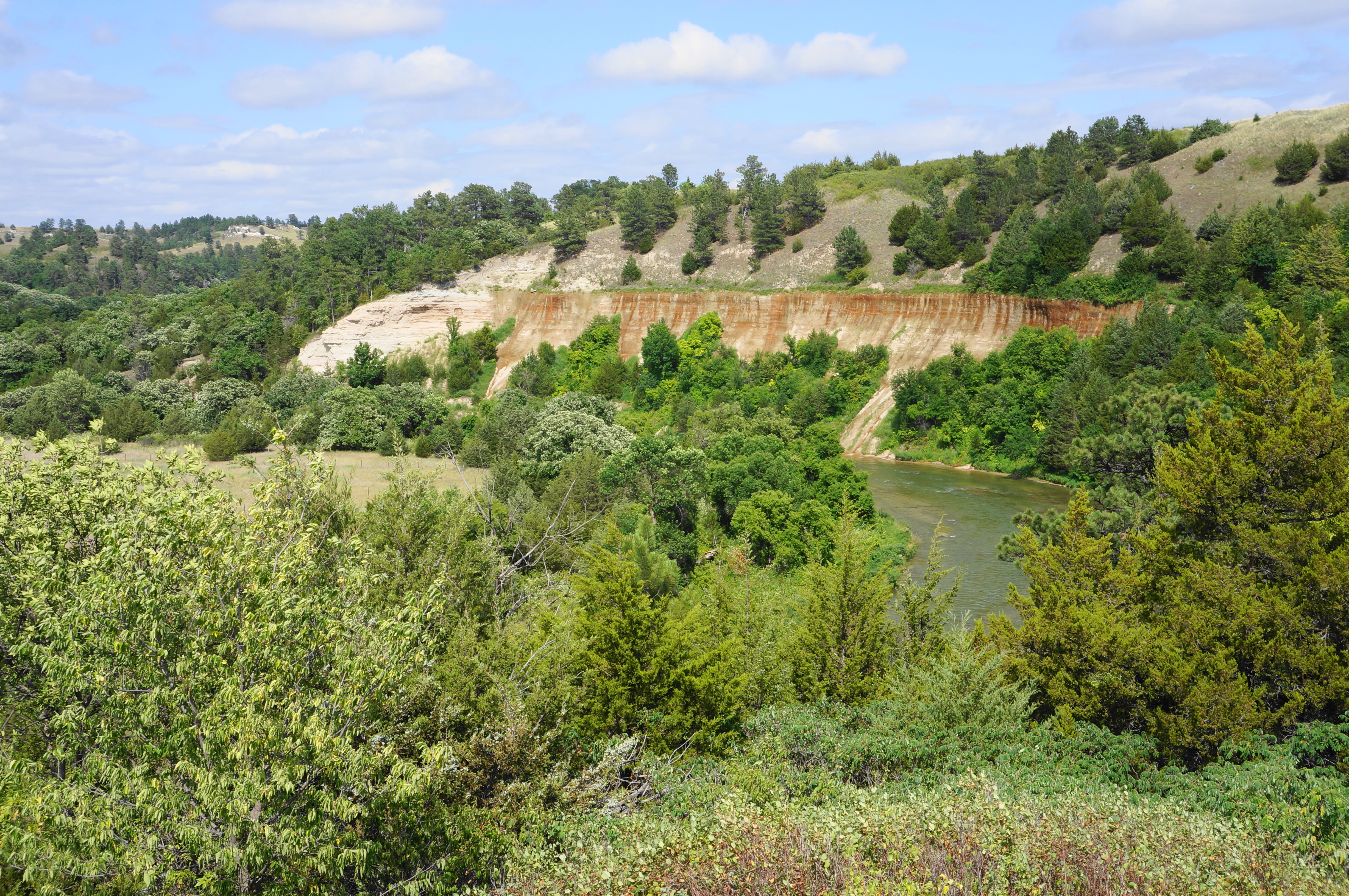 There are two trailheads for accessing the Fort Falls Trail, although the more popular is the Upper Fort Falls Trailhead, situated at the end of a gravel track past the Wildlife Refuge Visitor Center. Park at the lot along the wide circle, where hikers immediately get a nice, expansive view across the Niobrara River drainage to the crumbly sandstone cliffs of the Valentine Formation. The Niobrara River has already flowed more than half its distance by this point, and the water flow improves as it continues downstream, past Smith Falls, to its confluence with the Missouri River in northeast Nebraska.