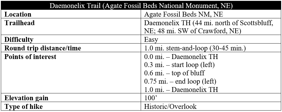 From here the trail courses downhill again, passing the initial bluff on the right and returning to the start of the loop section. By now hikers have travelled about ¾ mile. Bear left here, retreading down the well-worn path, passing the sand dune outcrop on the left and returning to the parking area along River Road. All told, this easy trail with some mild ups and downs clocks in at about one mile, making for a 30-minute-to-an-hour adventure in Agate Fossil Beds.