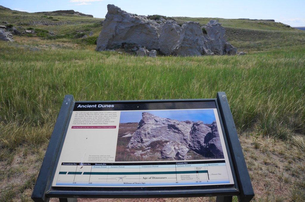 The Daemonelix Trail begins from the first pull-off on the left after entering Agate Fossil Beds National Monument on River Road. The parking lot includes several waysides highlighting nearby attractions in Nebraska, South Dakota, and Wyoming, as well as a map of the one-mile stem-and-loop trail. The easy, pebbled track begins by setting out northward toward the sandstone and limestone bluffs, passing under telephone lines and coming adjacent with a clutch of wavy stones on the right that are remnants of an ancient sand dune.