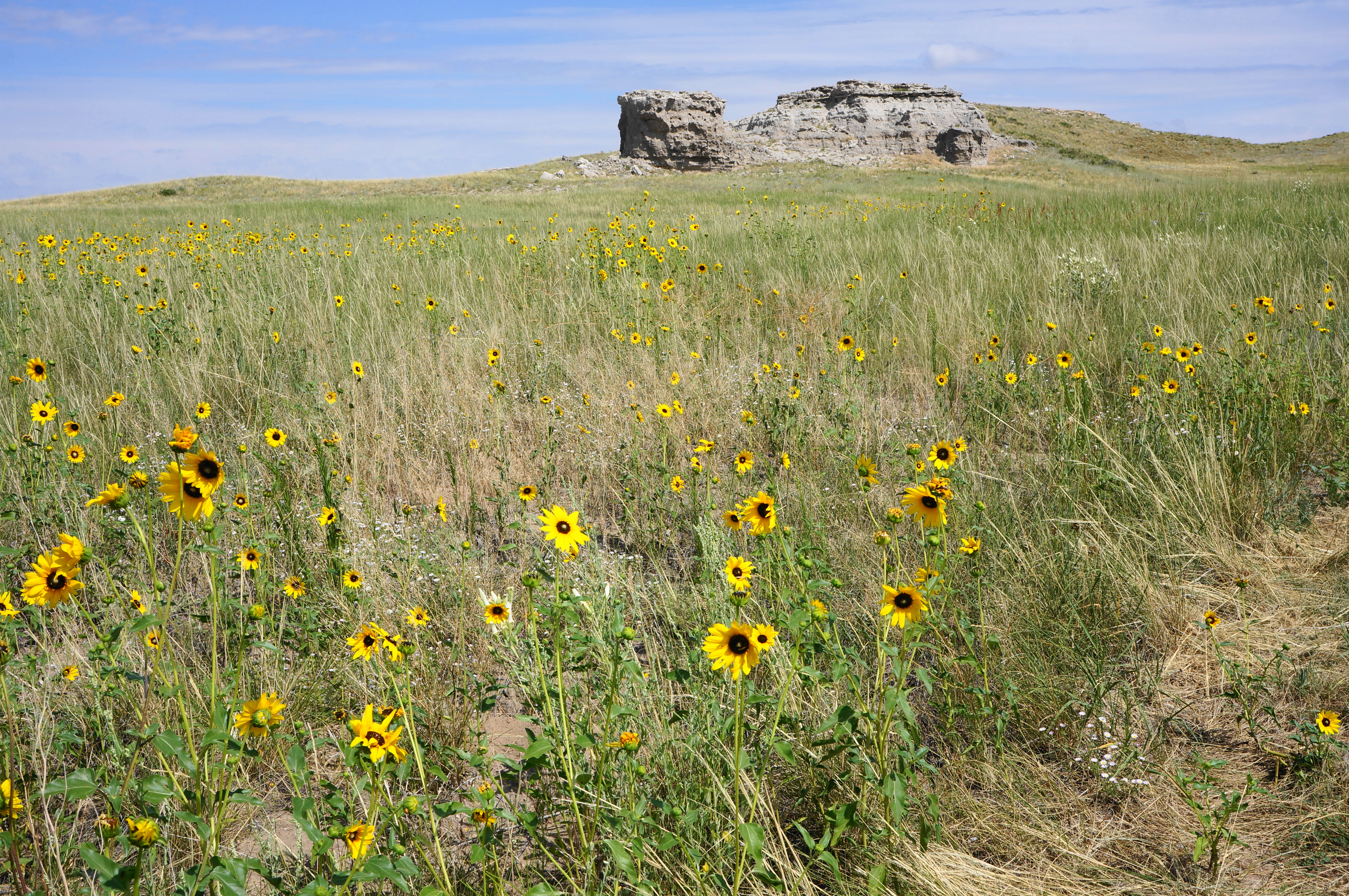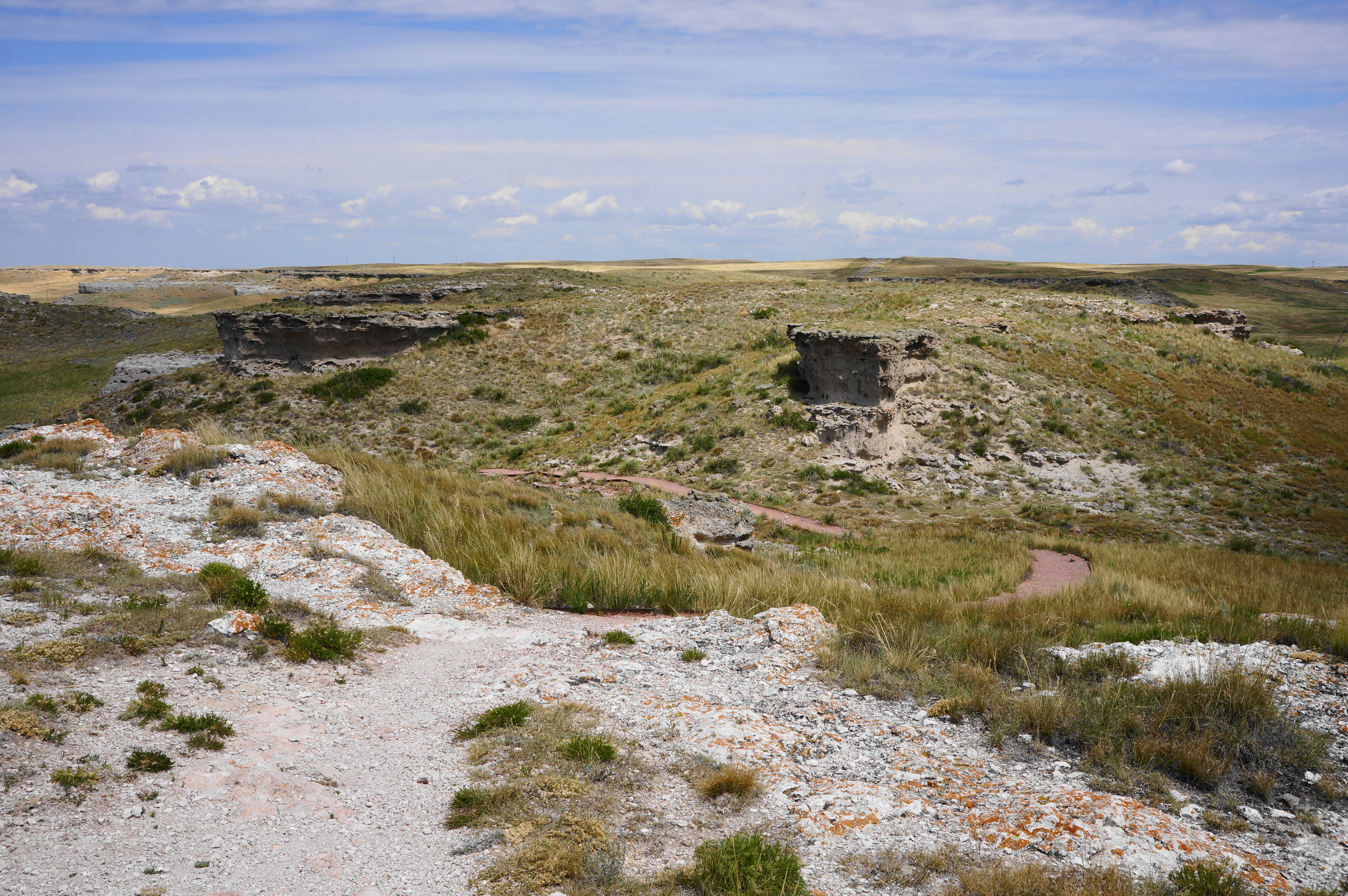From here the Daemonelix Trail climbs and wraps around a left-hand bend, with bluffs on the left and a gulch on the right. Indian ricegrass and yuccas dot the largely arid landscape. After a right-hand turn and the sharpest climb of the hike, the route crests a local summit. From here a panorama unfolds, with views east to Carnegie and University Hills, south to the Niobrara River and Agate Springs Ranch, and north in the direction of Pine Ridge and South Dakota. The overlook from atop this limestone perch is among the best in the park.