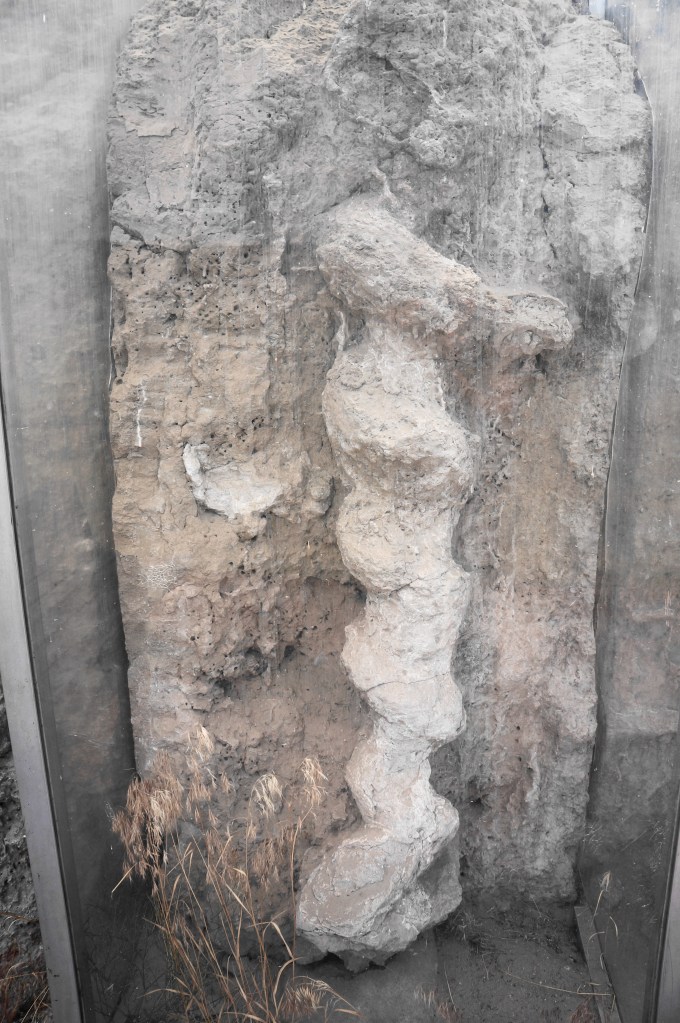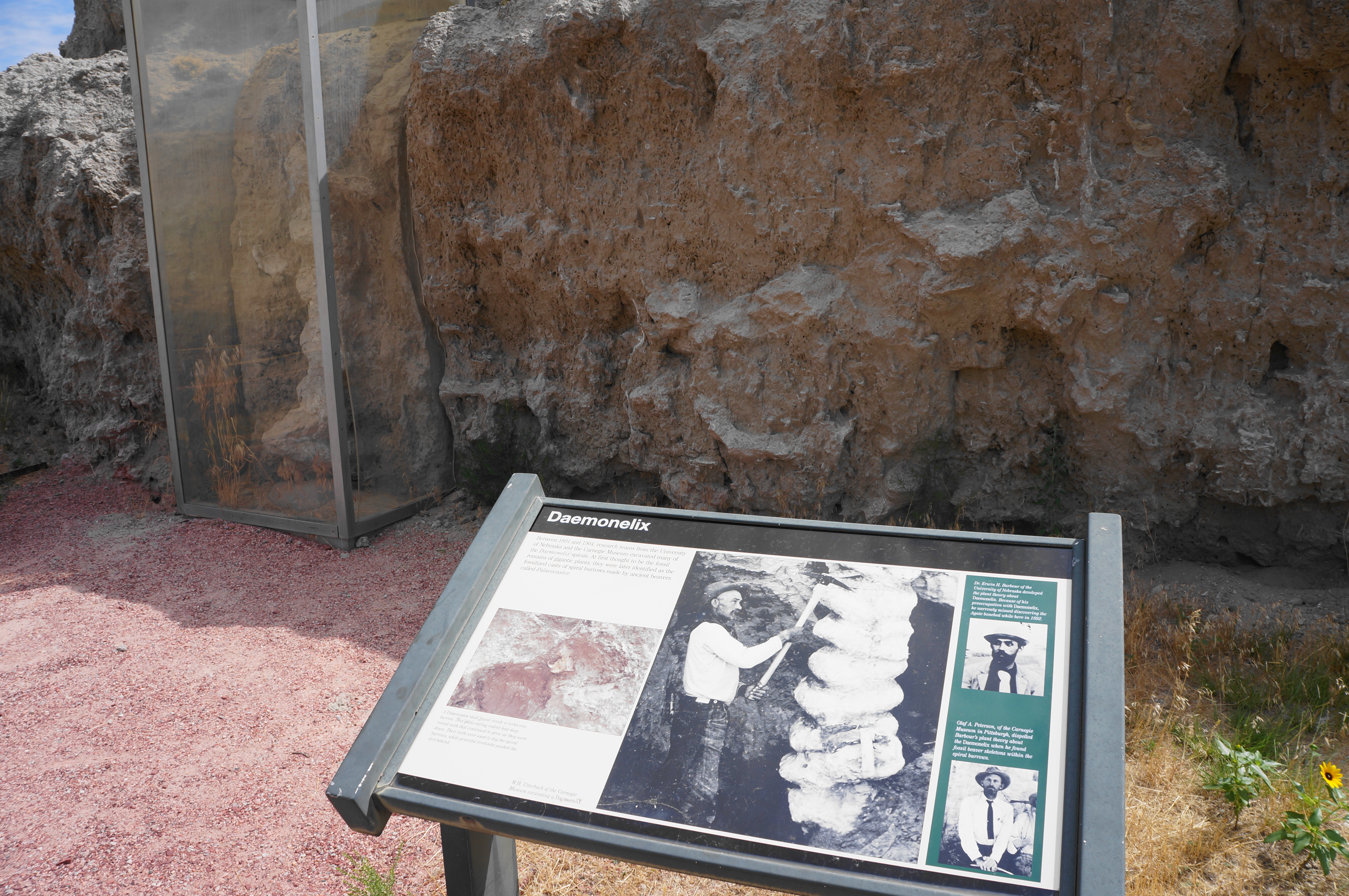 While the burrows from this wall have largely been removed, one can see a preserved corkscrew minutes later: here a clear case about the size of a telephone booth protects a fossilized Daemonelix some 4-5 feet tall. Many of these spirals were excavated by the Carnegie Museum in the late 19th century, years before the discovery of many larger mammal remains at nearby Carnegie Hill and University Hill.