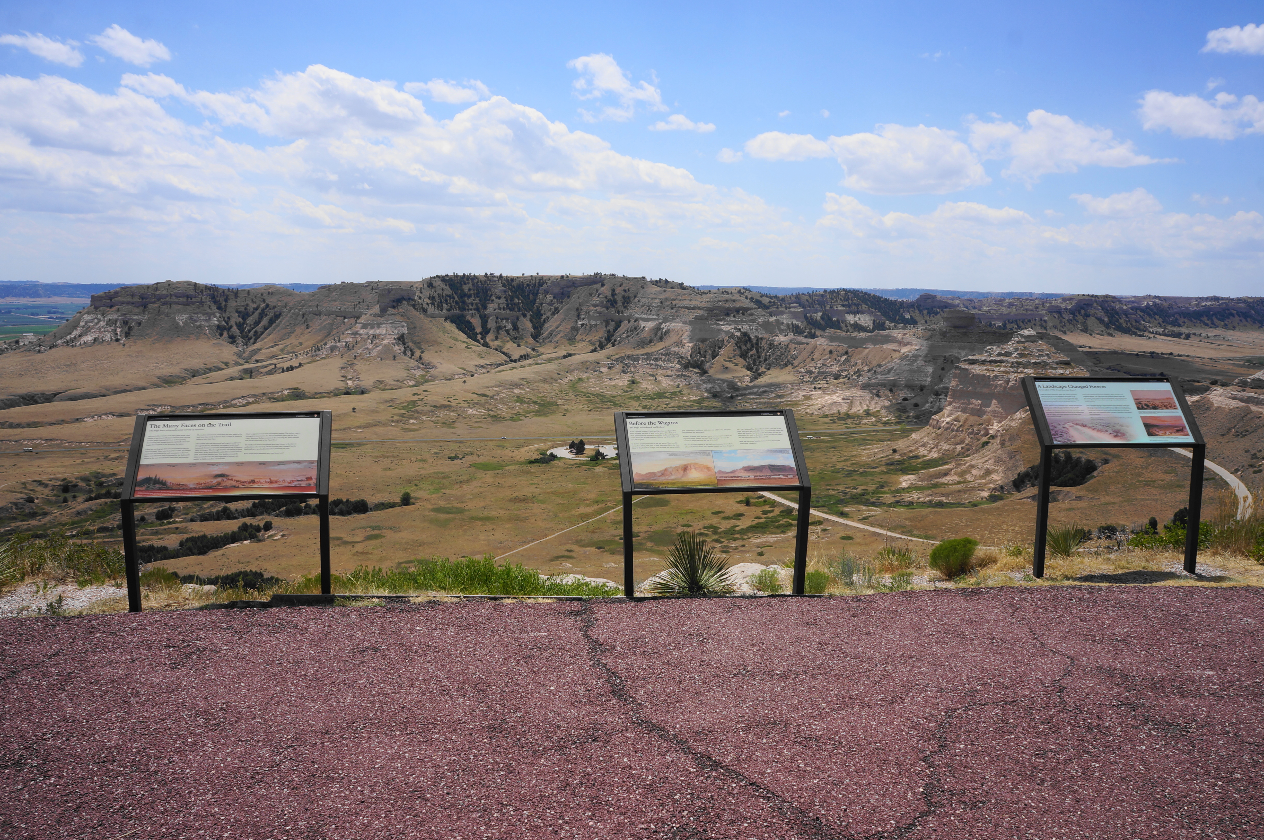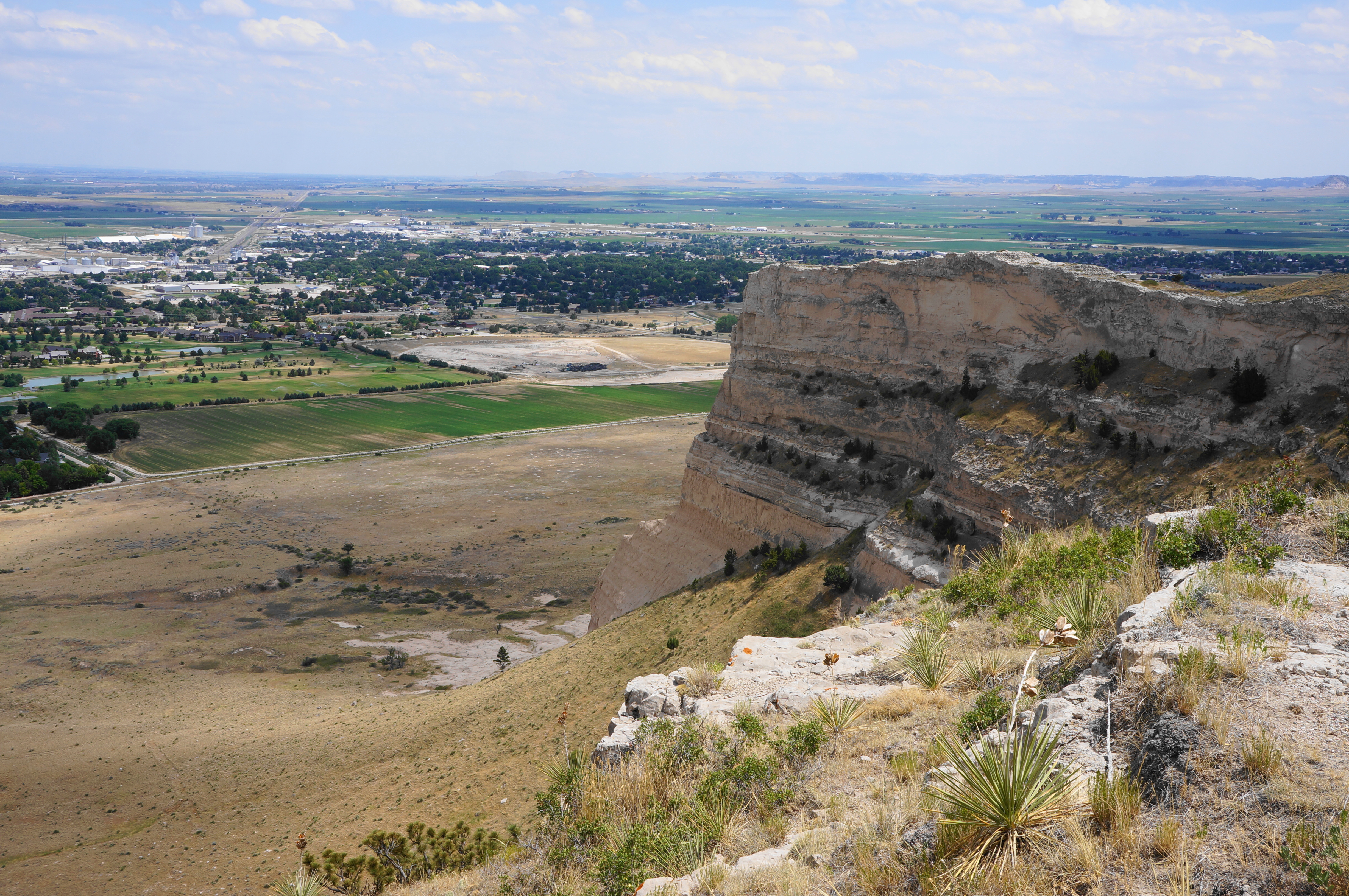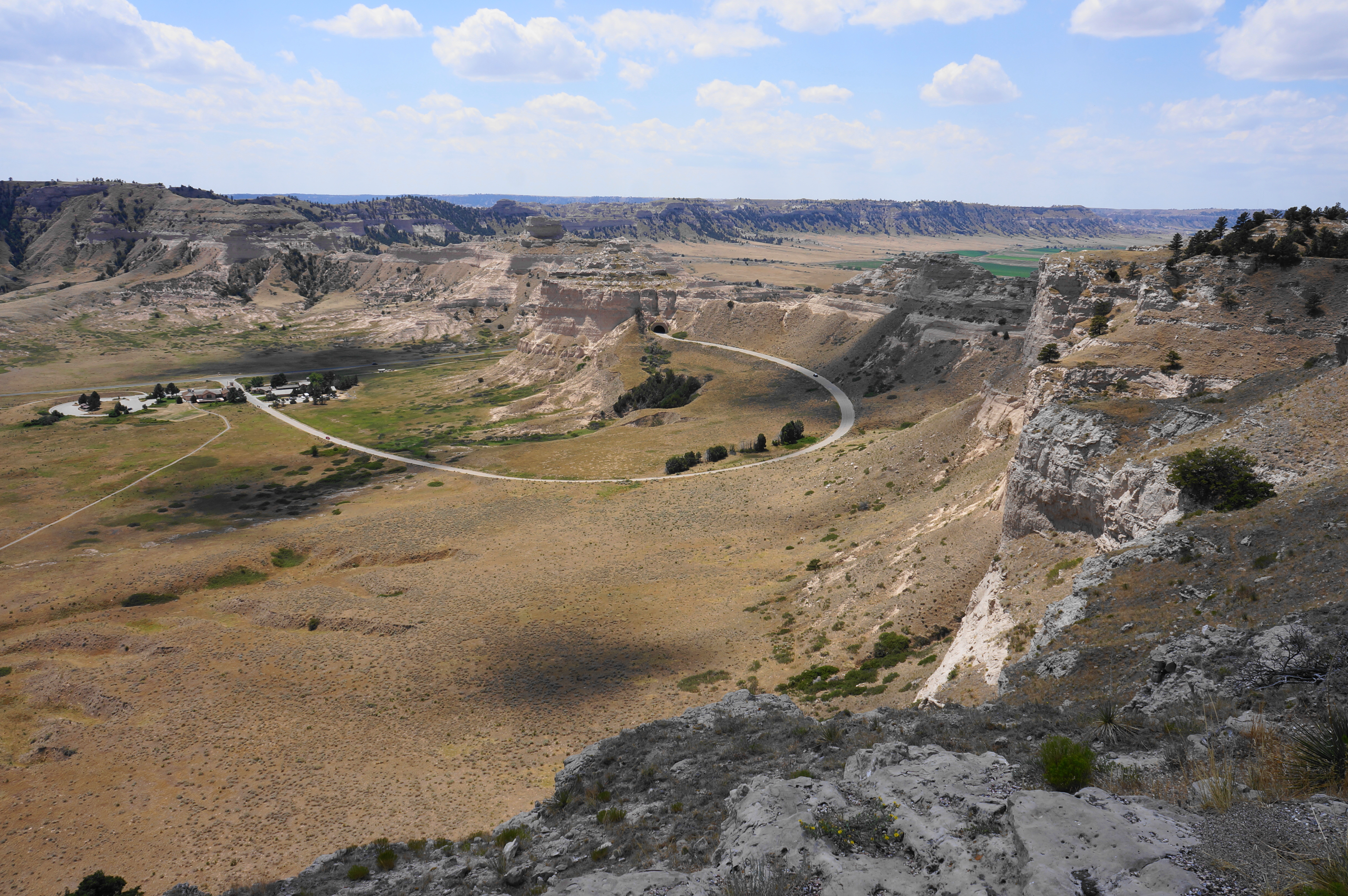 A key milestone along the Oregon and California historic trails, the chalky hightops of Scotts Bluff rise skyward above the broad Platte River Valley in western Nebraska. Here pioneers heading west along the North Platte had to detour south to evade some nasty badlands, bringing them up and over Mitchell Pass, wedged between the impressive towers of Scotts Bluff and South Bluff. Today the area is protected as Scotts Bluff National Monument, a 3,000-acre site that includes a scenic drive, several overlooks, and a small trail system. Panoramic views greet visitors at North and South Overlooks, and ambitious travelers can hike to and from the Visitor Center on the steep Saddle Rock Trail. Scotts Bluff is a must-visit for those passing through the Nebraska panhandle.