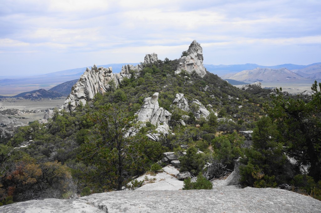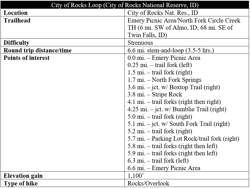 Idaho’s City of Rocks National Reserve—one of only two national reserves in the National Park system—protects a 14,000-acre tract that includes an extensive cluster of granitic formations known as the “Silent City of Rocks.” While the chalky white and grey spires are perhaps not as visually stunning as, say, the deep red rocks of southern Utah, it is easy to get lost in the enormity of this wonderland of granite, gneiss, schist, and quartzite, a rock climbers’ paradise and home to a robust hiking trail network. The 6.6-mile hike described below offers the “grand tour” of the main concentration of rocks in the center of this remote park, situated in the lonely Basin and Range of southern Idaho, near the Utah border. The strenuous City of Rocks Loop ascends to heights of over 7,200 feet, well above the playground of rocks, but then descends to the open plains below the granitic structures before rising again, passing several climbing pitches, back to the start.